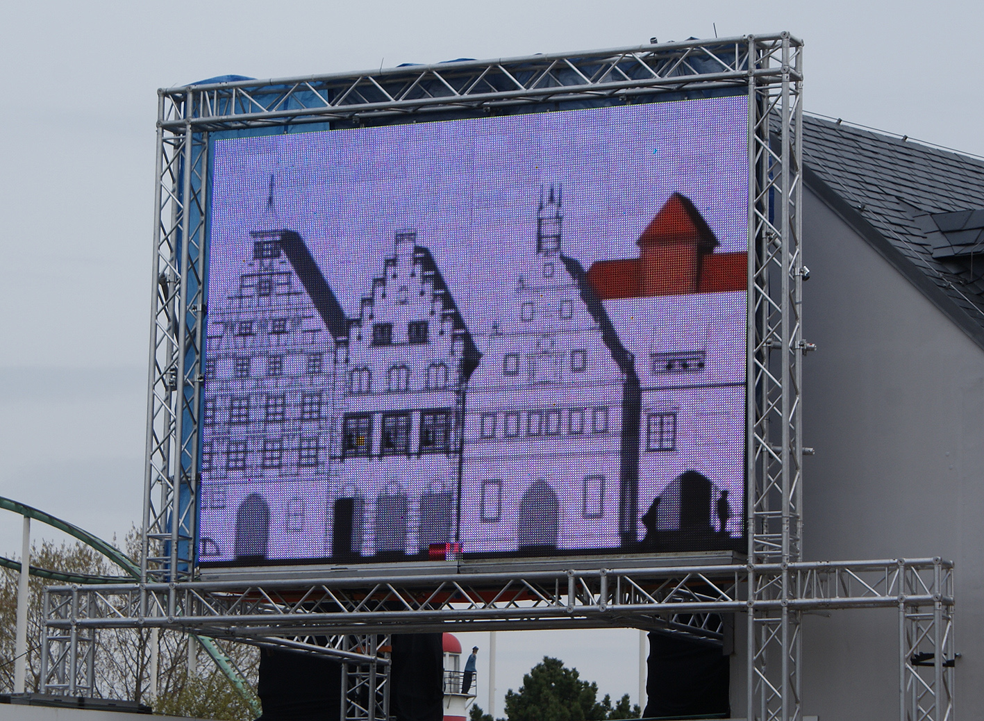 Nach einem kurzen Interview mit beiden Gästen kam es zu dem für uns wohl interesantesten Teil: Was gibt es nächstes Jahr neues? In den nächsten Jahren wird der Bau der Themenwelt weiter voranschreiten. 2013 wird laut Hansa-Park Geschäftsführer Leicht der Kassenbereich auf der linken Seite thematisiert werden und der vordere Eingangsbereich komplett fertiggestellt. Für ankommende Parkbesucher ergibt sich somit ein völlig neues Bild. Passend dazu lief auf der Leinwand eine Animation mit den neuen Gebäuden. Unter anderem werden dort Fassaden aus Frankfurt und Nürnberg realisiert werden.