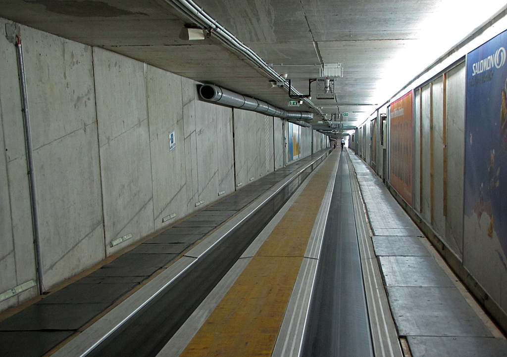 Nicht gerade gemütlich, aber praktisch: Die zwei langen Laufbänder, die Tal- und Bergstation verbinden.