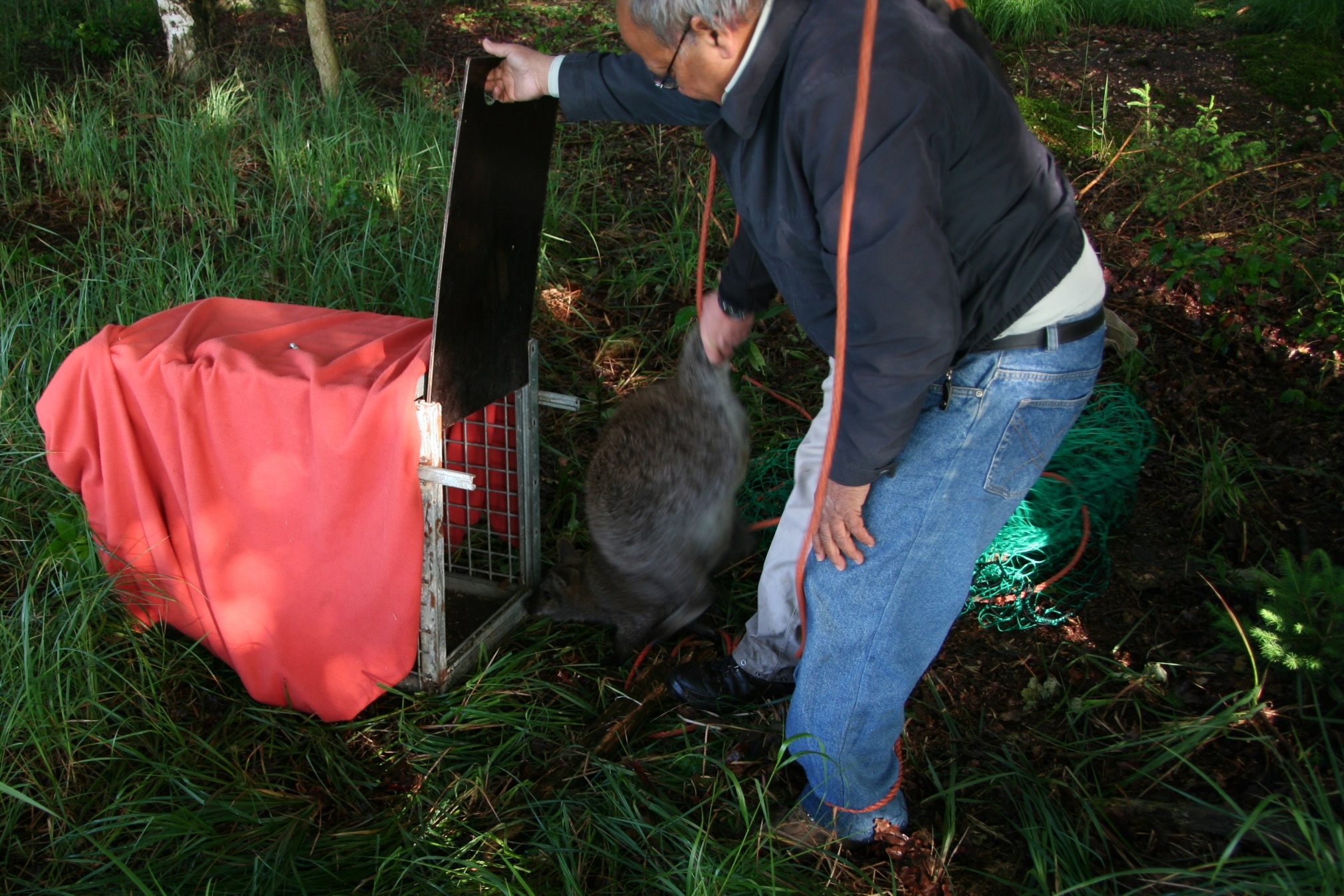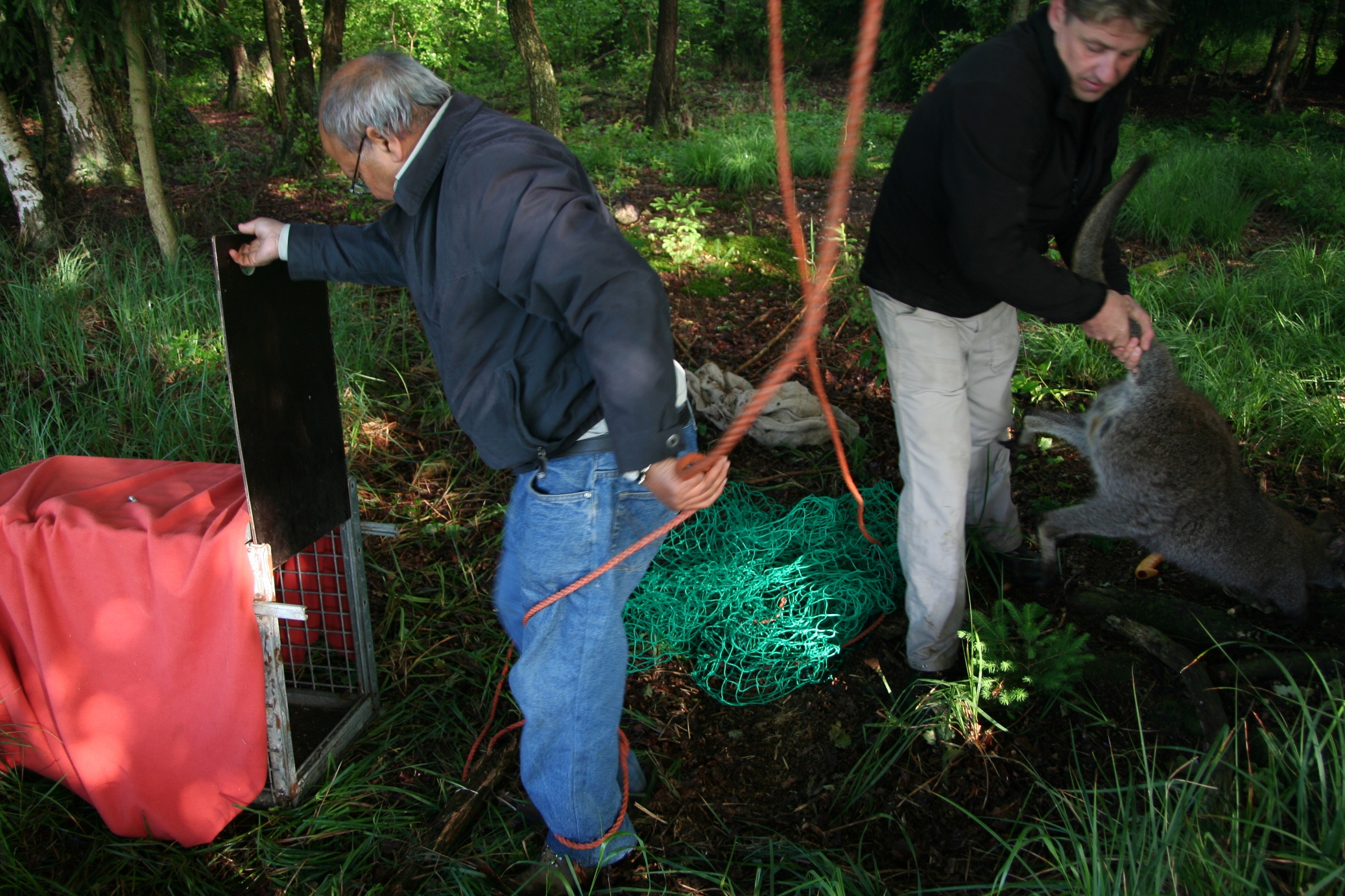 Bereits Ende letzter Woche wurde der große Fangkäfig aus Metall zurück in den Park geholt. Bisher konnte damit kein Tier gefangen werden. Der erfahrene Tierpfleger Hamed Hamza hatte am Freitag eine neue Fangvorrichtung mit einem Netz konstruiert und damit konnte Urmel heute gefangen werden.