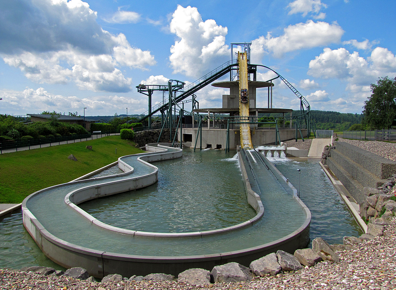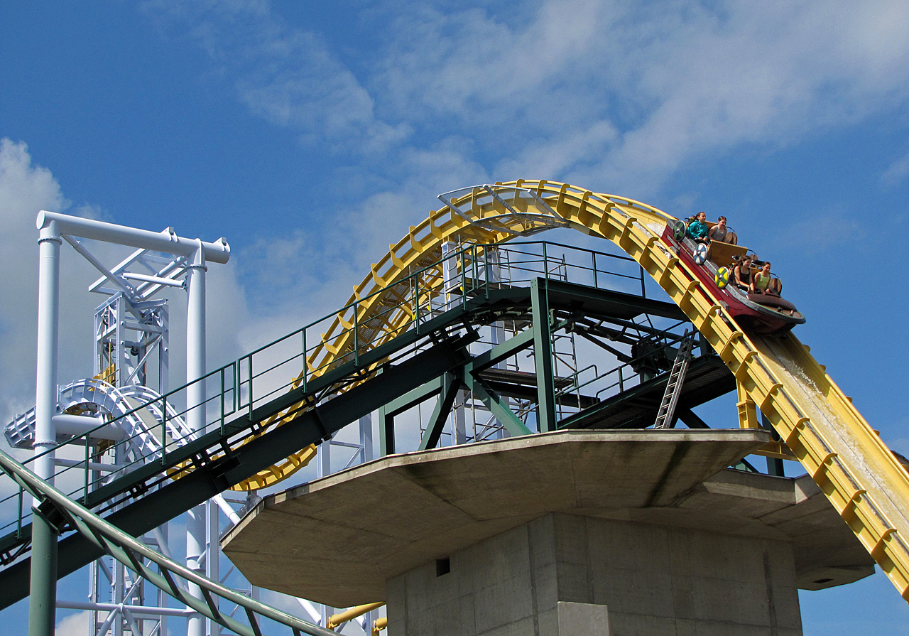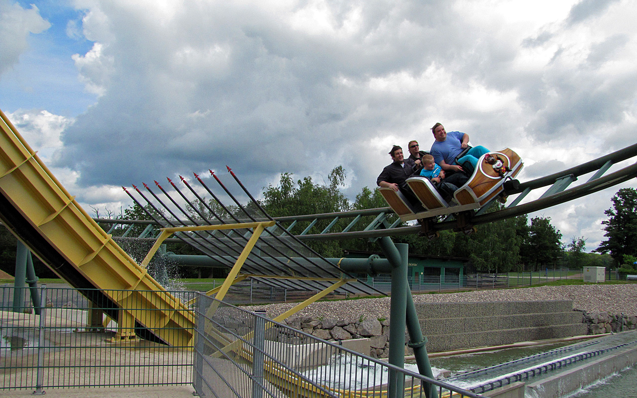 Auf dem oberen Bild sieht man deutlich, warum sie nicht so wirklich bei mir ankommt. Nach dem Lift durchfährt das Boot eine erste "Kuhle", um dann den Sturz anzutreten. Allerdings will der nicht richtig zünden, da das Boot vor dem Fall gebremst wird. Und nicht zu wenig - Man merkt es deutlich. Vom angeblich höchsten/steilsten (what ever?!) und schnellsten Sturz einer Wildwasserbahn habe ich nicht viel gemerkt. Aber ist vielleicht auch Ansichtssache. Die Bremse nervt aber übelst, zumal das Boot nach der ersten Kuhle nicht wirklich Fahrt aufgenommen hat.