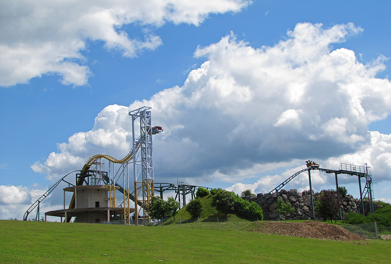 Zumindest kann man aber erkennen, was es in Zukunft werden soll. Aus dem Vulkan ist nun ein Schloss bzw. eine Burg geworden. Bin ja mal gespannt, wann der endgültige Stand erreicht wird. Der Park scheint sich da wohl etwas zu übernommen haben. Aber das soll nicht negativ gemeint sein. Schließlich ist es fast ein Wunder, dass so ein kleiner Park überhaupt solch große Attraktionen baut. Und mutig ist es auch. Wir sahen das nicht so eng. Aber von vielen anderen Besuchern konnte man vernehmen, dass der unfertige Zustand (der sich schon auffällt. Auch "da ist denen wohl das Geld ausgegangen" fiel.