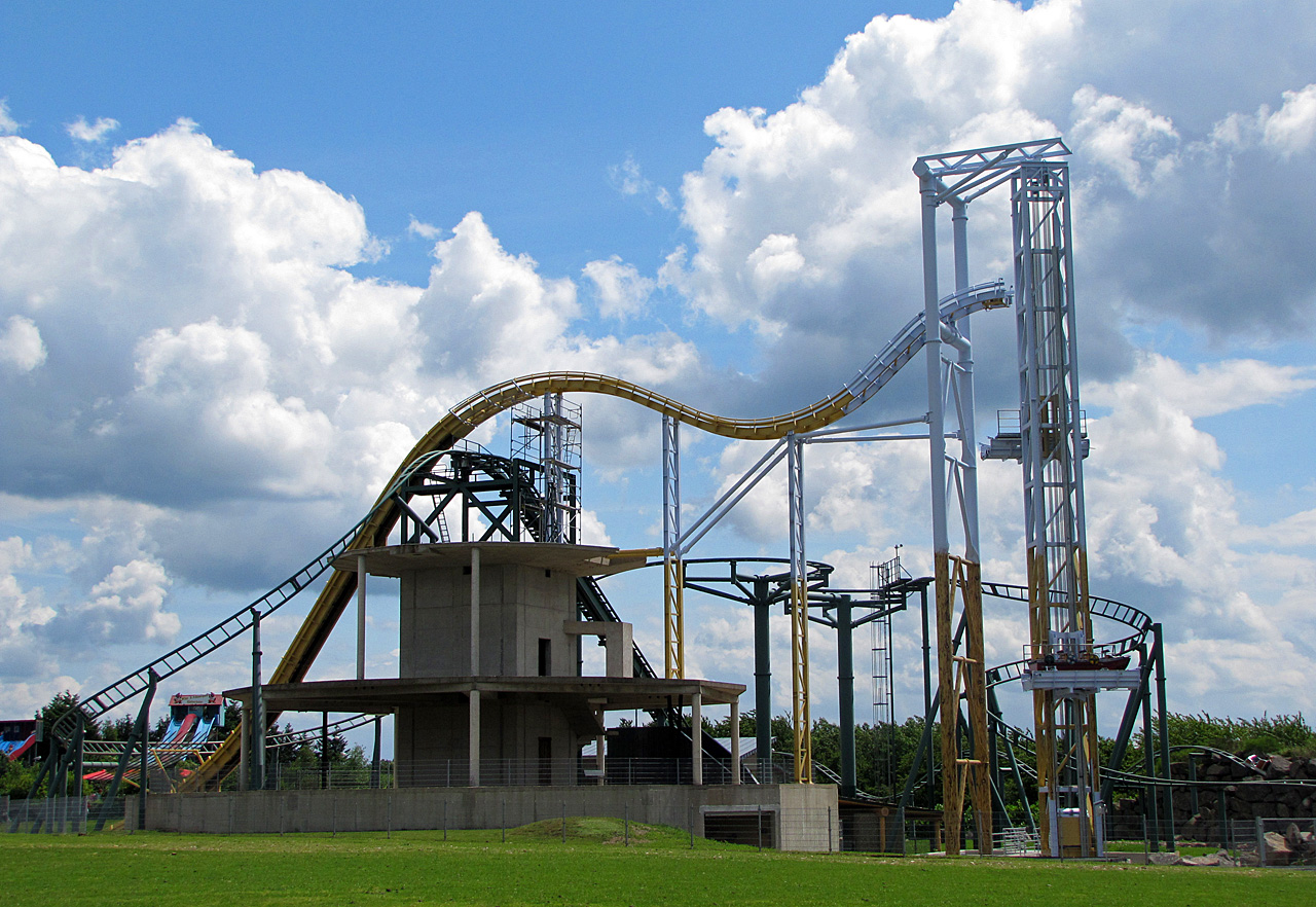 Blick auf die Achterbahn "Die heiße Fahrt" und die neue Wasserbahn "Rittersturz".