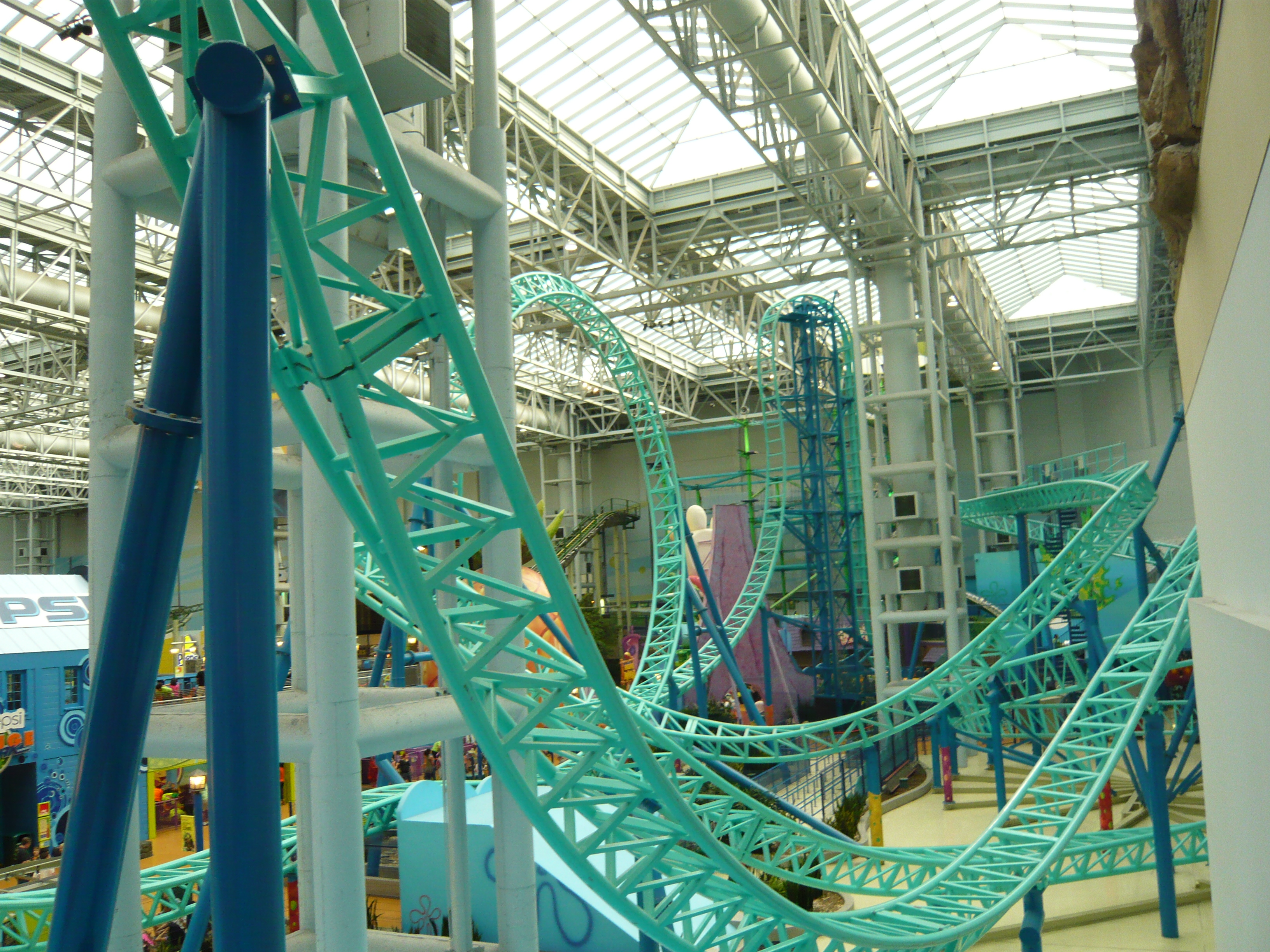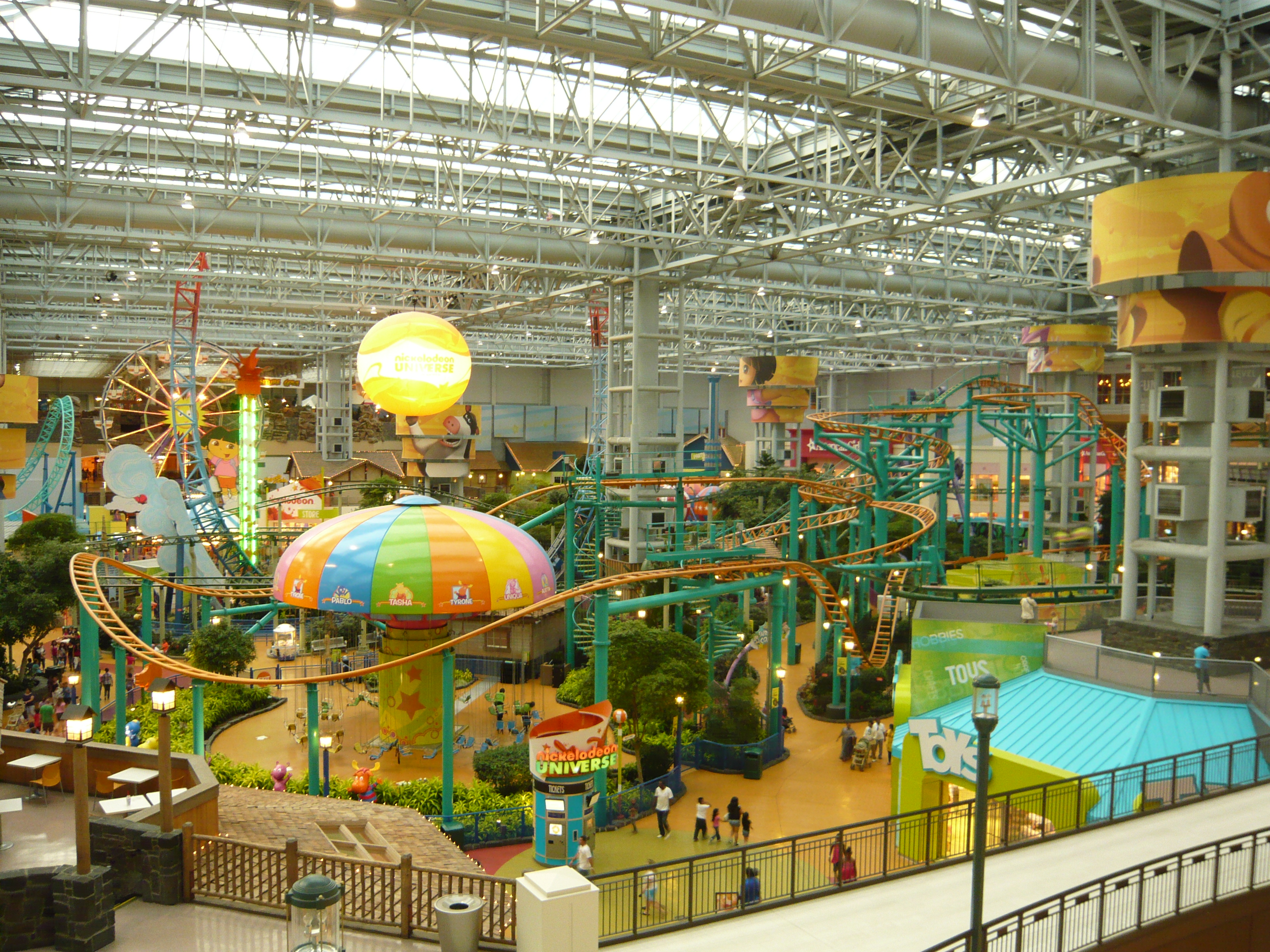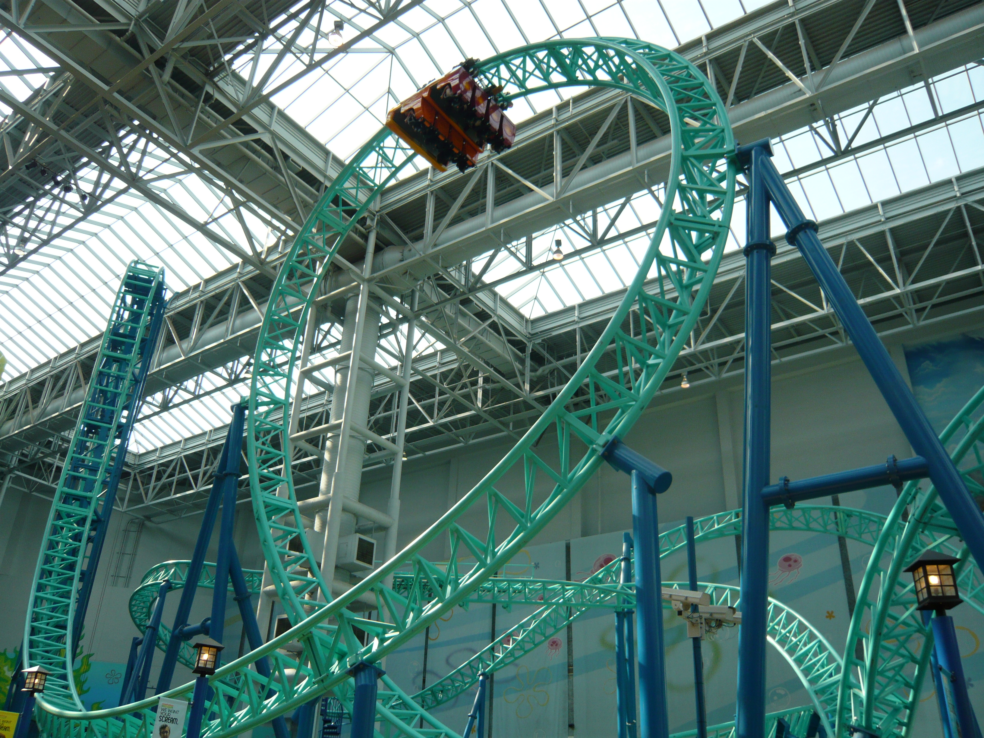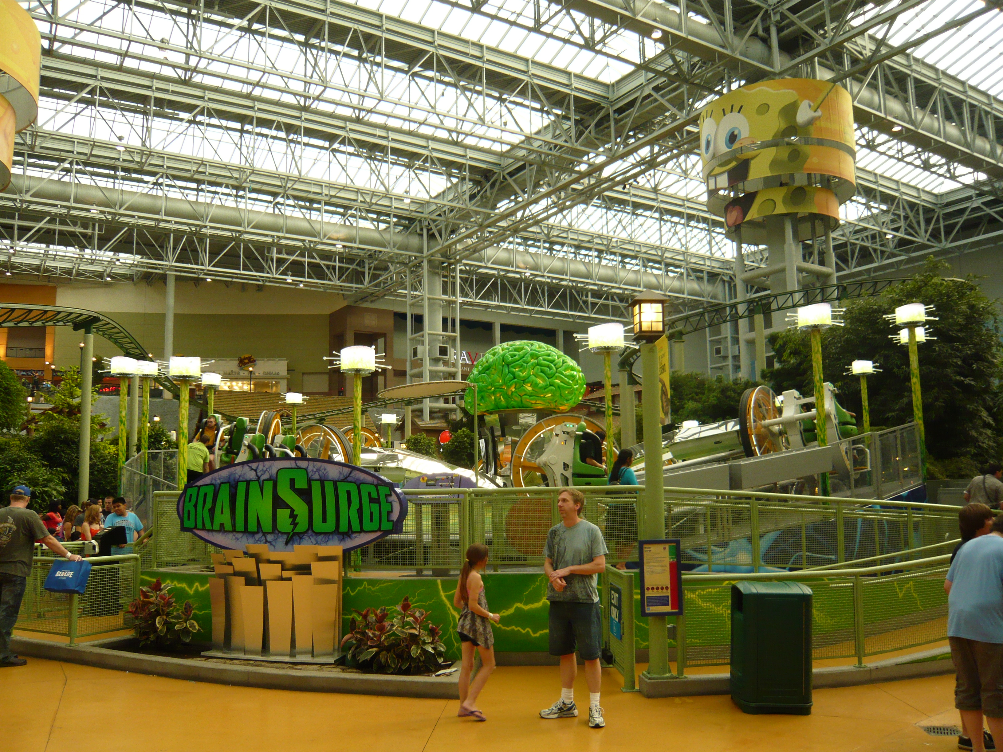 Den Anfang dieser Berichtserie macht nun also das Nickelodeon Universe, der Indoor-Vergnügungspark im Innenhof der wirklich gigantischen Mall of America im Süden von Minneapolis. Um sich einen Begriff von den gigantischen Dimensionen machen zu können, mit denen man es hier zu tun hat: Dieser aus der Luftperspektive betrachtet in etwa quadratische Megabau hat eine Gesamtverkaufsfläche von unglaublichen 230'000 Quadratmetern, an jeder Seite mehrstöckige Parkhäuser mit insgesamt mehr als 20'000 Gratis-Parkplätzen, mehrere Food Courts, ein Multiplex-Kino mit 14 Sälen, eine Minigolfanlage, ein Aquarium... Und was das Shopping-Angebot anbelangt: alleine bei Macy's, Sears, Nordstrom und Bloomingdales, den vier "Anchor Stores" (das sind Filialen grosser und bekannter Warenhaus-Ketten, die das Publikum in die Mall locken sollen) findet man auf riiiesigen mehrstöckigen Ablegern schon so ziemlich alles, was man sich auch nur annähernd an Non-Food-Konsumgütern vorstellen kann. Und trotzdem gibt es noch über 500 weitere Geschäfte! Für uns fast nicht vorstellbare Verhältnisse! Aber vielleicht ist ja diese Anekdote dafür noch aufschlussreich: Da ich den Fokus ja hauptsächlich auf den Vergnügungspark gelegt habe und die Souvenirjagd aus nachvollziehbaren Gründen erst am Ende der langen Reise in Angriff nahm, machte ich nach erst Parkschluss einen Rundgang durch die Mall - bei dann auch schon geschlossenen Geschäften. Selbst in zackigem Marschtempo, mit niemandem im Weg und keinen lockenden Schaufenstern und Fassaden dauert ein kompletter Rundgang eine volle Viertelstunde, mit kurzen Fotostopps gar 20 Minuten. Der absolute Wahnsinn!
