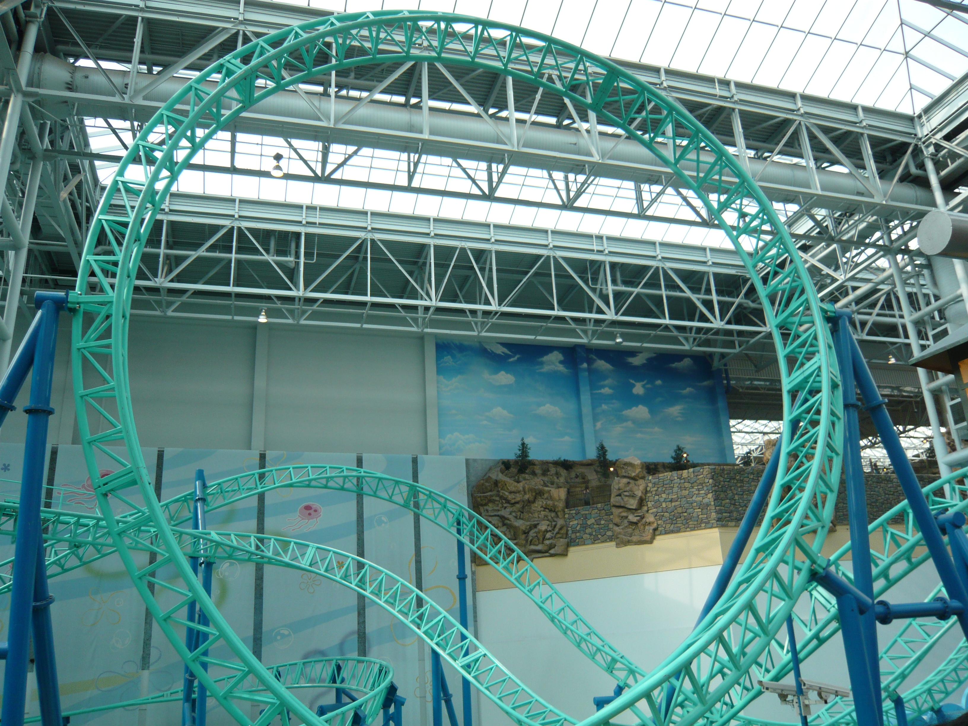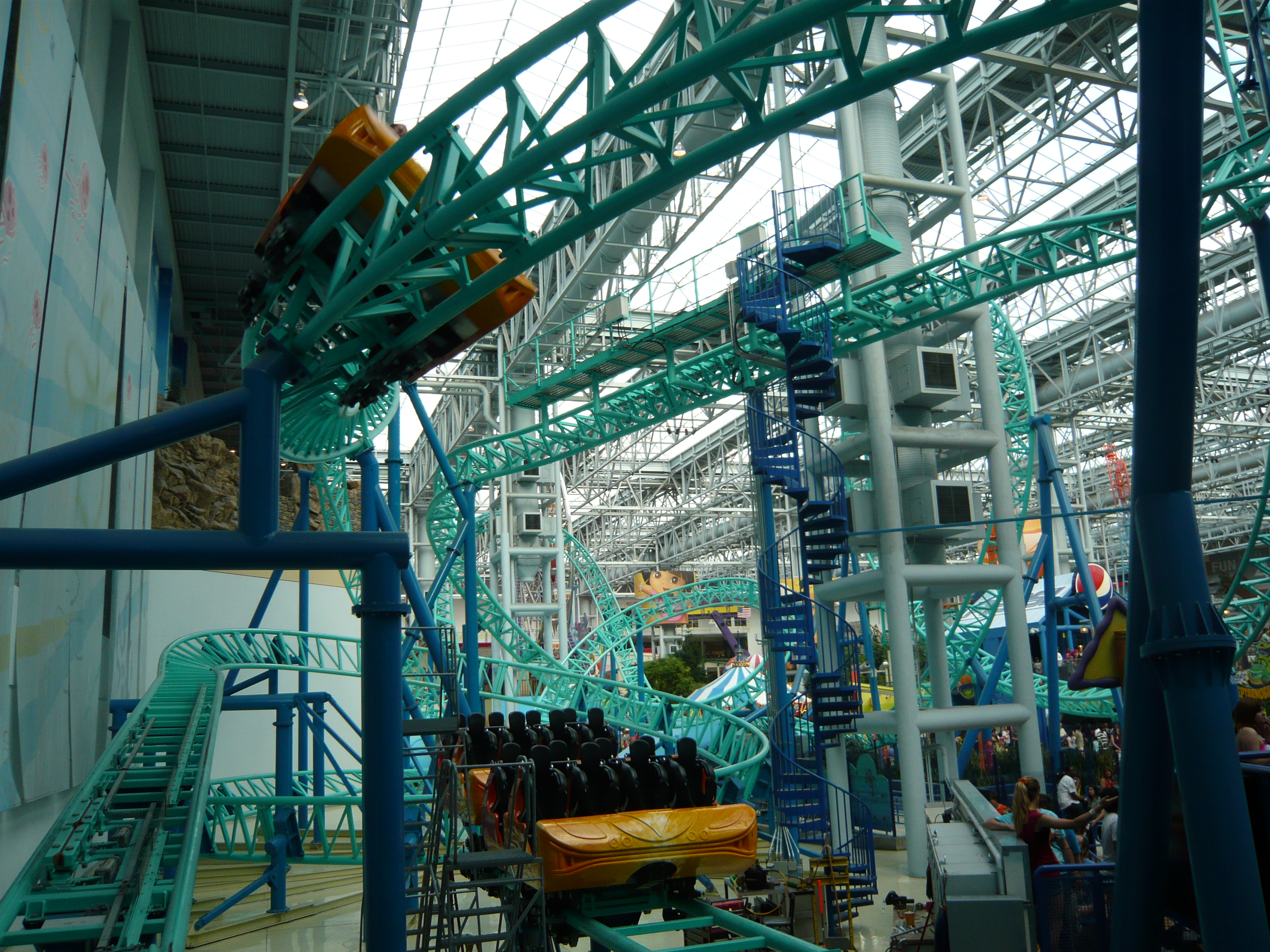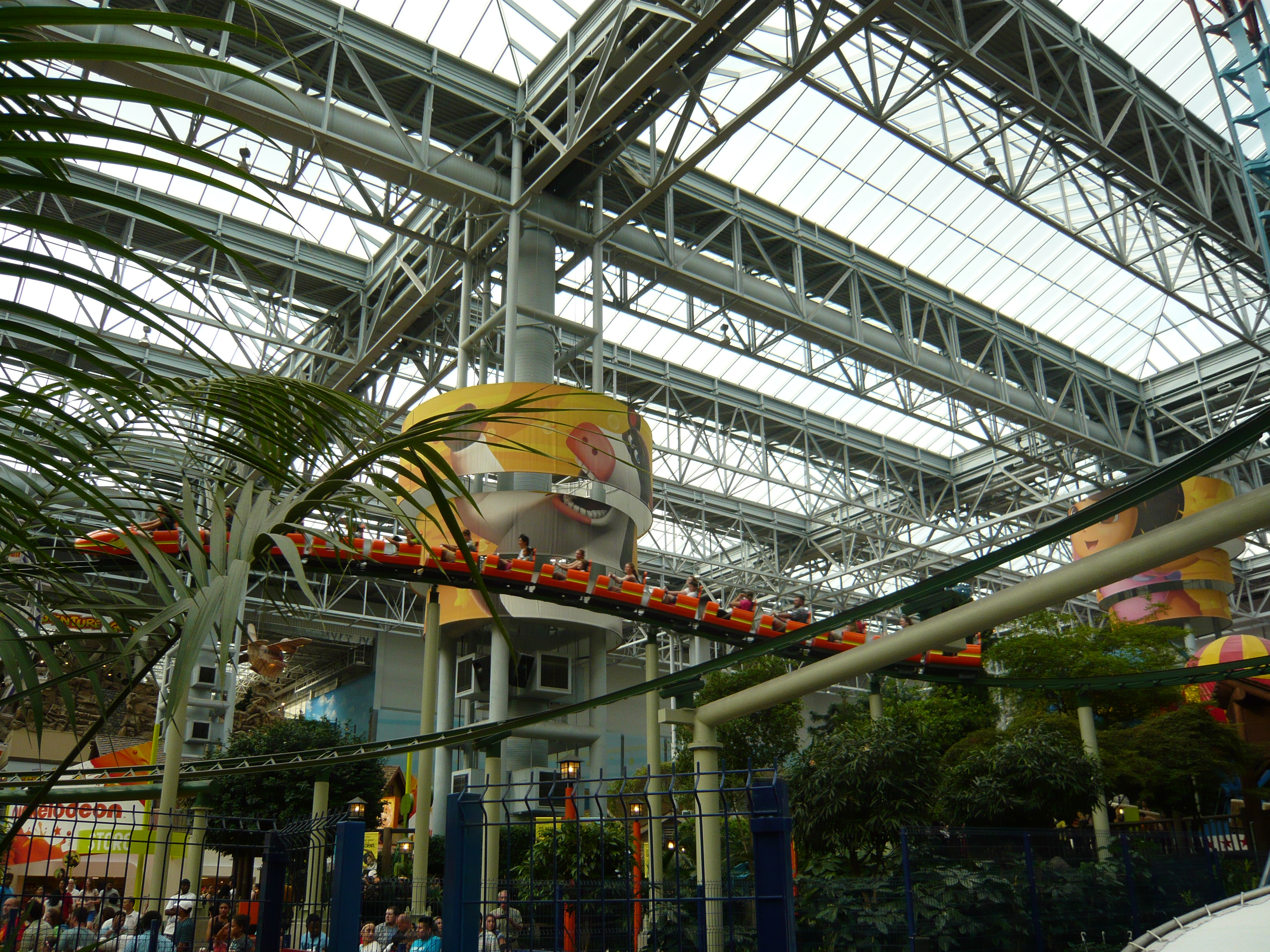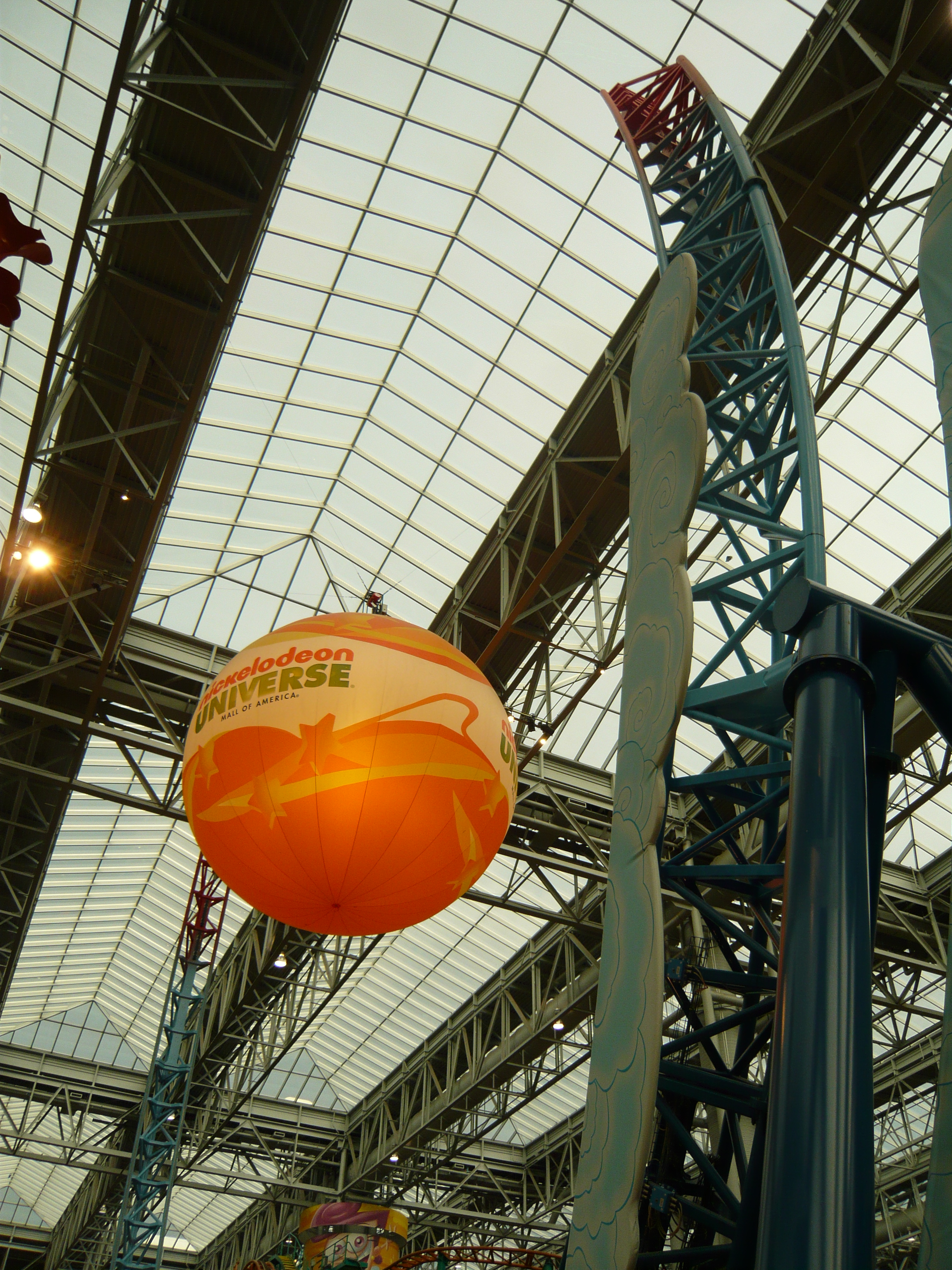 Den Anfang dieser Berichtserie macht nun also das Nickelodeon Universe, der Indoor-Vergnügungspark im Innenhof der wirklich gigantischen Mall of America im Süden von Minneapolis. Um sich einen Begriff von den gigantischen Dimensionen machen zu können, mit denen man es hier zu tun hat: Dieser aus der Luftperspektive betrachtet in etwa quadratische Megabau hat eine Gesamtverkaufsfläche von unglaublichen 230'000 Quadratmetern, an jeder Seite mehrstöckige Parkhäuser mit insgesamt mehr als 20'000 Gratis-Parkplätzen, mehrere Food Courts, ein Multiplex-Kino mit 14 Sälen, eine Minigolfanlage, ein Aquarium... Und was das Shopping-Angebot anbelangt: alleine bei Macy's, Sears, Nordstrom und Bloomingdales, den vier "Anchor Stores" (das sind Filialen grosser und bekannter Warenhaus-Ketten, die das Publikum in die Mall locken sollen) findet man auf riiiesigen mehrstöckigen Ablegern schon so ziemlich alles, was man sich auch nur annähernd an Non-Food-Konsumgütern vorstellen kann. Und trotzdem gibt es noch über 500 weitere Geschäfte! Für uns fast nicht vorstellbare Verhältnisse! Aber vielleicht ist ja diese Anekdote dafür noch aufschlussreich: Da ich den Fokus ja hauptsächlich auf den Vergnügungspark gelegt habe und die Souvenirjagd aus nachvollziehbaren Gründen erst am Ende der langen Reise in Angriff nahm, machte ich nach erst Parkschluss einen Rundgang durch die Mall - bei dann auch schon geschlossenen Geschäften. Selbst in zackigem Marschtempo, mit niemandem im Weg und keinen lockenden Schaufenstern und Fassaden dauert ein kompletter Rundgang eine volle Viertelstunde, mit kurzen Fotostopps gar 20 Minuten. Der absolute Wahnsinn!
