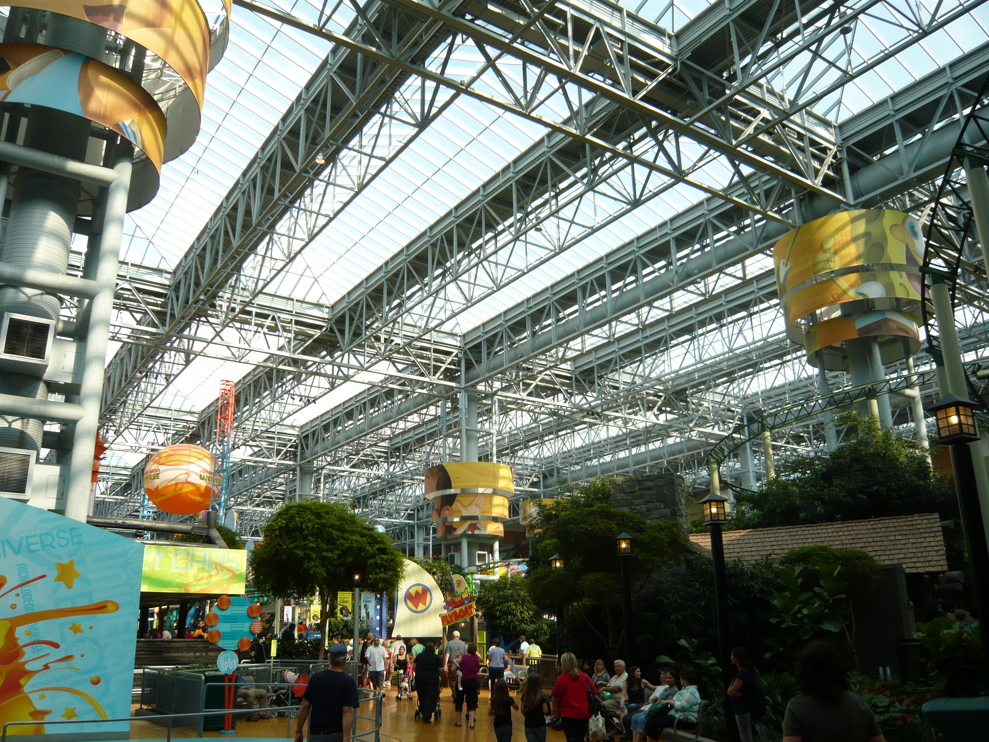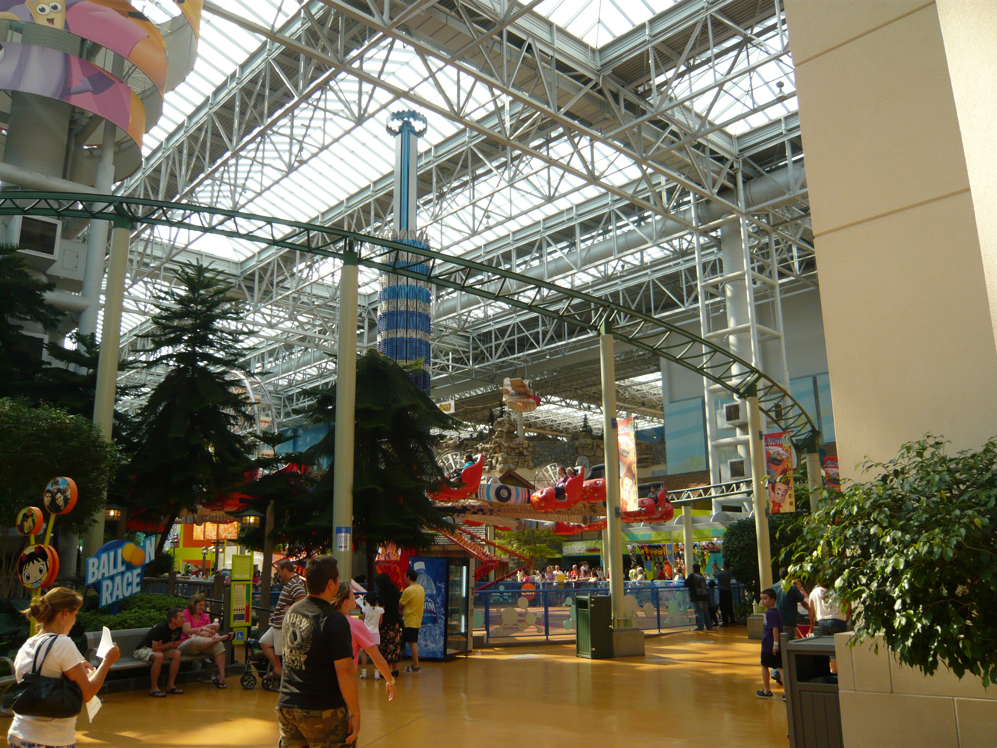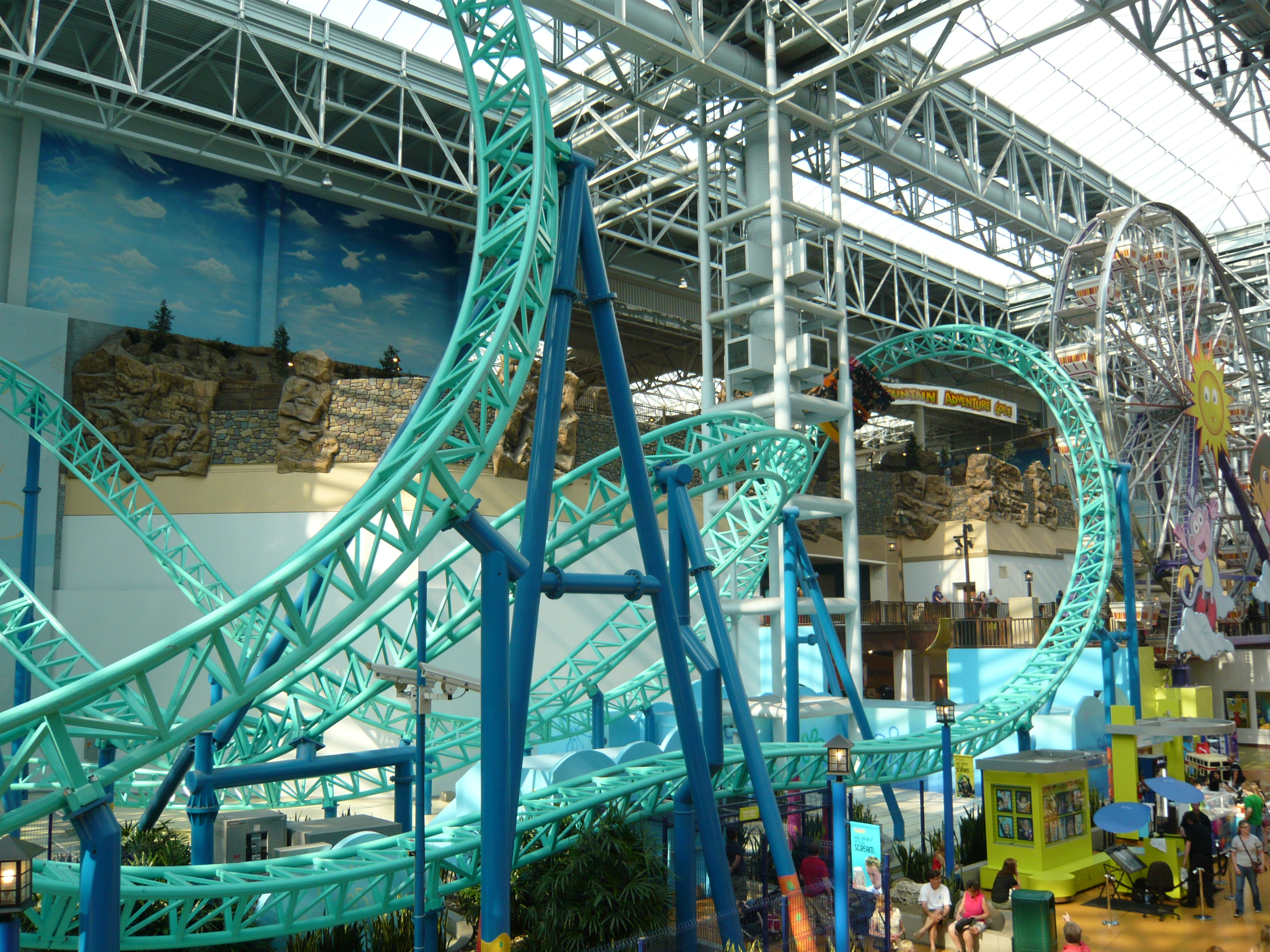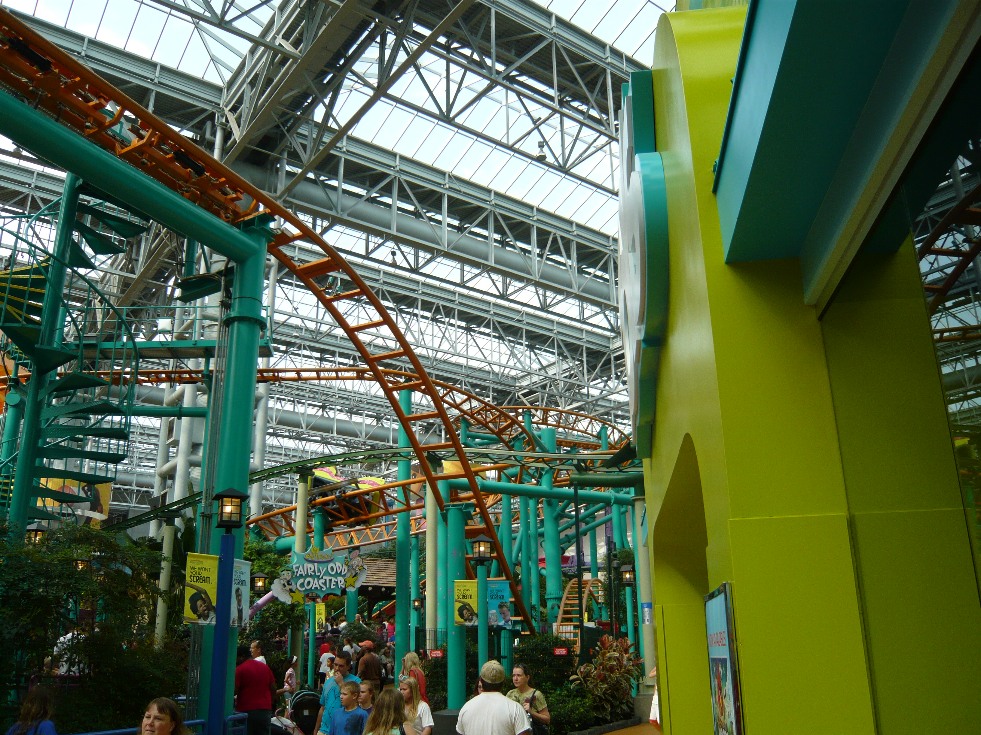 Den Anfang dieser Berichtserie macht nun also das Nickelodeon Universe, der Indoor-Vergnügungspark im Innenhof der wirklich gigantischen Mall of America im Süden von Minneapolis. Um sich einen Begriff von den gigantischen Dimensionen machen zu können, mit denen man es hier zu tun hat: Dieser aus der Luftperspektive betrachtet in etwa quadratische Megabau hat eine Gesamtverkaufsfläche von unglaublichen 230'000 Quadratmetern, an jeder Seite mehrstöckige Parkhäuser mit insgesamt mehr als 20'000 Gratis-Parkplätzen, mehrere Food Courts, ein Multiplex-Kino mit 14 Sälen, eine Minigolfanlage, ein Aquarium... Und was das Shopping-Angebot anbelangt: alleine bei Macy's, Sears, Nordstrom und Bloomingdales, den vier "Anchor Stores" (das sind Filialen grosser und bekannter Warenhaus-Ketten, die das Publikum in die Mall locken sollen) findet man auf riiiesigen mehrstöckigen Ablegern schon so ziemlich alles, was man sich auch nur annähernd an Non-Food-Konsumgütern vorstellen kann. Und trotzdem gibt es noch über 500 weitere Geschäfte! Für uns fast nicht vorstellbare Verhältnisse! Aber vielleicht ist ja diese Anekdote dafür noch aufschlussreich: Da ich den Fokus ja hauptsächlich auf den Vergnügungspark gelegt habe und die Souvenirjagd aus nachvollziehbaren Gründen erst am Ende der langen Reise in Angriff nahm, machte ich nach erst Parkschluss einen Rundgang durch die Mall - bei dann auch schon geschlossenen Geschäften. Selbst in zackigem Marschtempo, mit niemandem im Weg und keinen lockenden Schaufenstern und Fassaden dauert ein kompletter Rundgang eine volle Viertelstunde, mit kurzen Fotostopps gar 20 Minuten. Der absolute Wahnsinn!