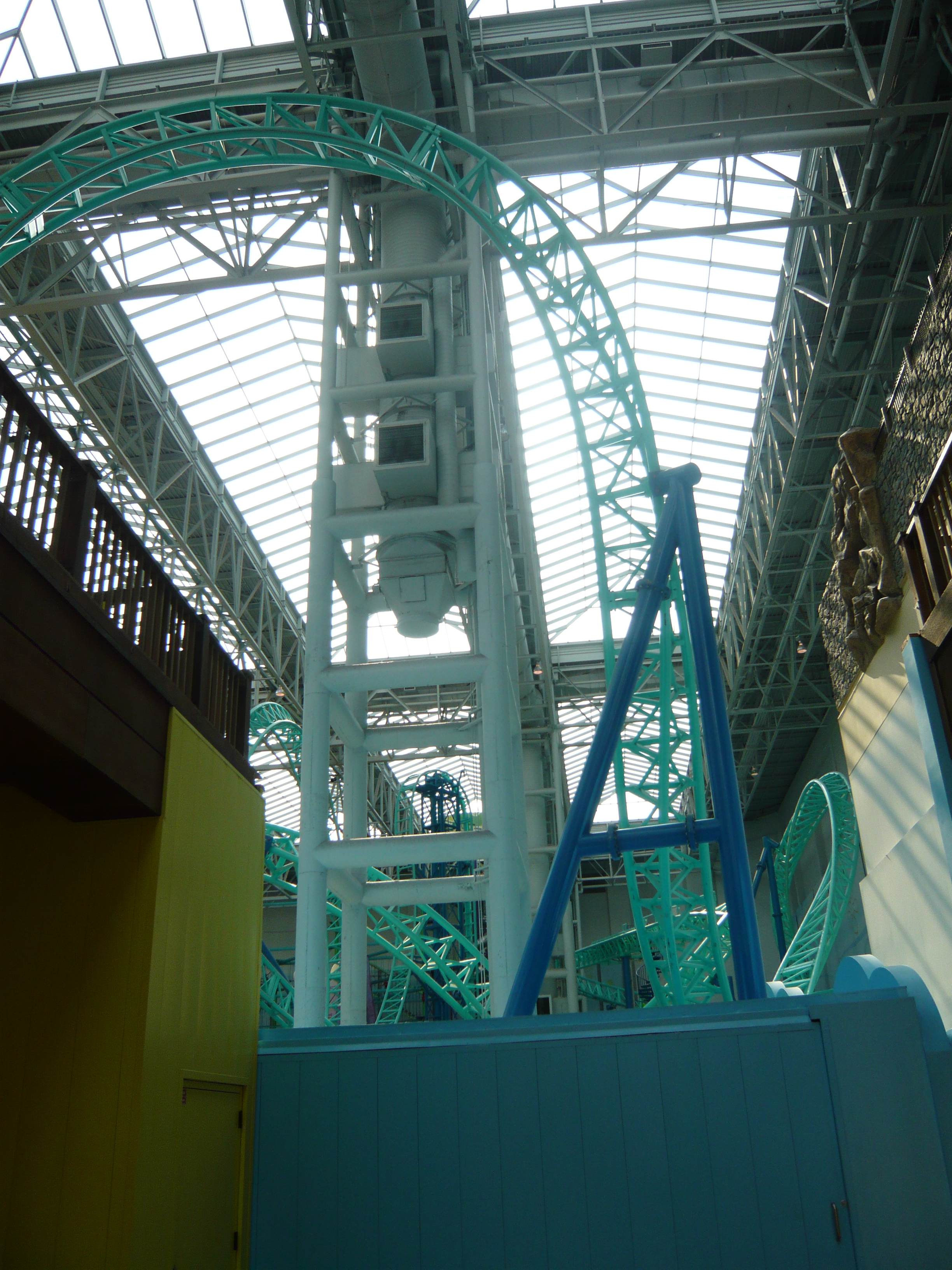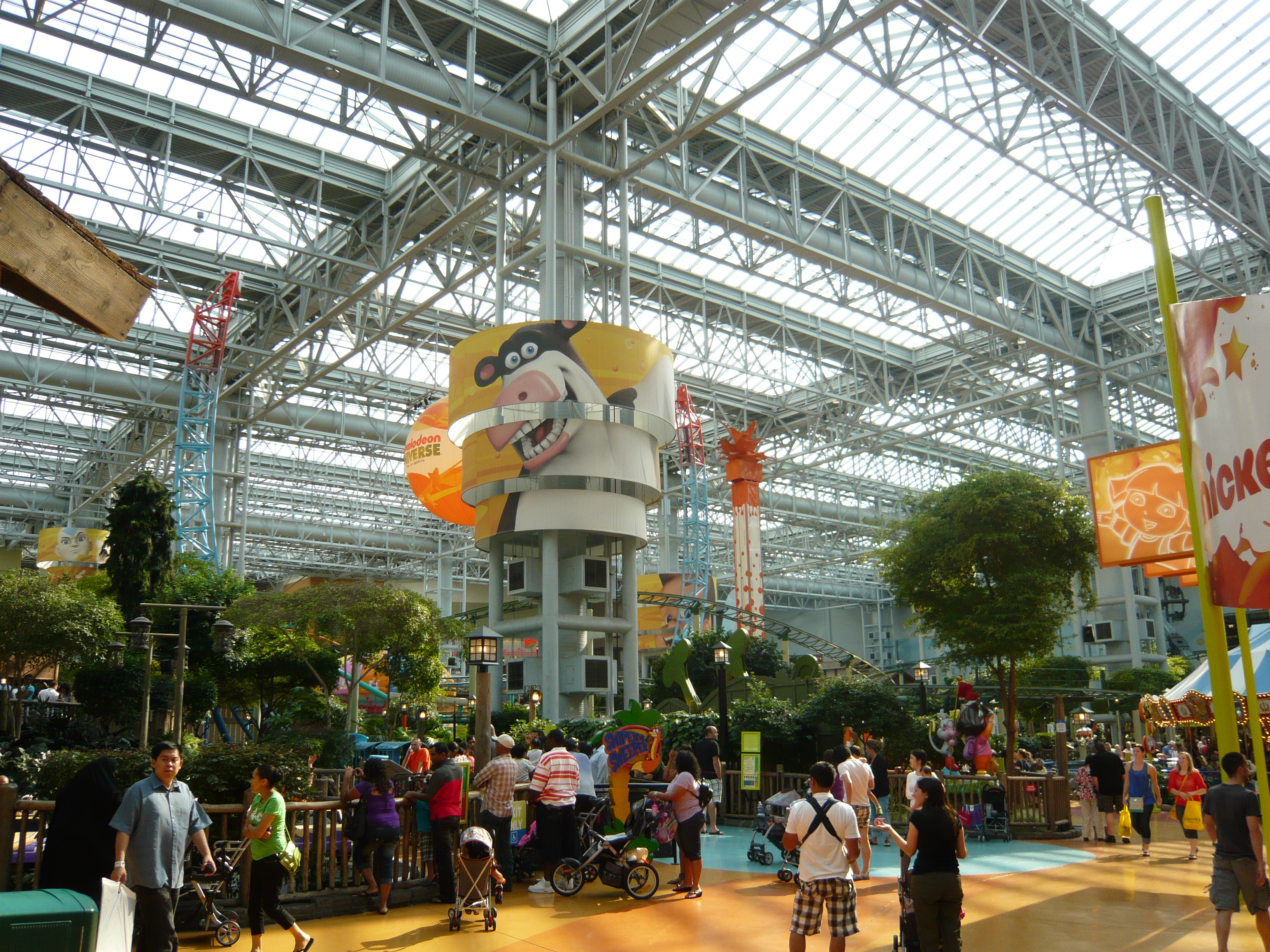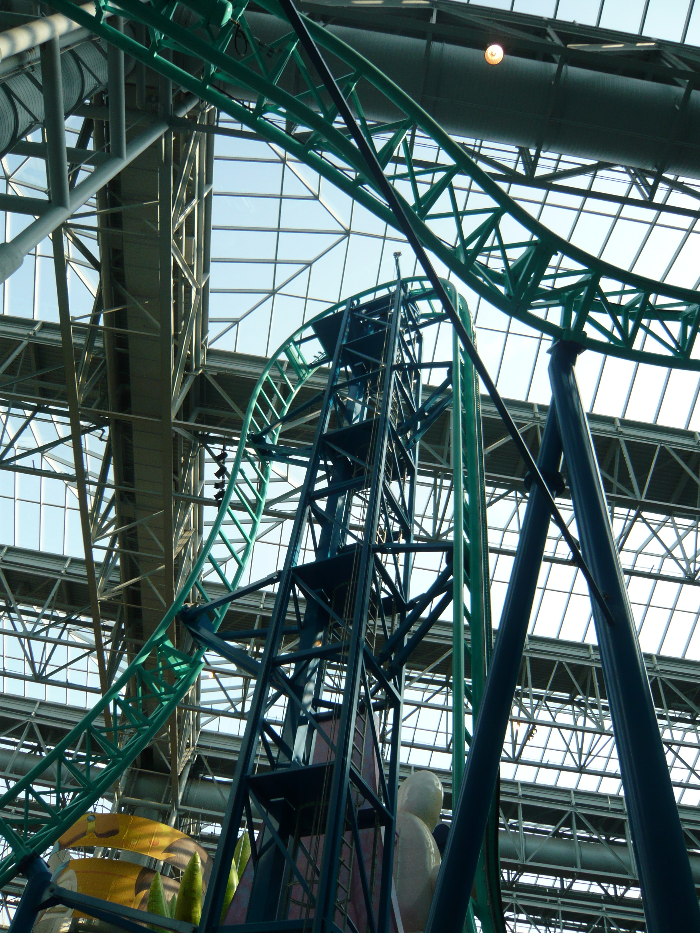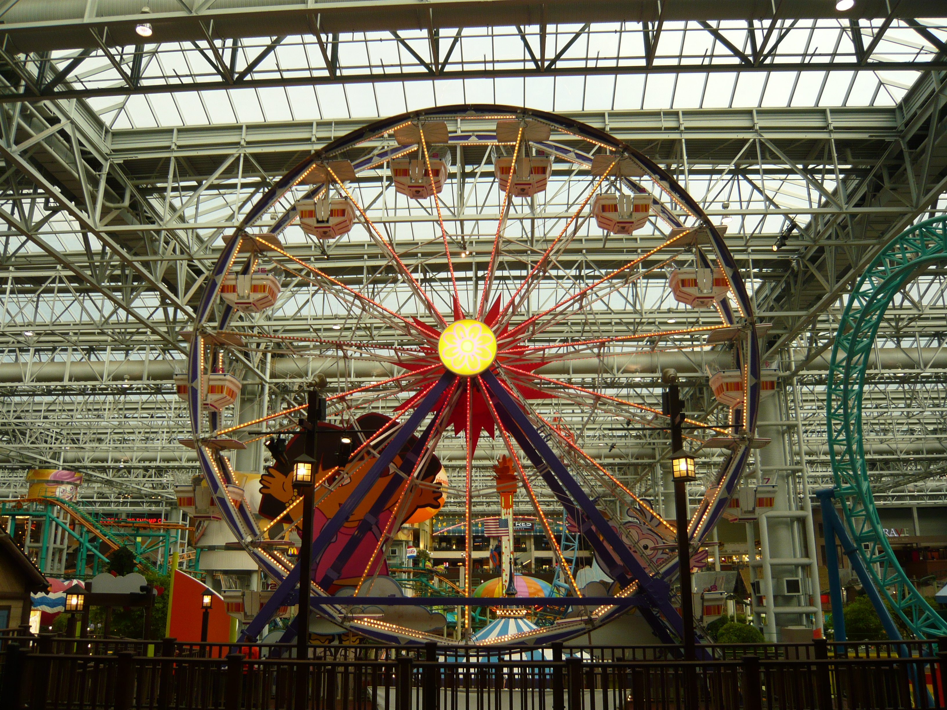 Den Anfang dieser Berichtserie macht nun also das Nickelodeon Universe, der Indoor-Vergnügungspark im Innenhof der wirklich gigantischen Mall of America im Süden von Minneapolis. Um sich einen Begriff von den gigantischen Dimensionen machen zu können, mit denen man es hier zu tun hat: Dieser aus der Luftperspektive betrachtet in etwa quadratische Megabau hat eine Gesamtverkaufsfläche von unglaublichen 230'000 Quadratmetern, an jeder Seite mehrstöckige Parkhäuser mit insgesamt mehr als 20'000 Gratis-Parkplätzen, mehrere Food Courts, ein Multiplex-Kino mit 14 Sälen, eine Minigolfanlage, ein Aquarium... Und was das Shopping-Angebot anbelangt: alleine bei Macy's, Sears, Nordstrom und Bloomingdales, den vier "Anchor Stores" (das sind Filialen grosser und bekannter Warenhaus-Ketten, die das Publikum in die Mall locken sollen) findet man auf riiiesigen mehrstöckigen Ablegern schon so ziemlich alles, was man sich auch nur annähernd an Non-Food-Konsumgütern vorstellen kann. Und trotzdem gibt es noch über 500 weitere Geschäfte! Für uns fast nicht vorstellbare Verhältnisse! Aber vielleicht ist ja diese Anekdote dafür noch aufschlussreich: Da ich den Fokus ja hauptsächlich auf den Vergnügungspark gelegt habe und die Souvenirjagd aus nachvollziehbaren Gründen erst am Ende der langen Reise in Angriff nahm, machte ich nach erst Parkschluss einen Rundgang durch die Mall - bei dann auch schon geschlossenen Geschäften. Selbst in zackigem Marschtempo, mit niemandem im Weg und keinen lockenden Schaufenstern und Fassaden dauert ein kompletter Rundgang eine volle Viertelstunde, mit kurzen Fotostopps gar 20 Minuten. Der absolute Wahnsinn!