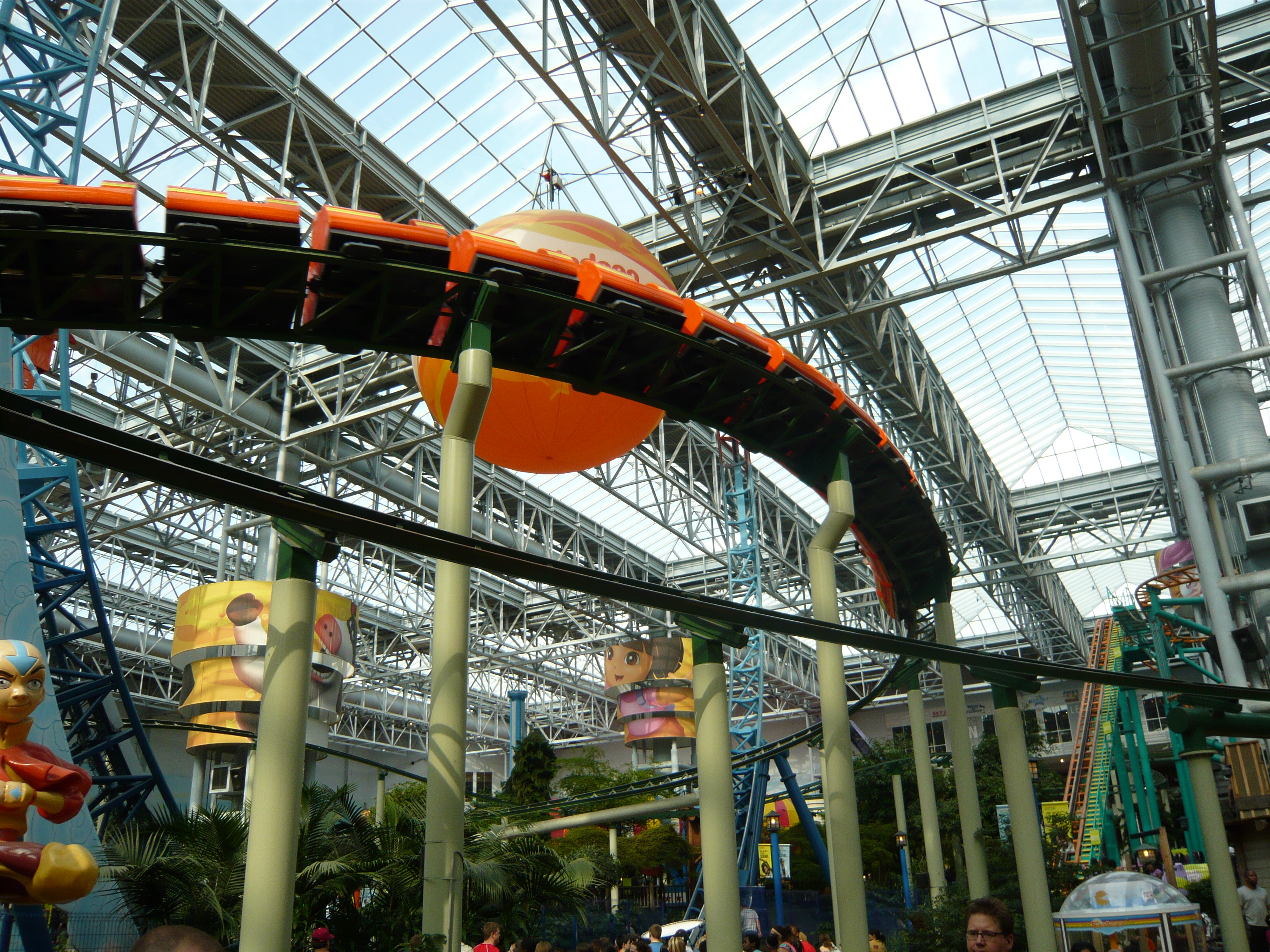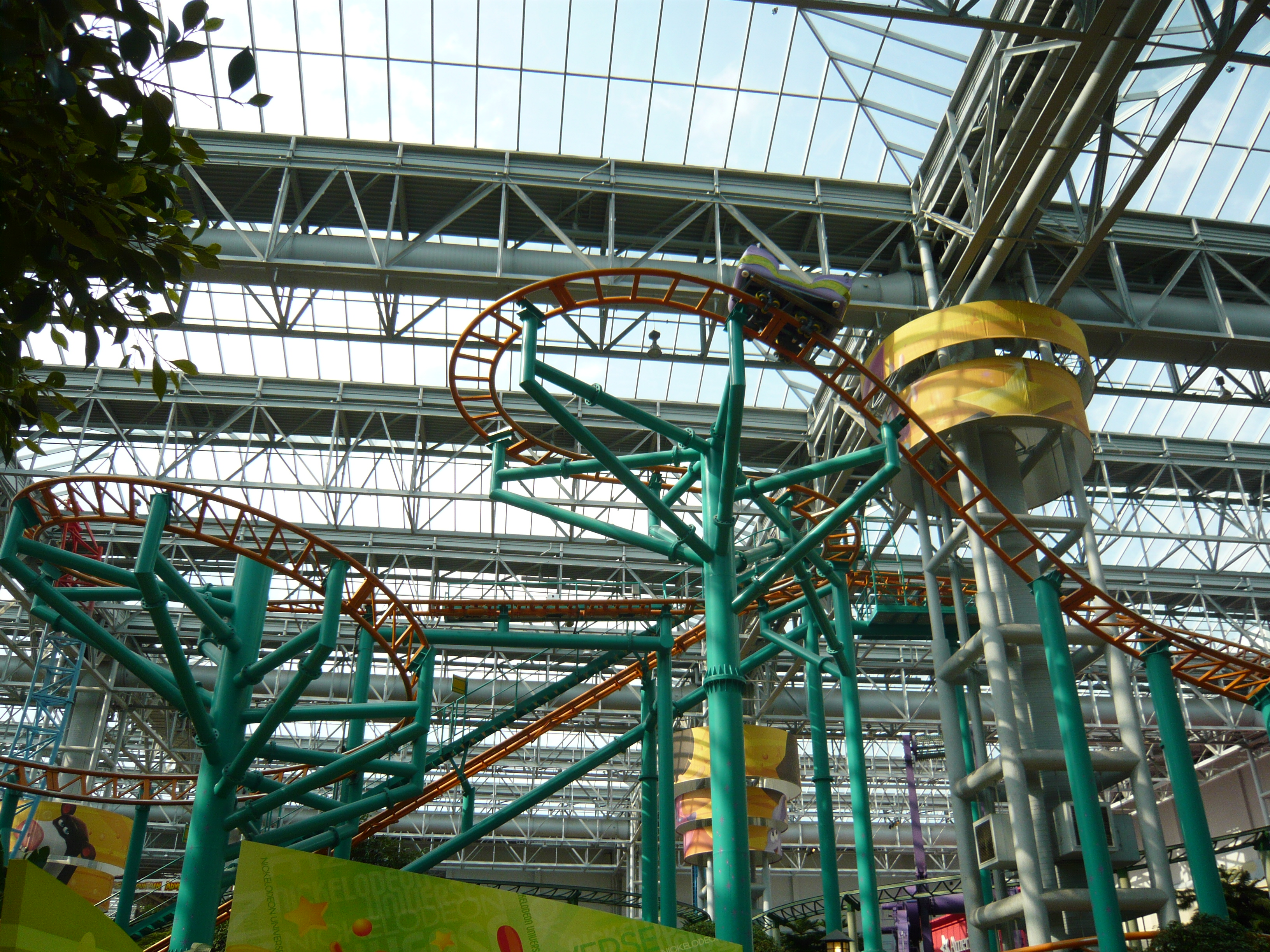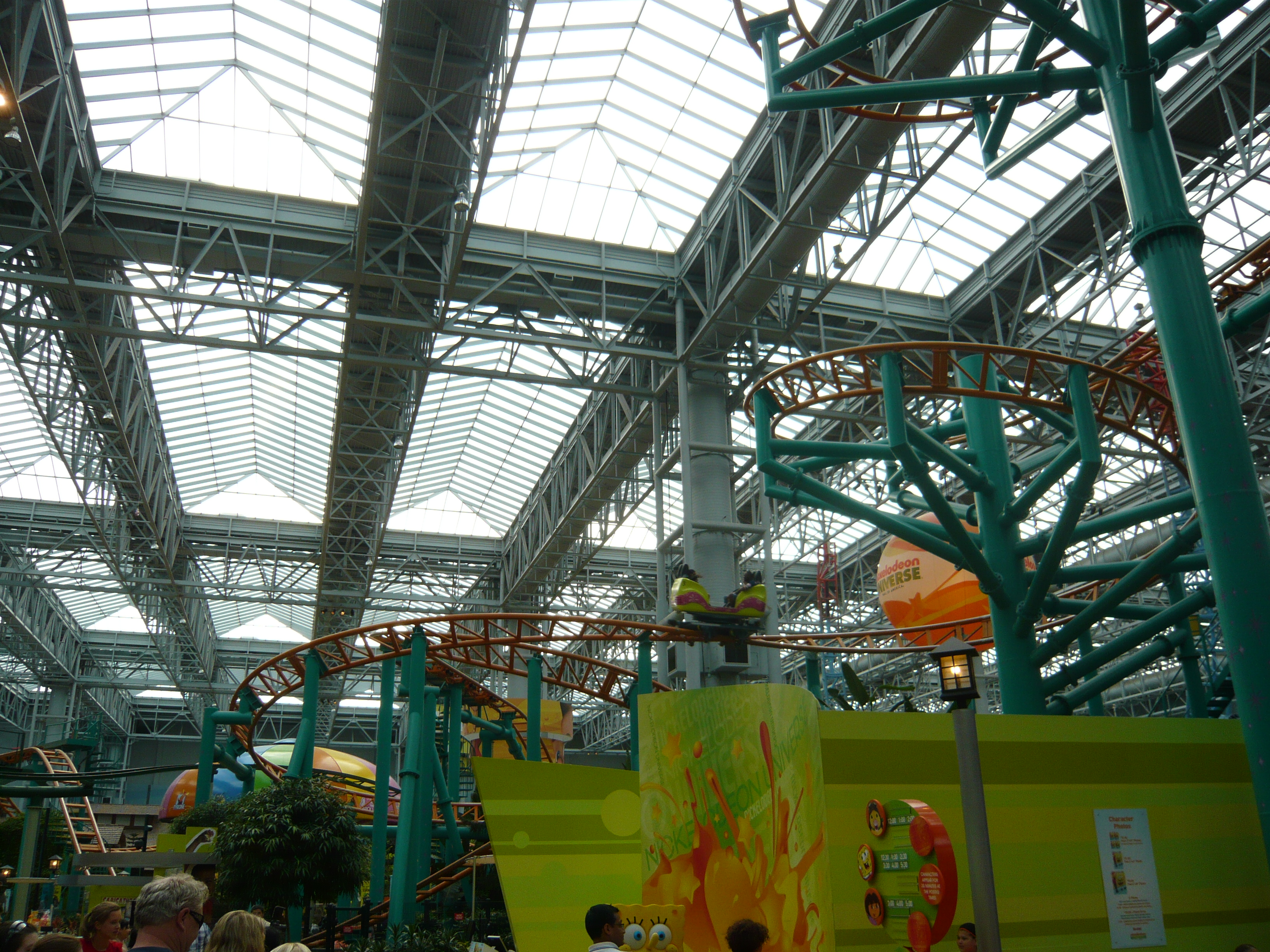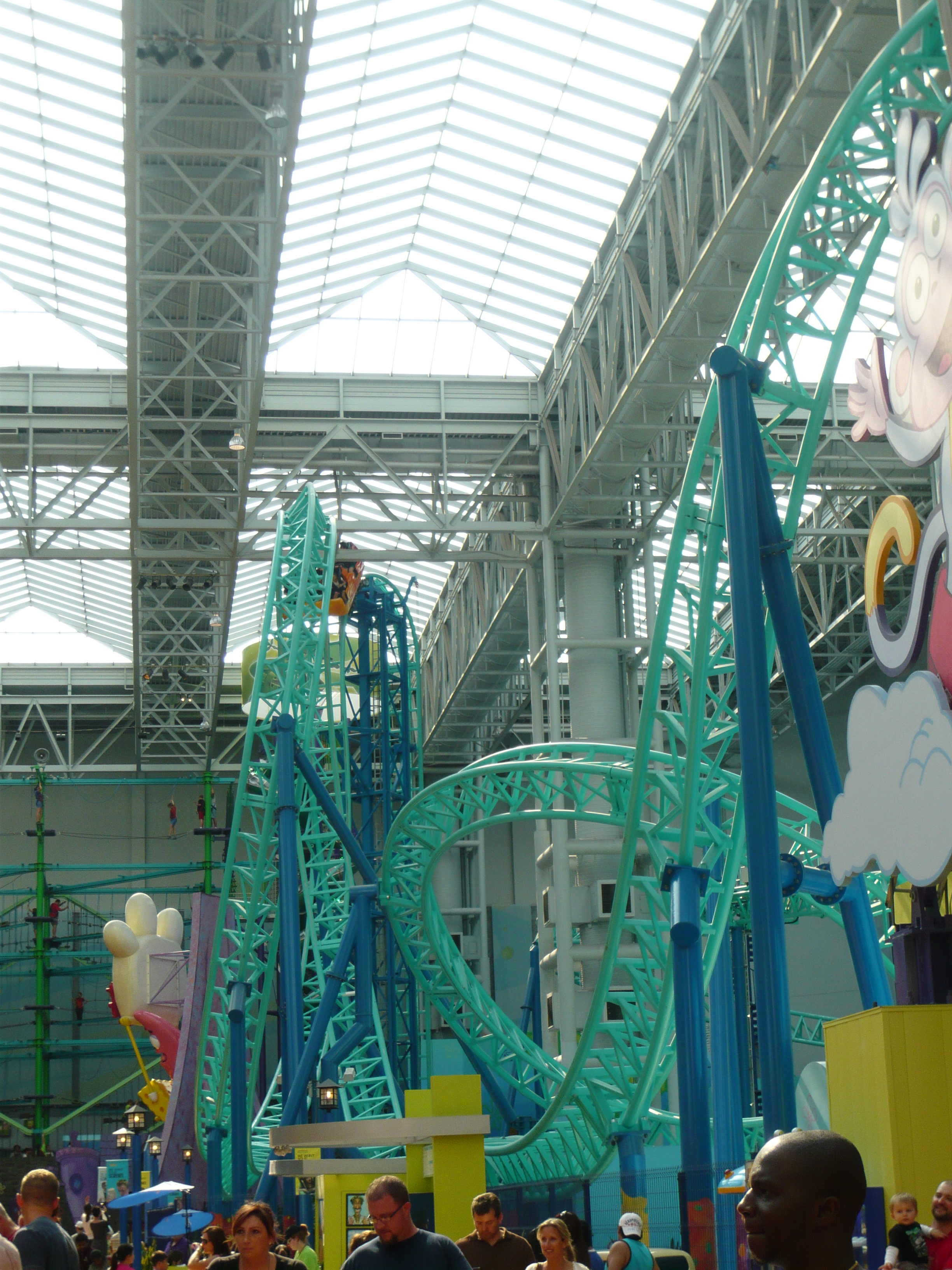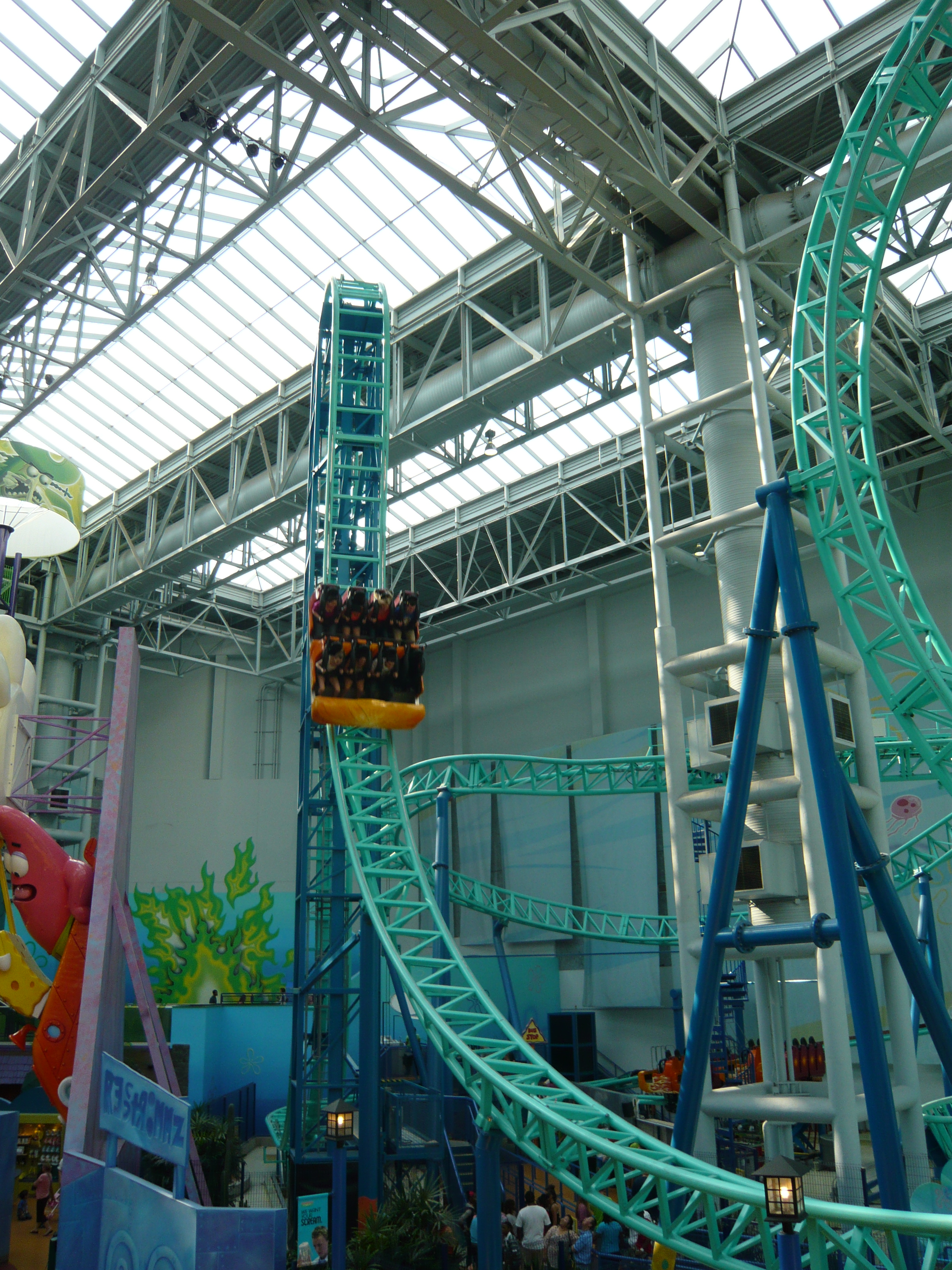 Der Park hat angesichts seines geringen Alters schon eine recht lebendige Geschichte mit zwei Betreiberwechseln hinter sich, hiess entsprechend schon Camp Snoopy, The Park at MOA und jetzt eben Nickelodeon Universe. Heute sind denn auch alle Fahrgeschäfte und Attraktionen nach den bekanntesten und berühmtesten Nickelodeon-Serien benamst und themtisiert. Und es ist echt kaum zu glauben, wieviele davon hier reingequetscht worden sind. Coaster, die genau bis unter die Dachbalken ragen und sich kreuzen; Fahrgeschäfte, bei denen die Gondeln mit denen des Nachbargeschäfts oder mit Coasterschienen, Zäunen und Pflanzen zu kollidieren drohen... Das muss man einfach mal mit eigenen Augen gesehen haben, was man hier aus einem einfachen Mall-Innenhof gemacht hat!