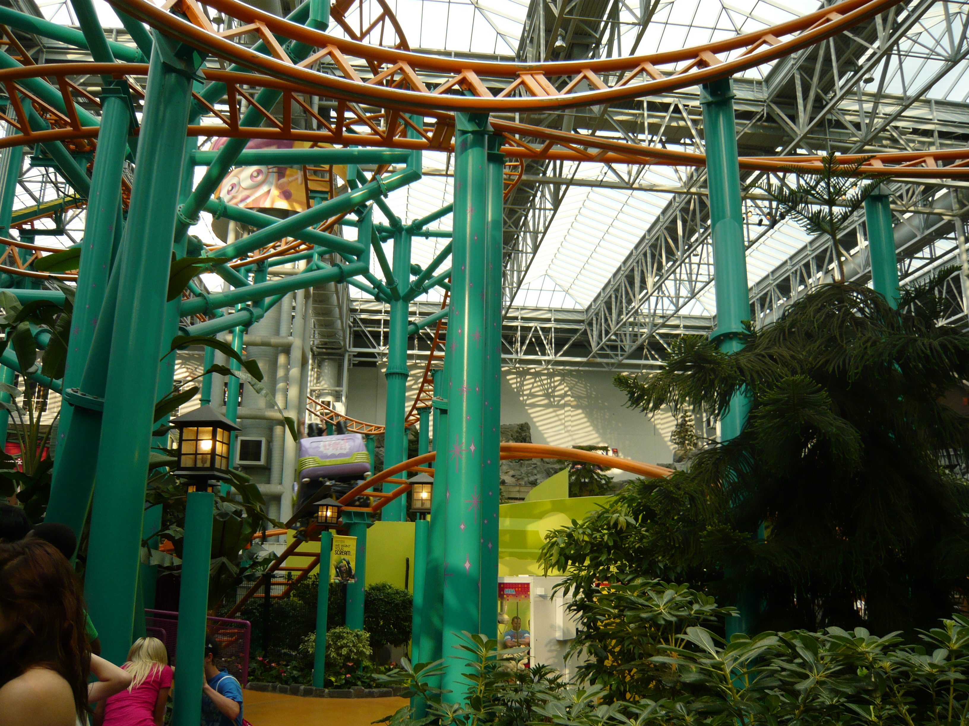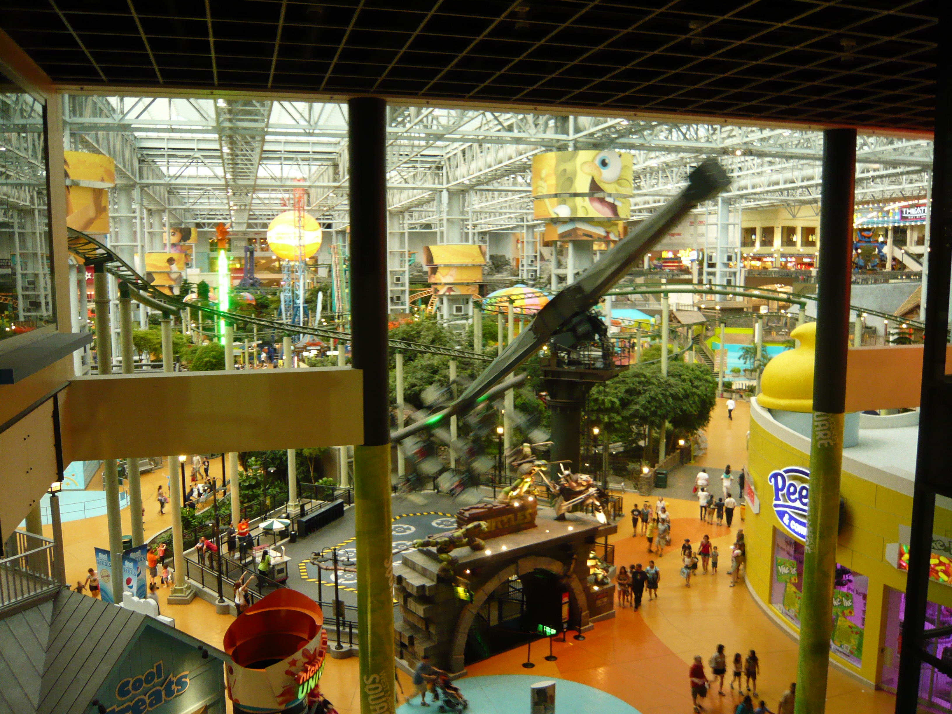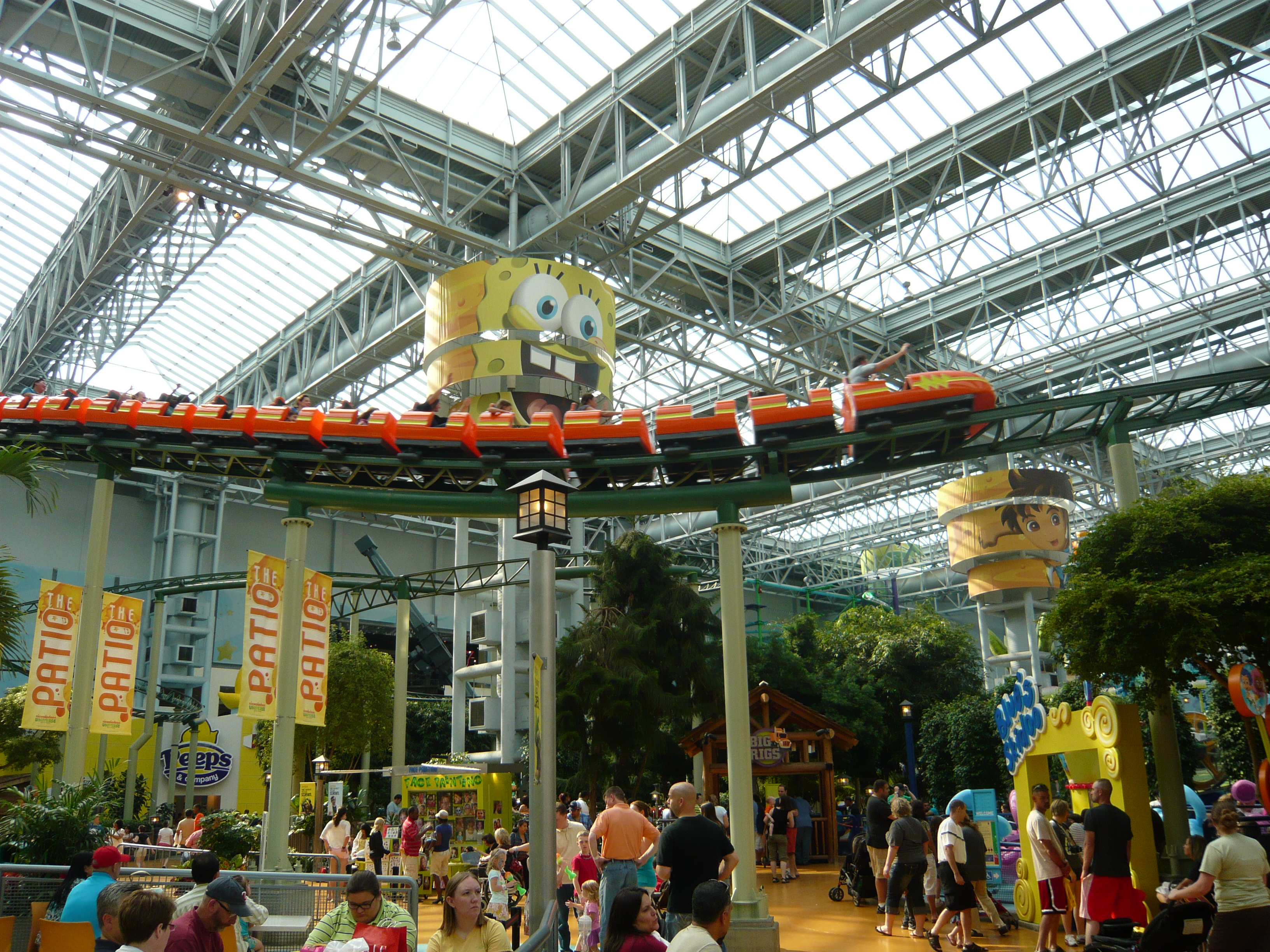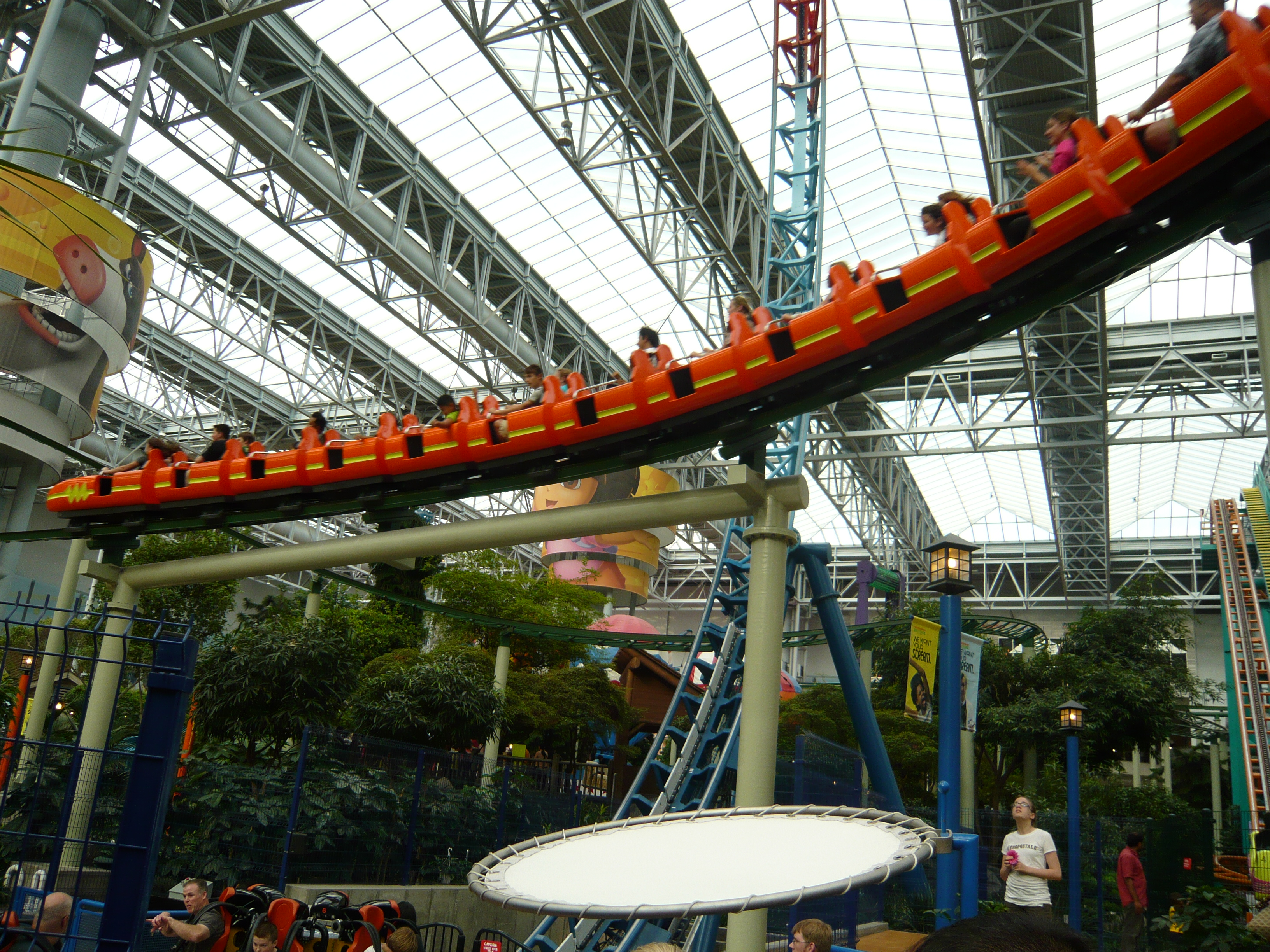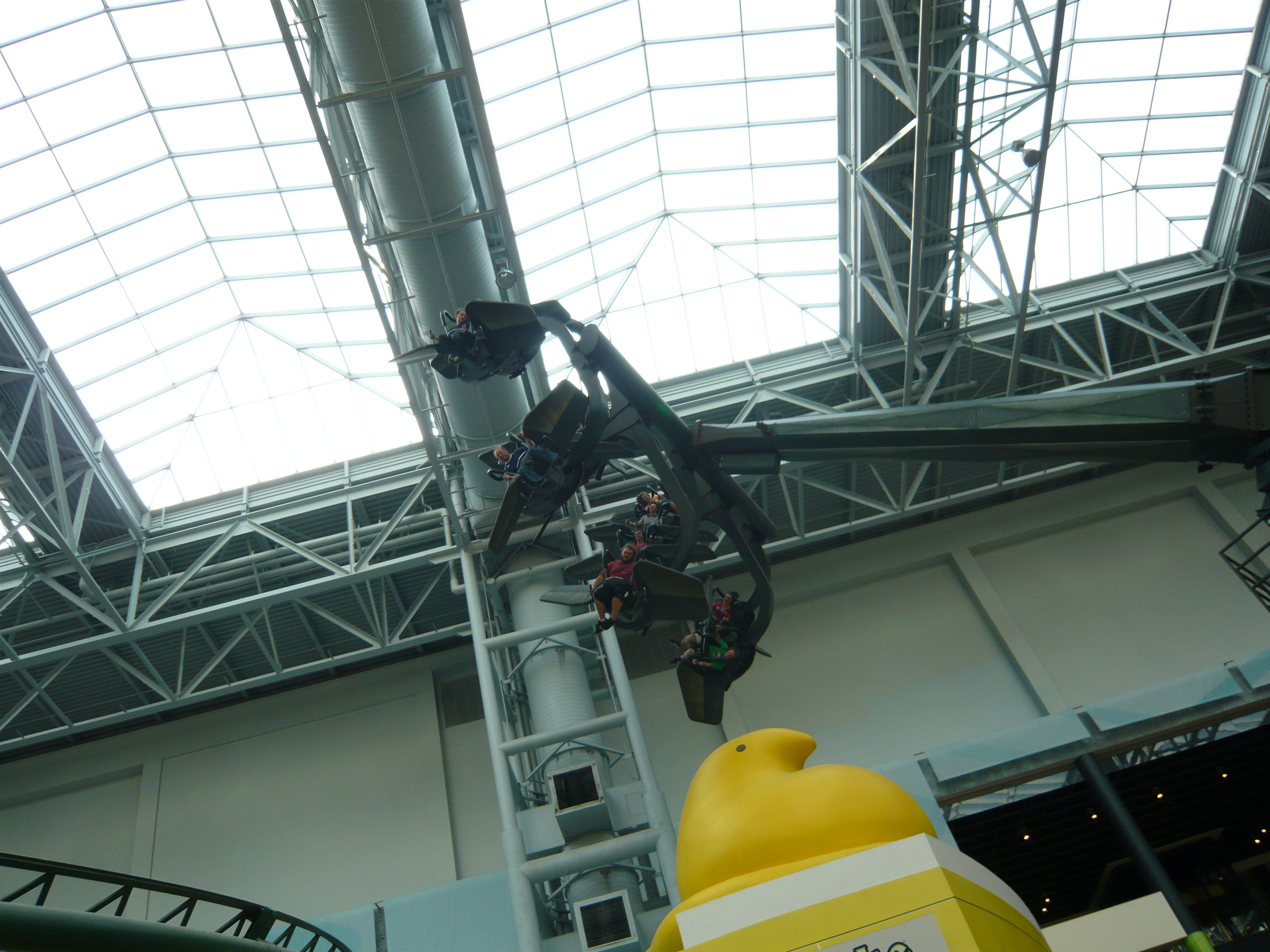 Der Park hat angesichts seines geringen Alters schon eine recht lebendige Geschichte mit zwei Betreiberwechseln hinter sich, hiess entsprechend schon Camp Snoopy, The Park at MOA und jetzt eben Nickelodeon Universe. Heute sind denn auch alle Fahrgeschäfte und Attraktionen nach den bekanntesten und berühmtesten Nickelodeon-Serien benamst und themtisiert. Und es ist echt kaum zu glauben, wieviele davon hier reingequetscht worden sind. Coaster, die genau bis unter die Dachbalken ragen und sich kreuzen; Fahrgeschäfte, bei denen die Gondeln mit denen des Nachbargeschäfts oder mit Coasterschienen, Zäunen und Pflanzen zu kollidieren drohen... Das muss man einfach mal mit eigenen Augen gesehen haben, was man hier aus einem einfachen Mall-Innenhof gemacht hat!