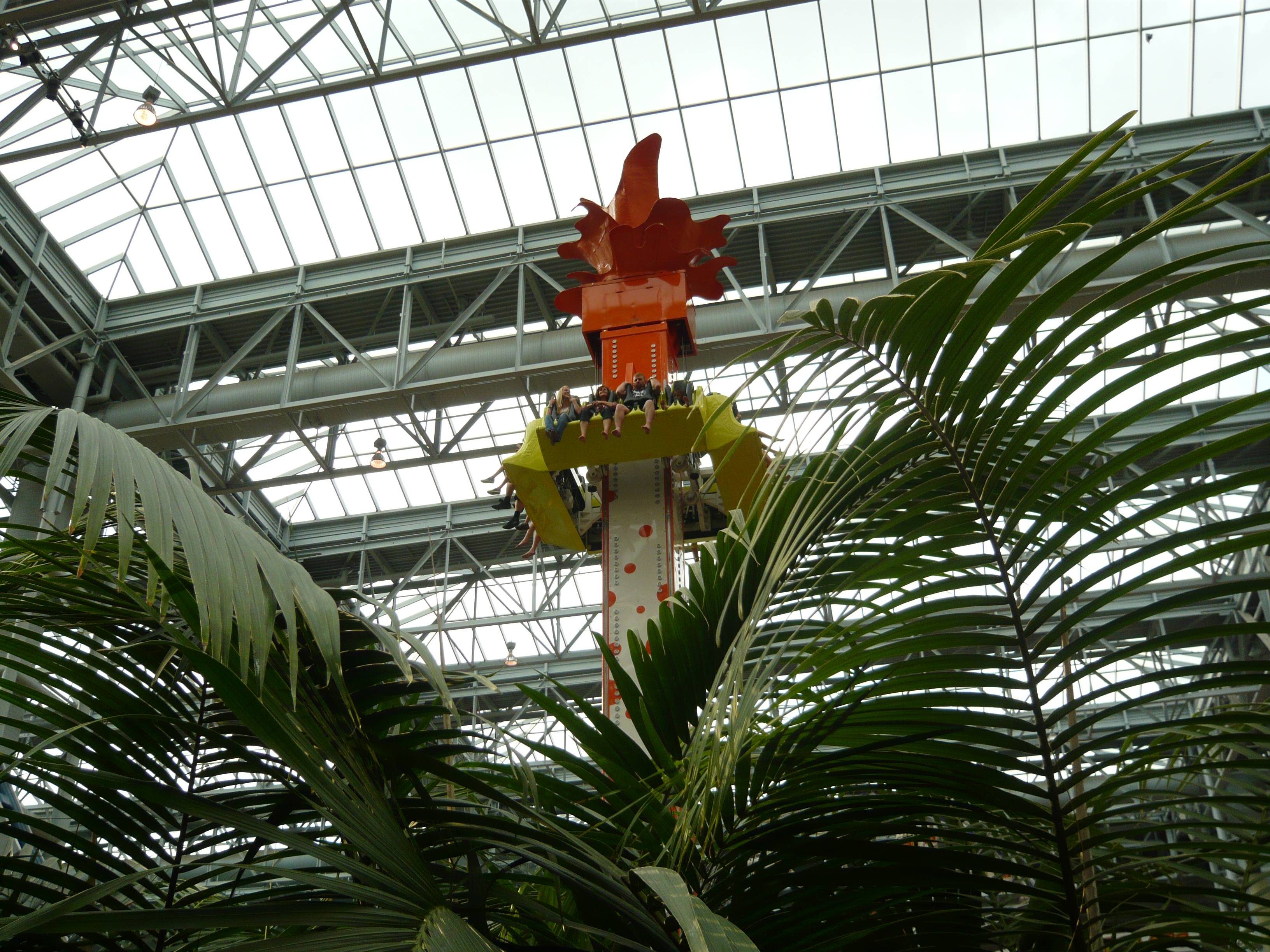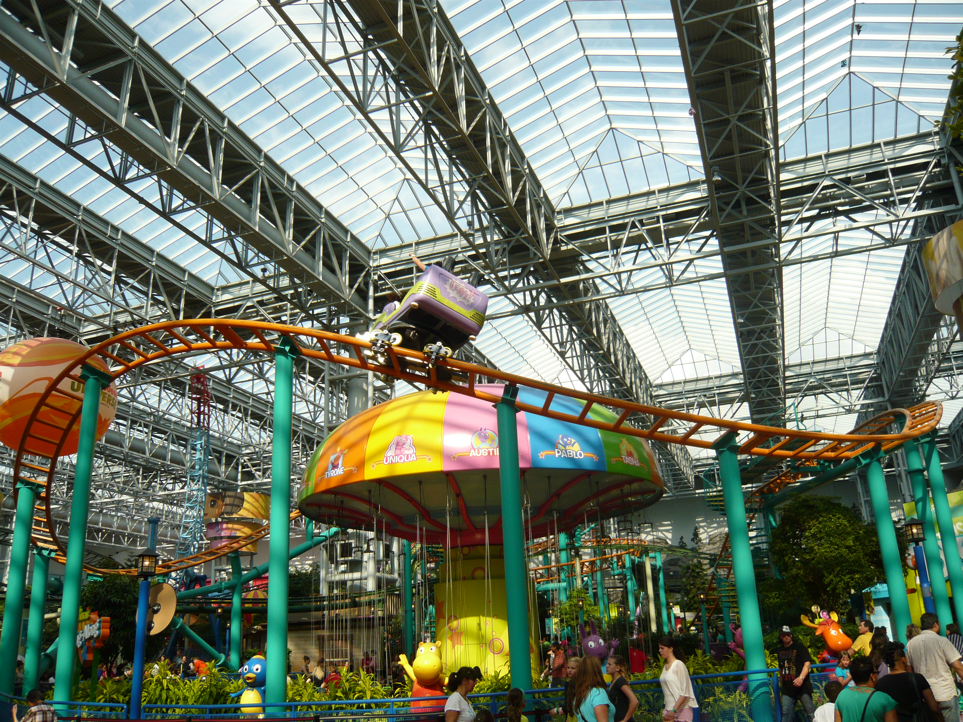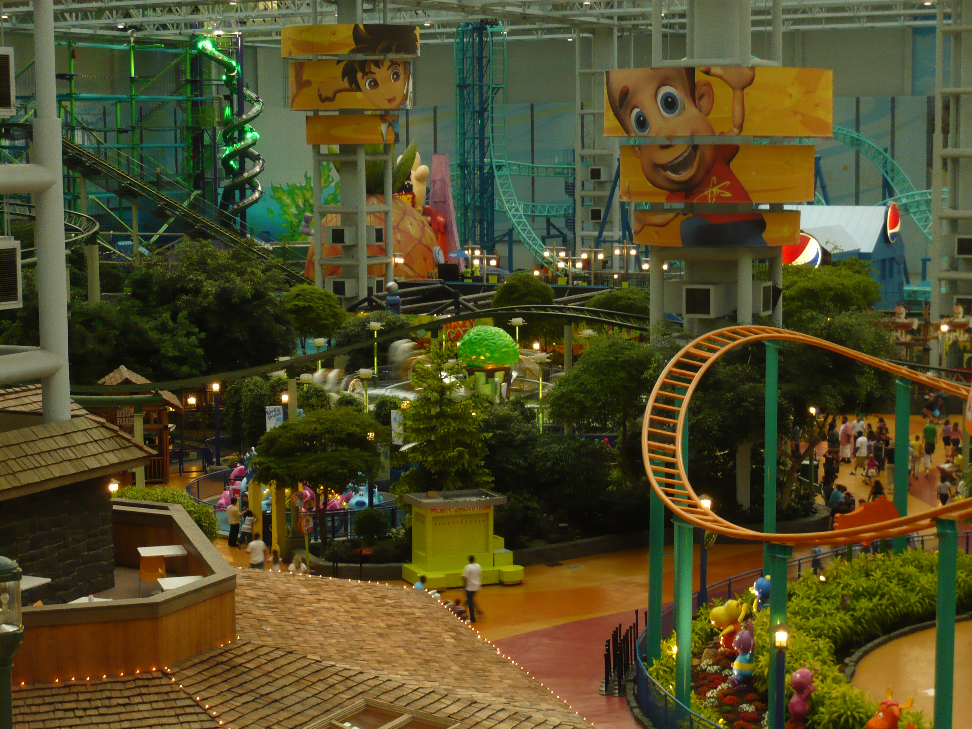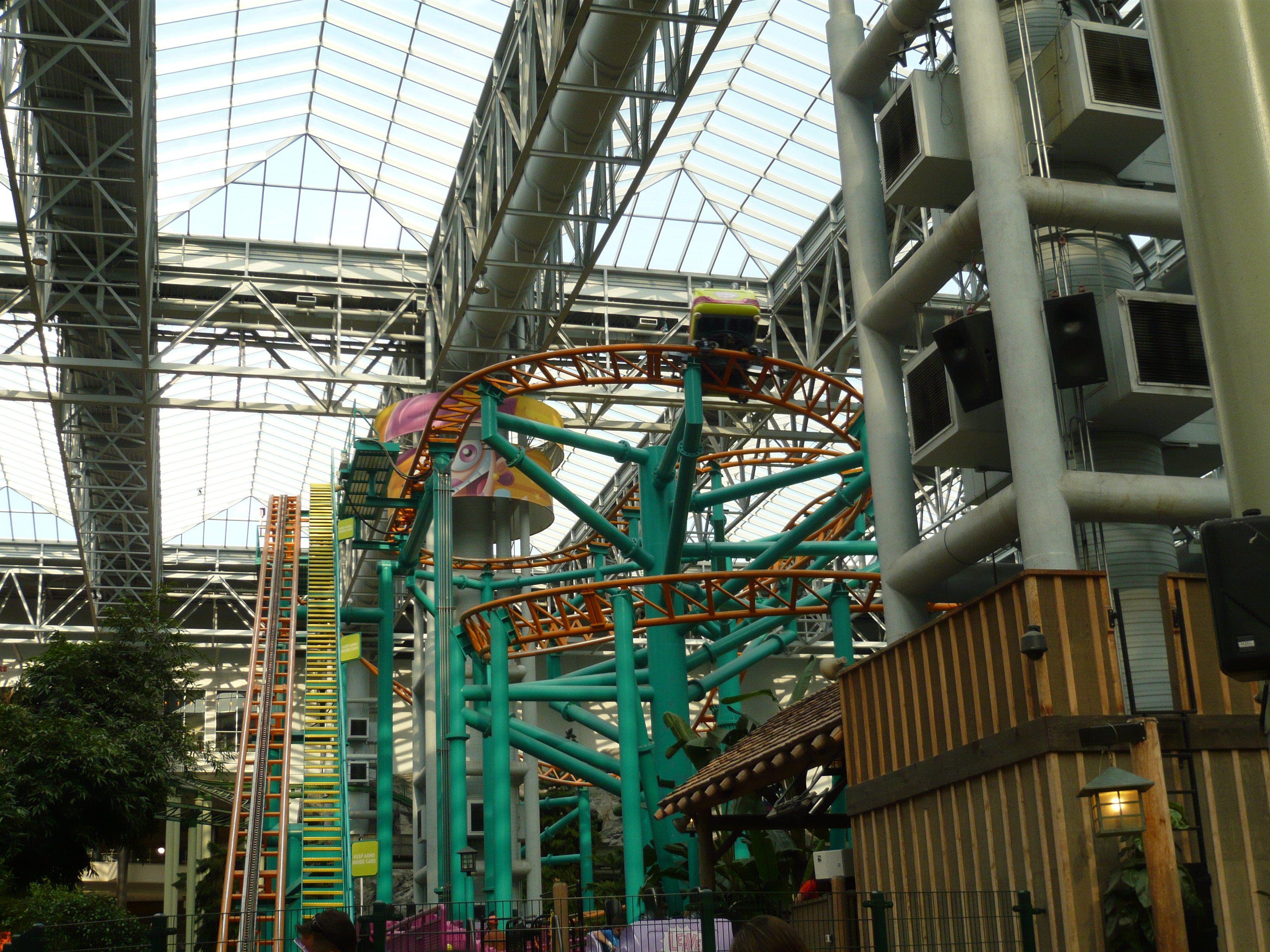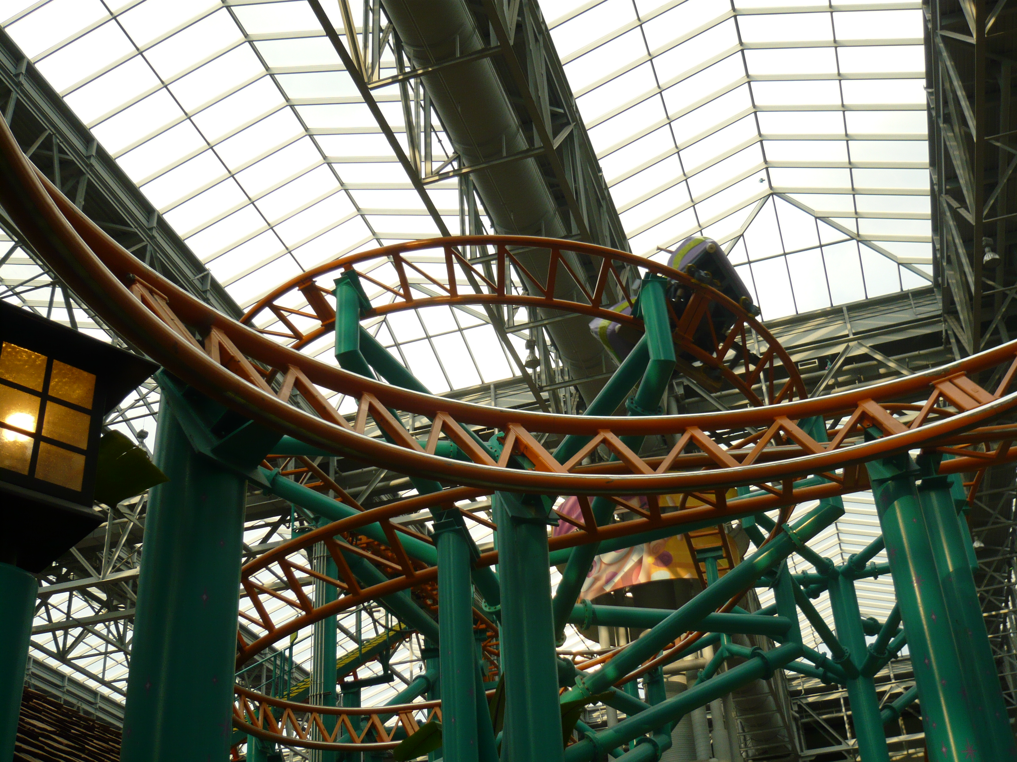Der Park hat angesichts seines geringen Alters schon eine recht lebendige Geschichte mit zwei Betreiberwechseln hinter sich, hiess entsprechend schon Camp Snoopy, The Park at MOA und jetzt eben Nickelodeon Universe. Heute sind denn auch alle Fahrgeschäfte und Attraktionen nach den bekanntesten und berühmtesten Nickelodeon-Serien benamst und themtisiert. Und es ist echt kaum zu glauben, wieviele davon hier reingequetscht worden sind. Coaster, die genau bis unter die Dachbalken ragen und sich kreuzen; Fahrgeschäfte, bei denen die Gondeln mit denen des Nachbargeschäfts oder mit Coasterschienen, Zäunen und Pflanzen zu kollidieren drohen... Das muss man einfach mal mit eigenen Augen gesehen haben, was man hier aus einem einfachen Mall-Innenhof gemacht hat!