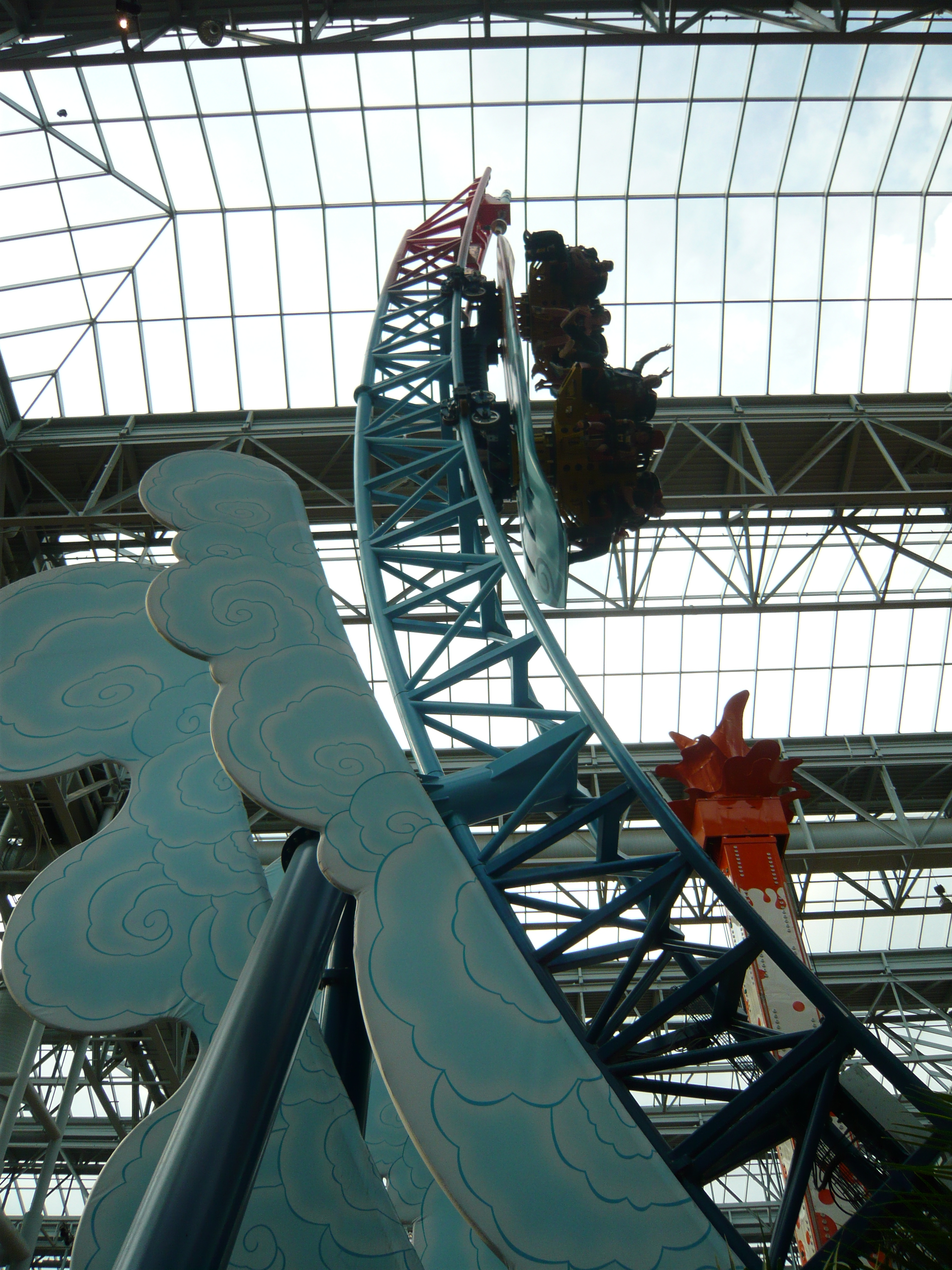 Das langsame Hochziehen in der Senkrechten gegen das Hallendach ist optisch die totale Ausgefallenheit und einfach skurril! Oben angekommen verlangsamt sich daraufhin die Ziehgeschwindigkeit der Kette, so dass man das Kippen in die übergeneigte Talfahrt