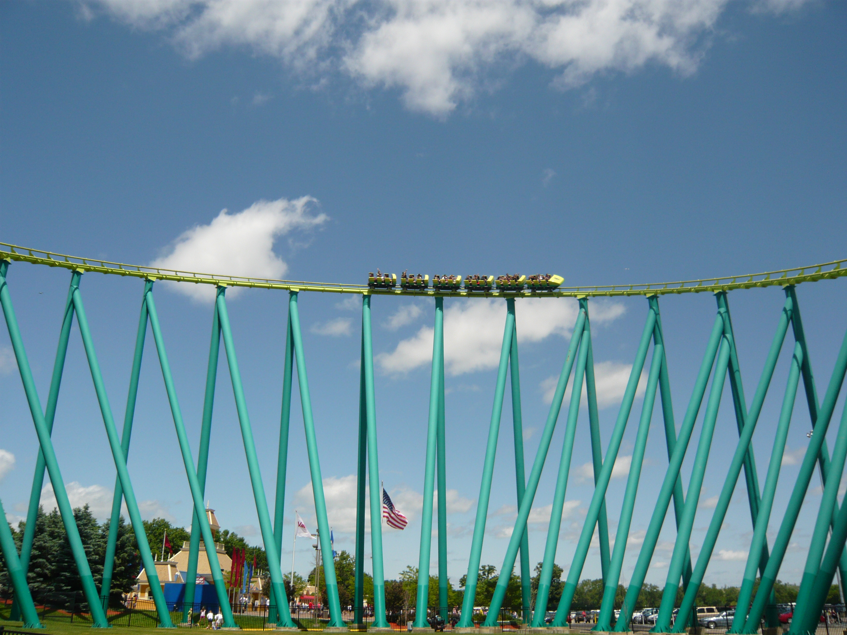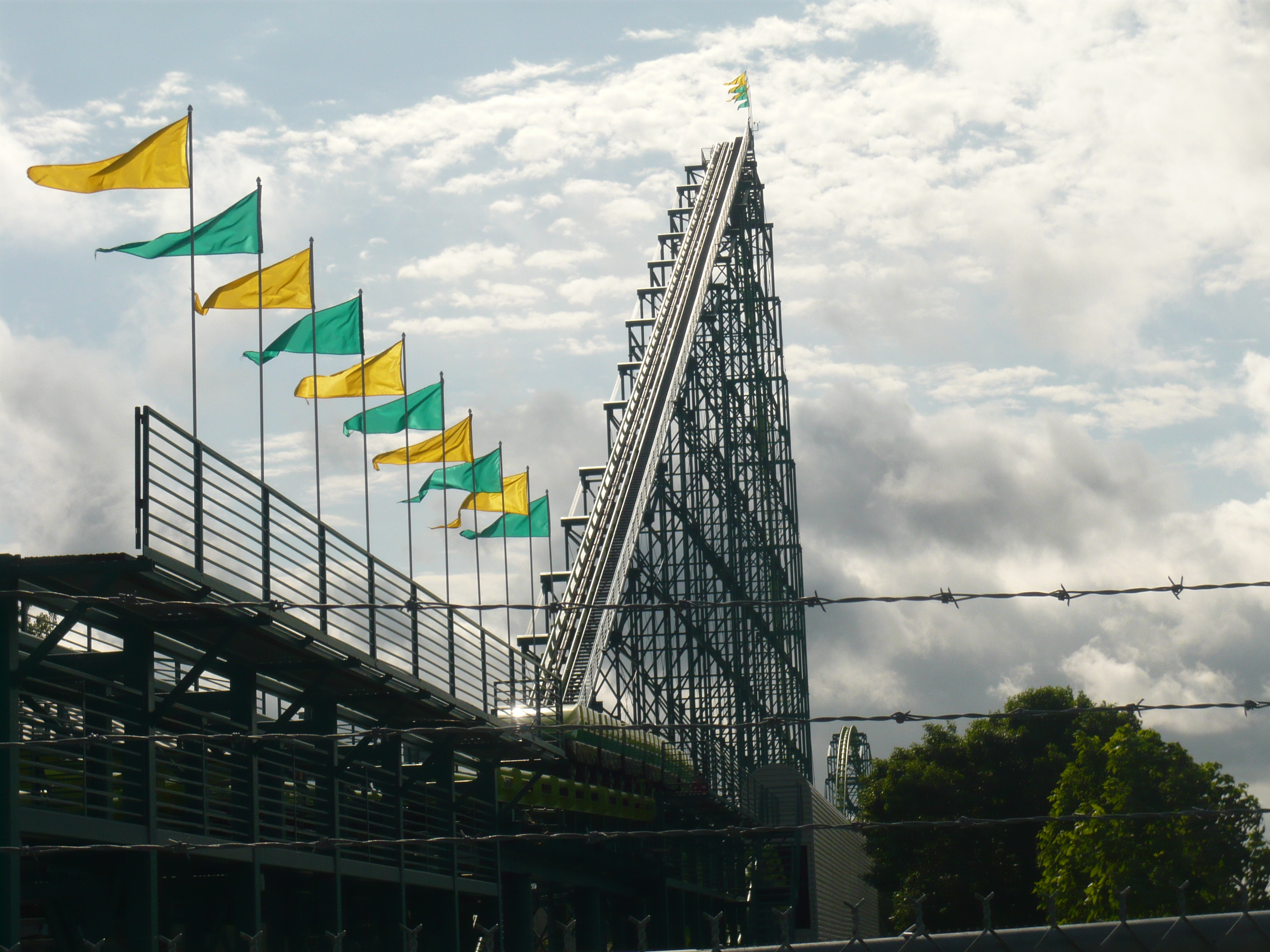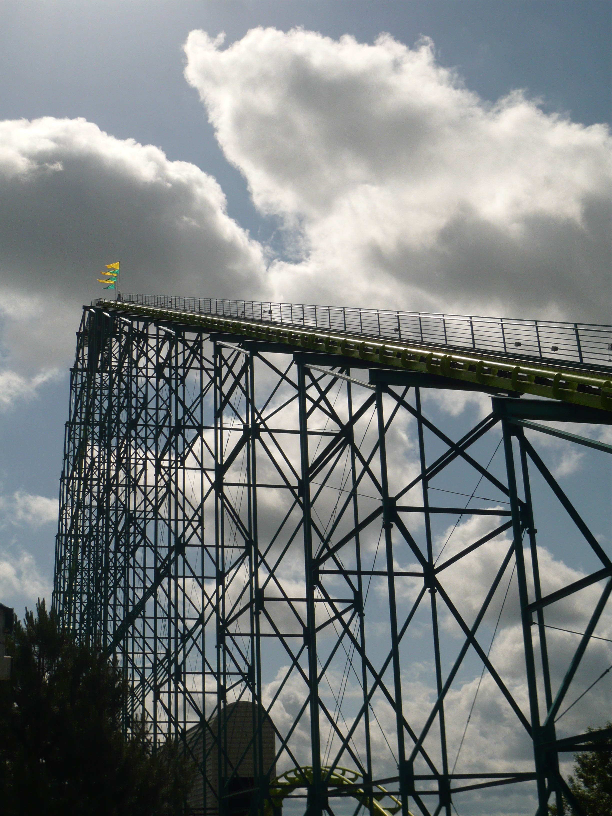 First Drop überquert man zunächst einen viel zu hohen Hügel, wo glaube ich sogar noch eine zweite Kette eingesetzt werden muss, damit man es da rüber schafft. Daraufhin folgt der recht hochgelagerte