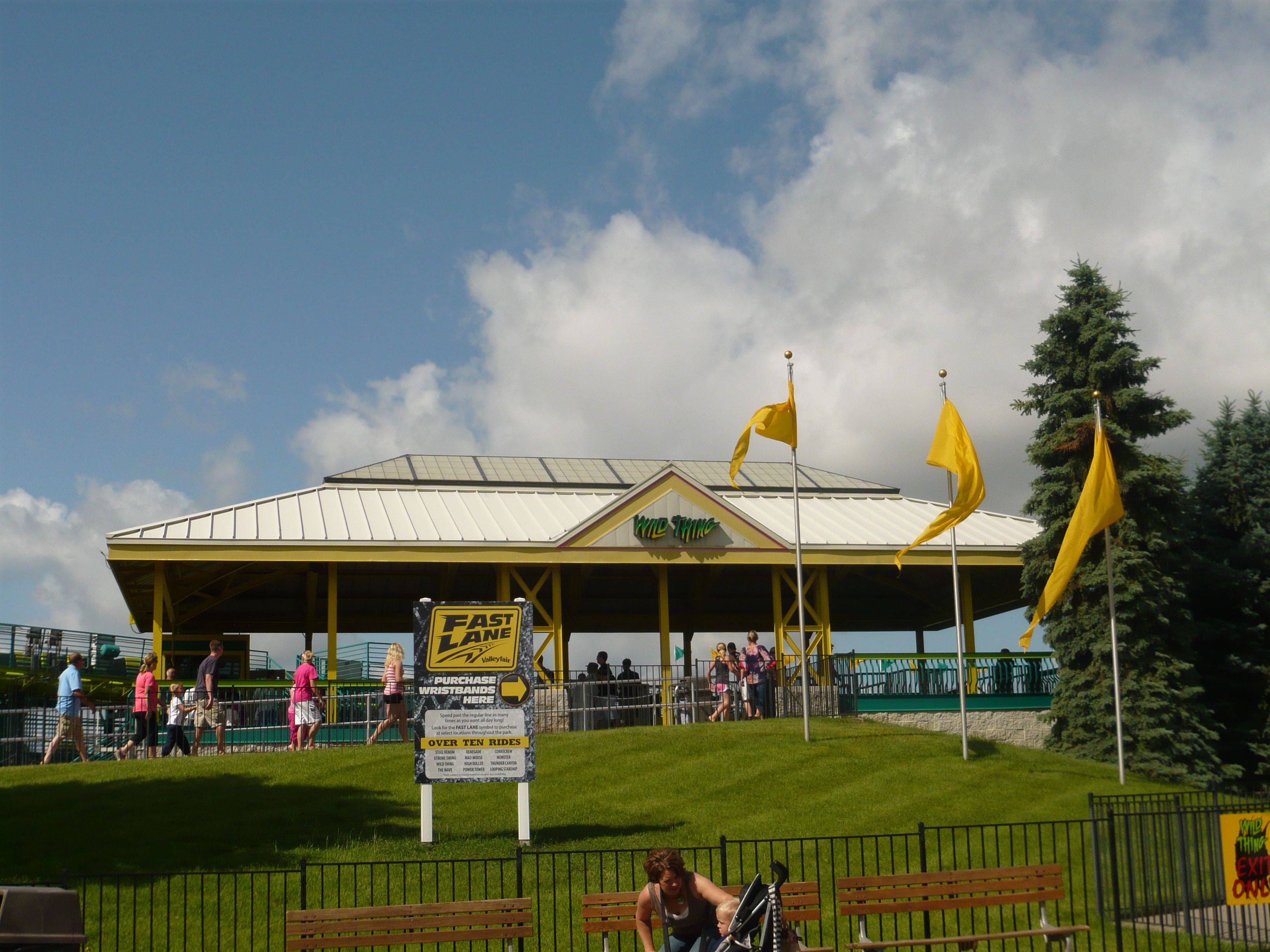 Kapazitätsgurke Nr. 2, Steel Venom, sah von weitem noch nicht wirklich betriebsbereit aus, also hab ich mich direkt zum nächstgelegenen Objekt der Begierde begeben: zum Morgan Hypercoaster Wild Thing. Da ich Steel Force im Dorney Park ja noch in allerbester Erinnerung habe, war ich hierauf natürlich ausserordentlich gespannt!