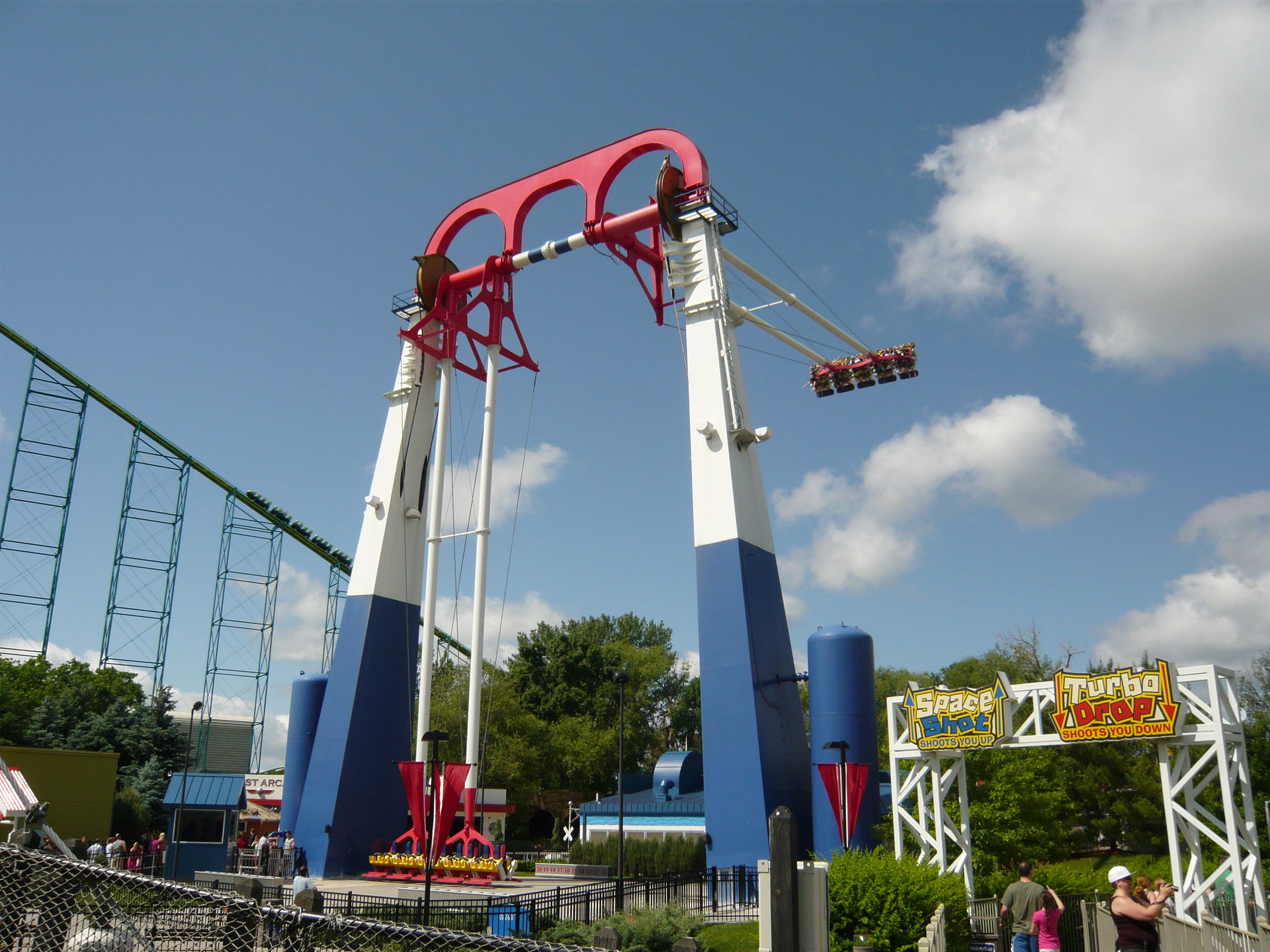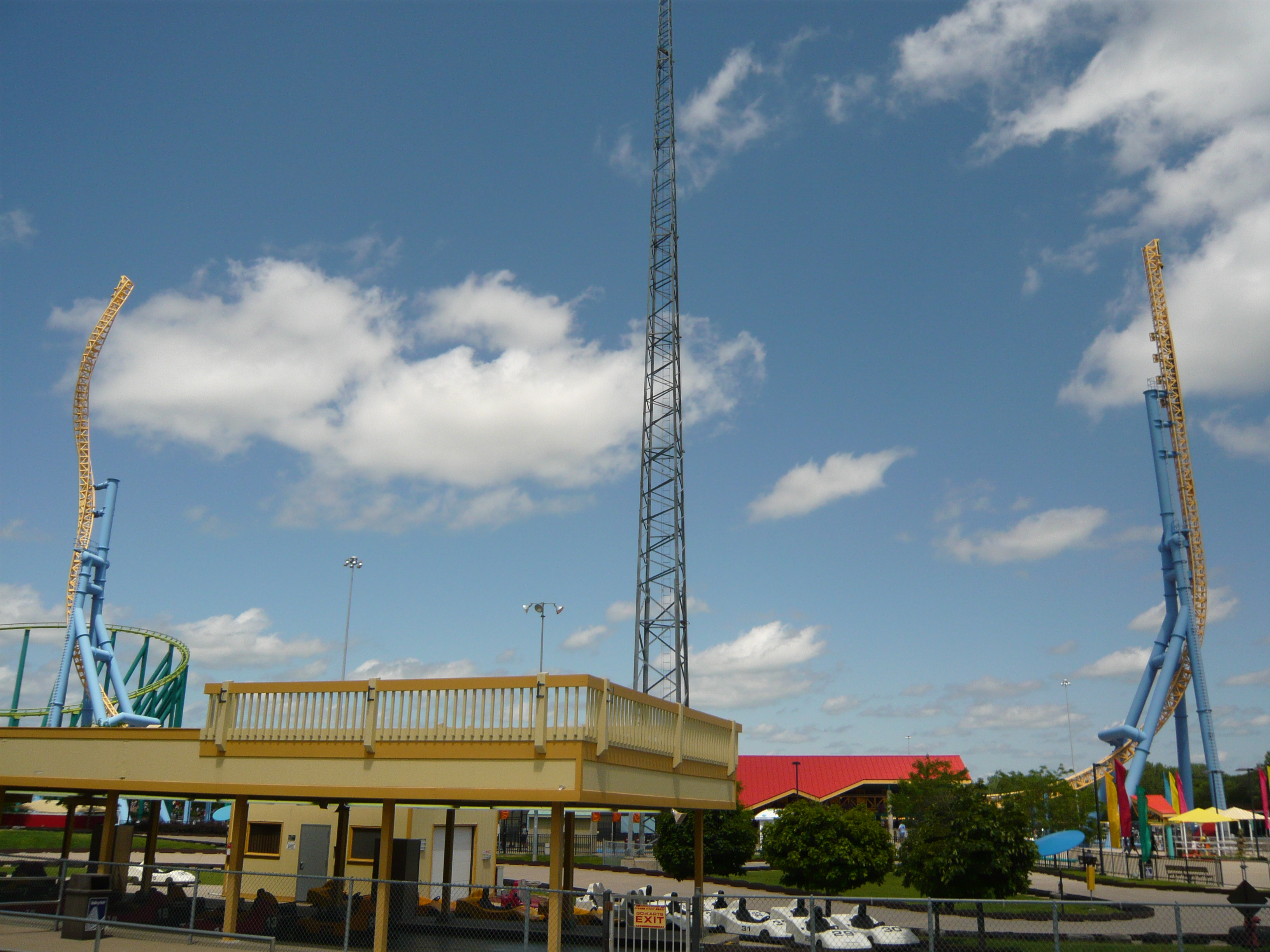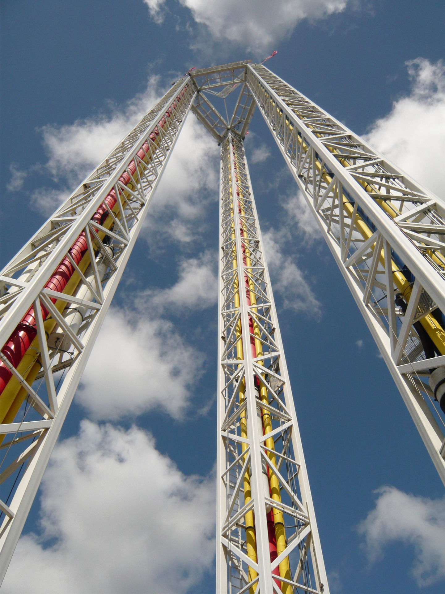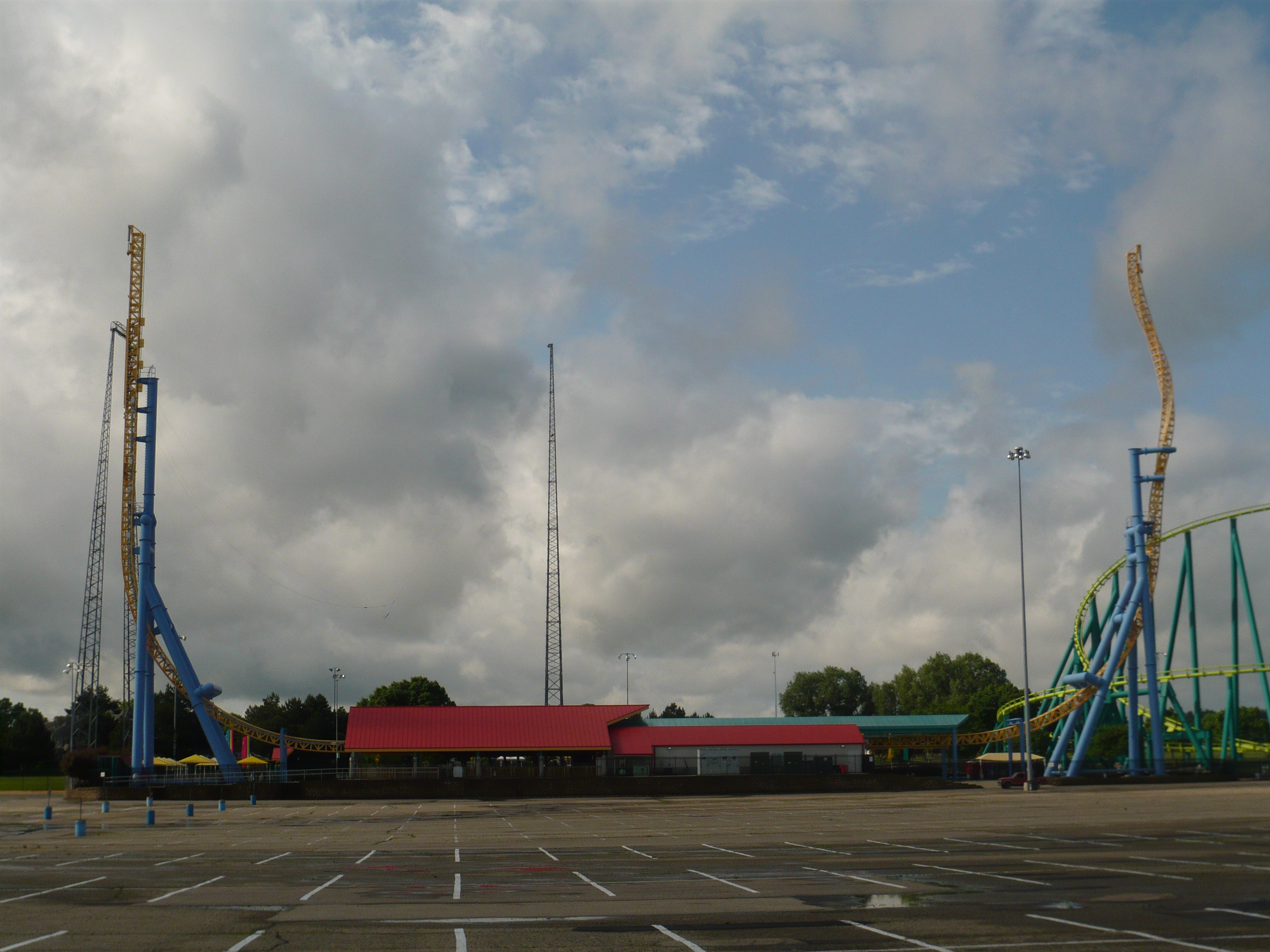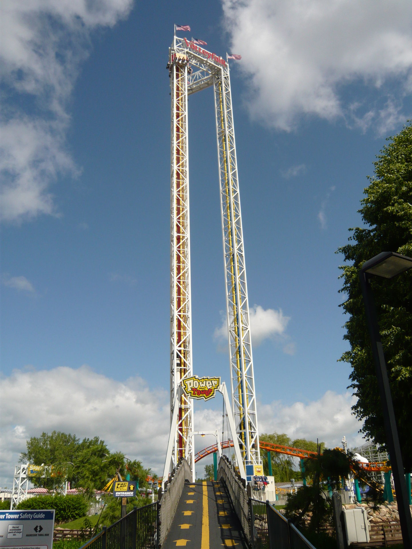 Eigentlich wollte ich ja zu Renegade rüber, weil ich von Wild Thing aus gesehen habe, dass Steel Venom immer noch nicht läuft. Irgendwie musste ich bei null Andrang dann aber doch noch eine Fahrt mit dem sehr publikumswirksam platzierten Power Tower machen. Endlich konnte ich auch mal die Variante "langsam Hochziehen und fallen lassen" auf so einem grossen Exemplar fahren, was dann zumindest beim ersten Fall auch ein sehr kribbeliges Erlebnis ist!