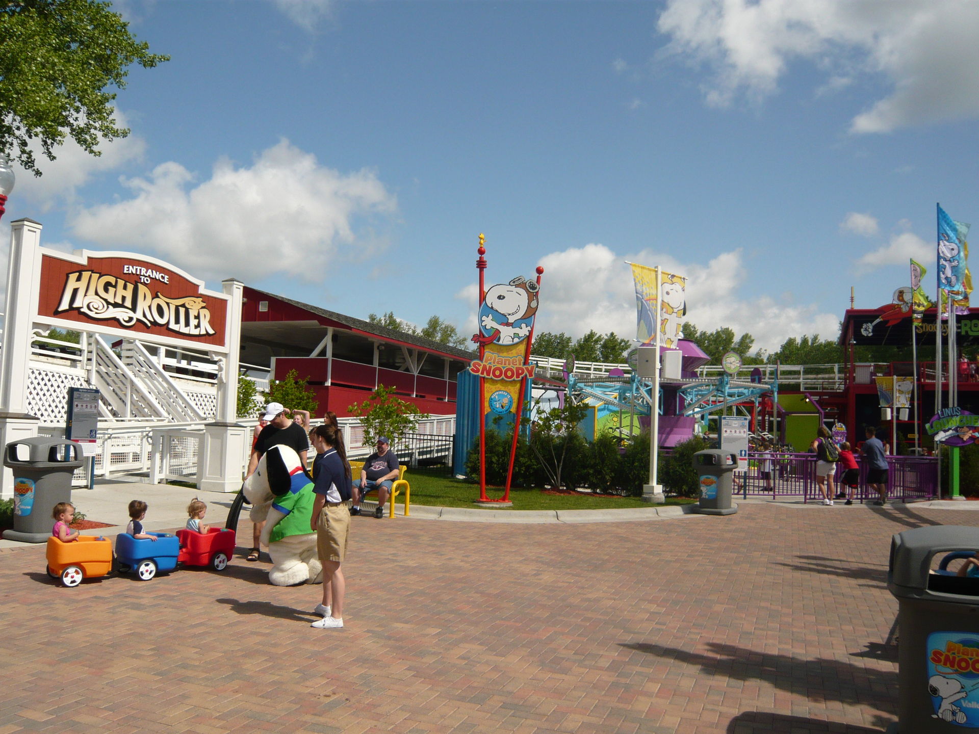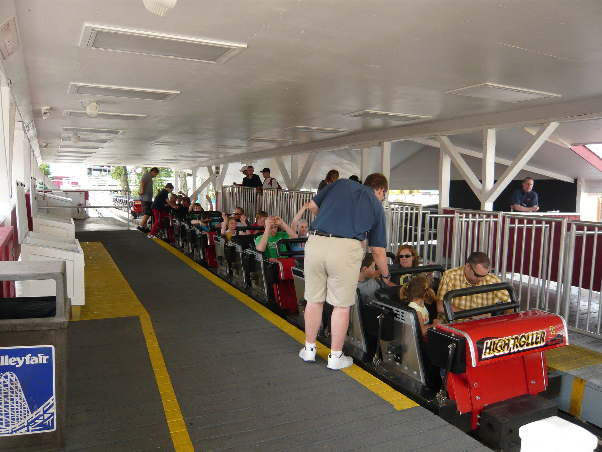 Von meinem Standort aus näher als Renegade lag der Eingang zum Woodie-Klassiker High Roller, ein wenig im Kinderbereich Planet Snoopy versteckt. Also habe ich den Woodie-Einstieg 2012 dann hier mit einer Fahrt in der Mittelreihe des letzten Sechserwaggons im Zug unternommen. Die Züge sind schon etwas älteren Datums, bergen gewisse Ähnlichkeit mit denen auf Thunderbolt in Kennywood, sind aber doch anders. Gesichert wird man mit einem gemeinsamen Gurt pro Sitzreihe und einem Buzzbar, der etwa zehn Zentimeter über den Beinen einrastet. Ausserdem wird die ganze Waggonseite (an den Ein- und Ausstiegslücken quasi) noch mit weiteren Gurten gesichert, die sind hinten meiner Erinnerung nach aber gar nicht zum Einsatz gekommen.