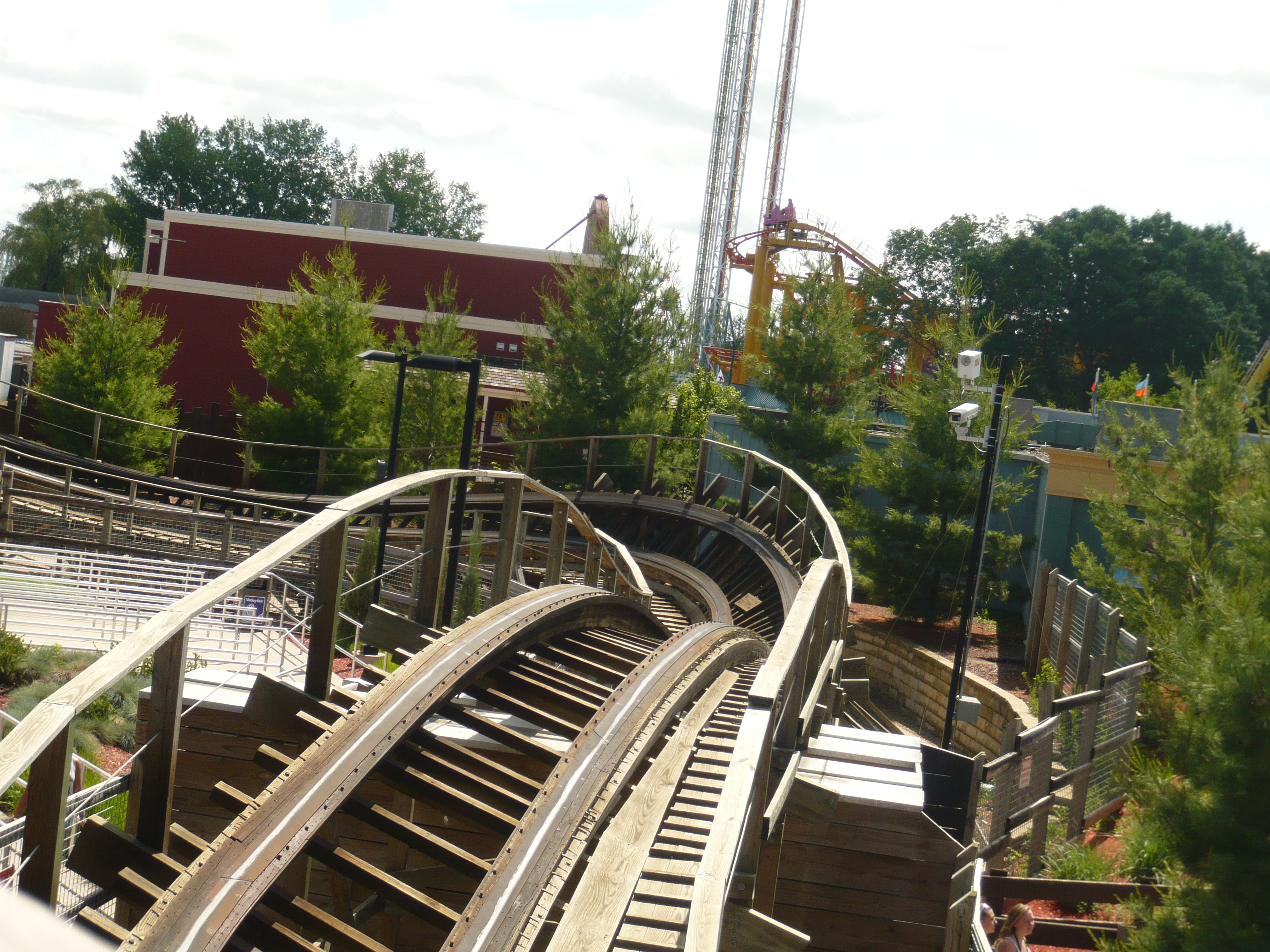 Von aussen her erkennt man wenig von der Bahn, da der Grossteil der ohnehin sehr kurzen Strecke hinter Bäumen verborgen ist. Und das was man sieht und hört ist nicht unbedingt vertrauenserweckend - dabei ist dieser zu gross geratene Minetrain auf Holzstützen eigentlich ganz prima! Wer Cedar Points Gemini schätzt, wird Excalibur ebenfalls mögen - die Machart, die ungefähren Grössendimensionen, die Züge und auch die Fahrweise sind praktisch identisch. Über den