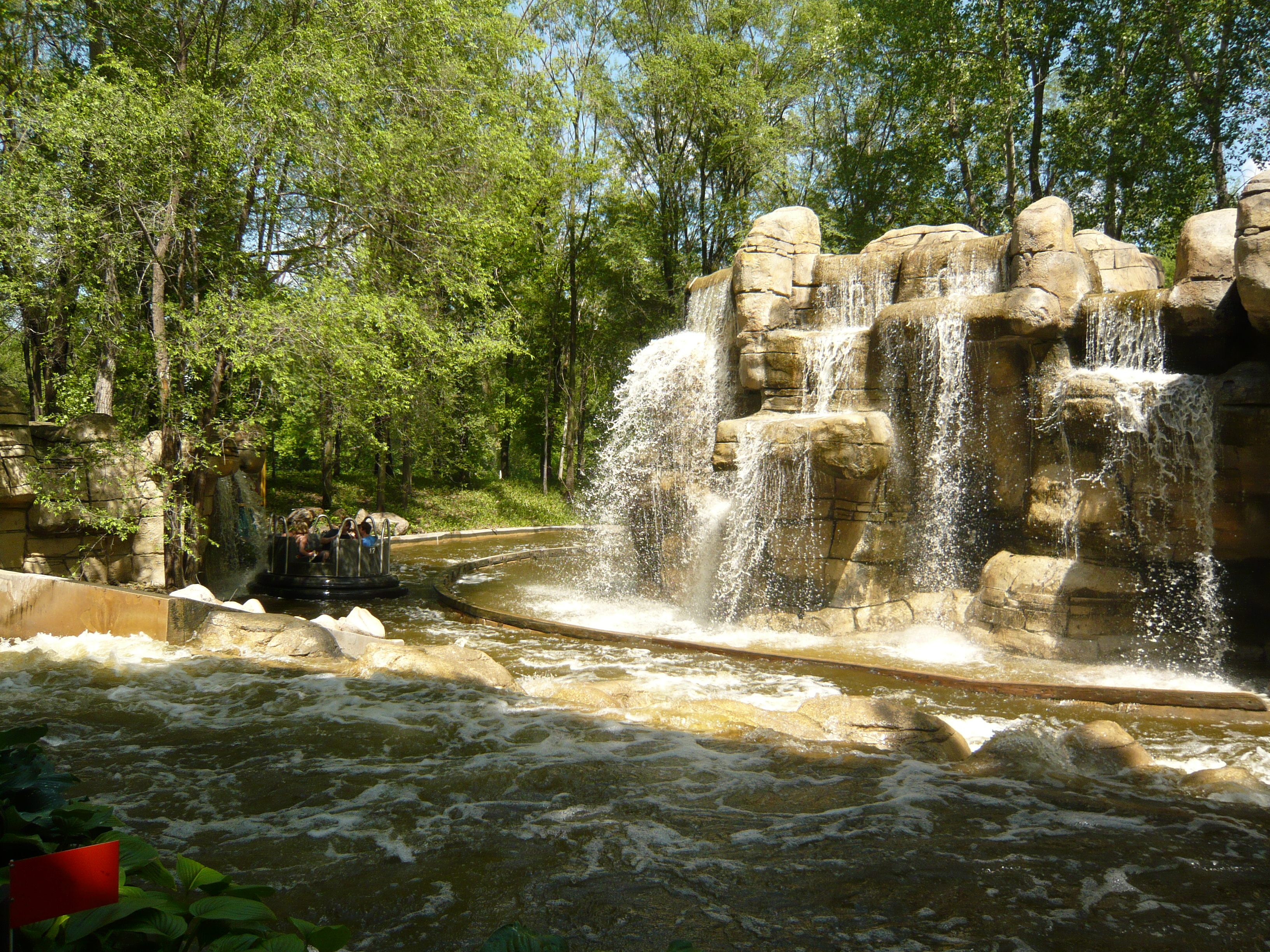 Gleich vor der erwähnten Unterführung befindet sich der kleine Wasserparkteil. Die Raftingrutsche ragt derart in den normalen Freizeitpark hinein, dass man da irgendwie immer wieder vorbeiläuft. Obwohl es ja eher kühl war, haben die Rutschen am Nachmittag alle den Betrieb aufgenommen und auch stolzen Zulauf gehabt. Kurz nach Mittag ist es ohnehin merklich voller geworden im Park.