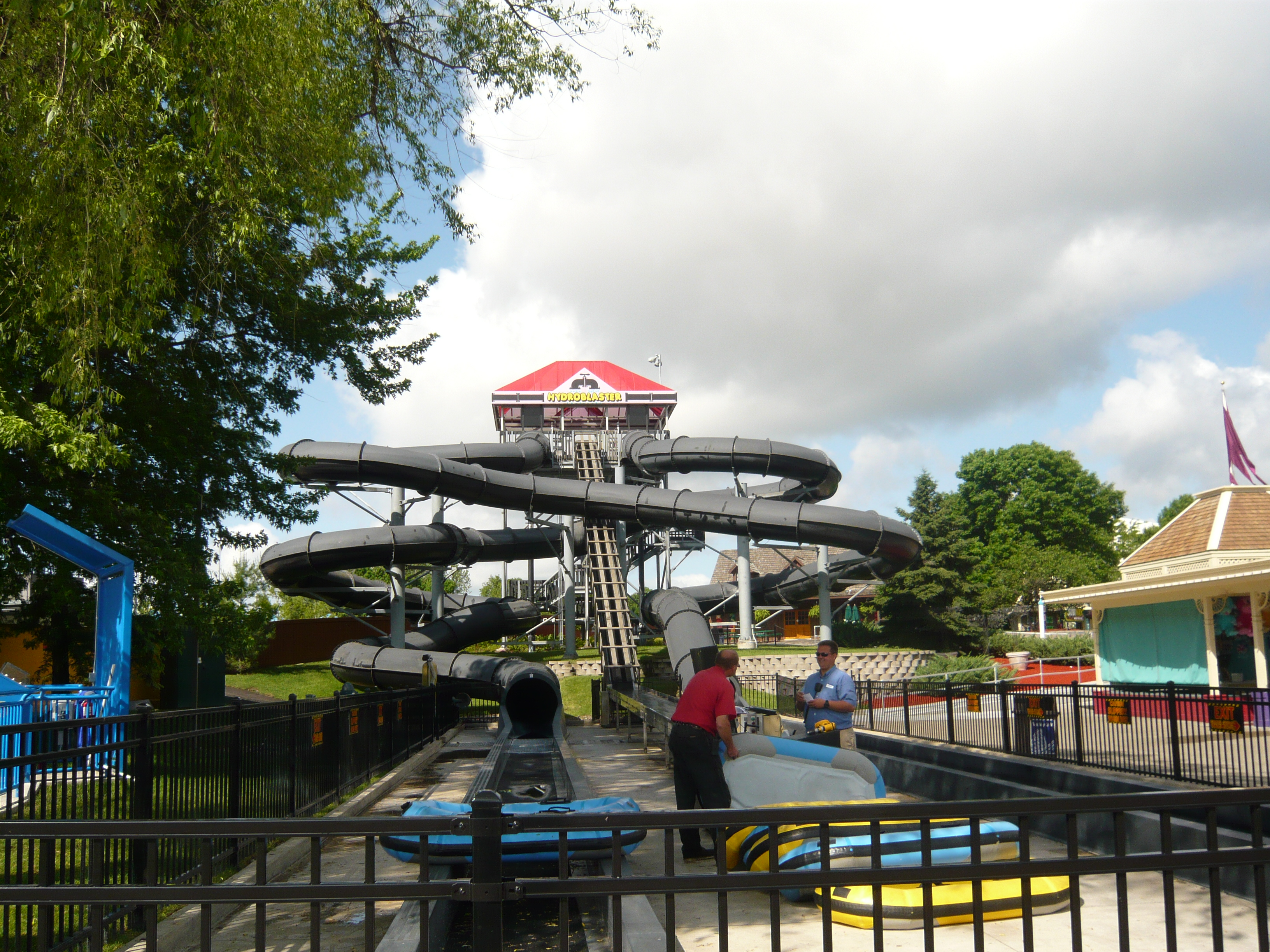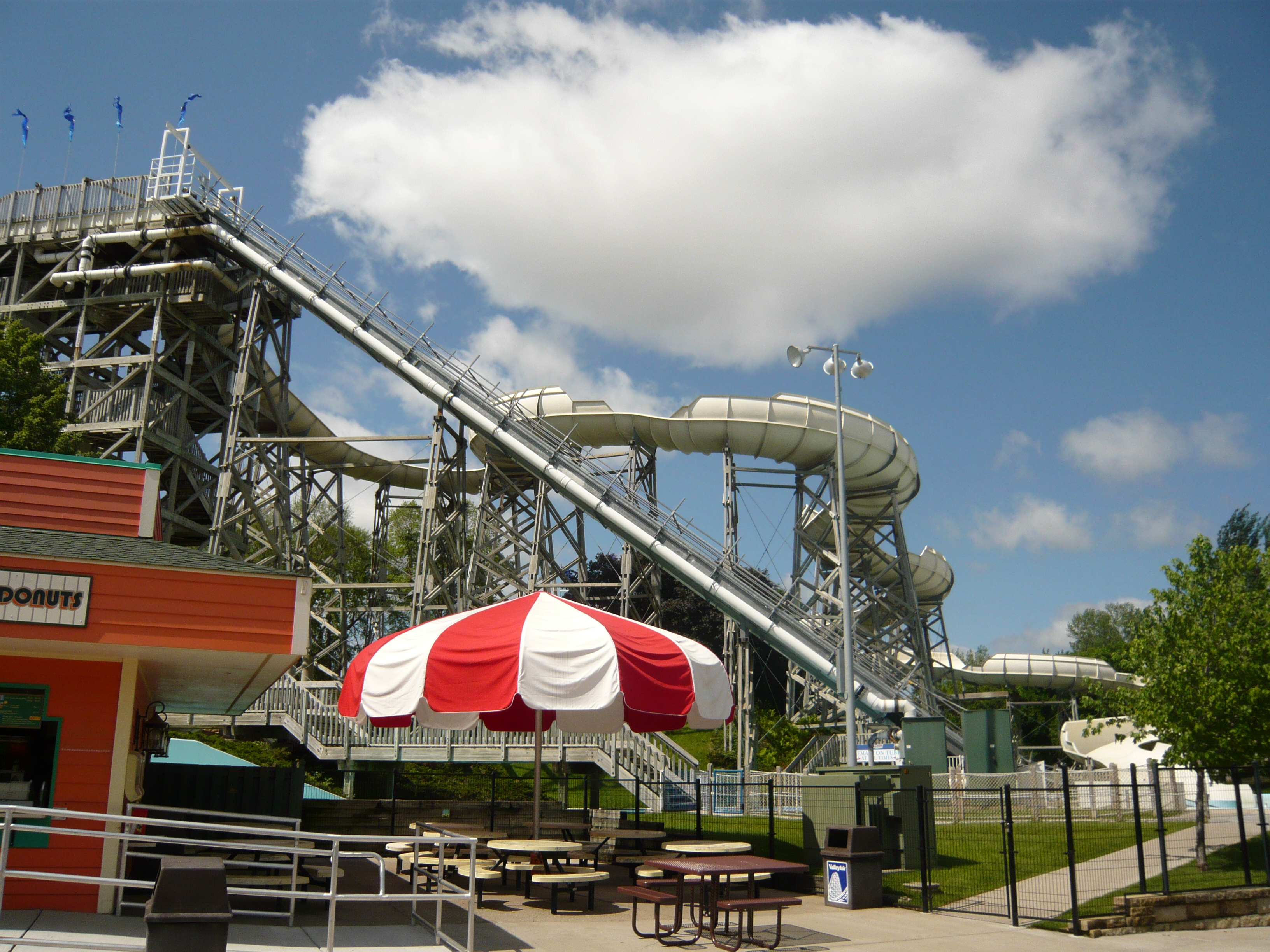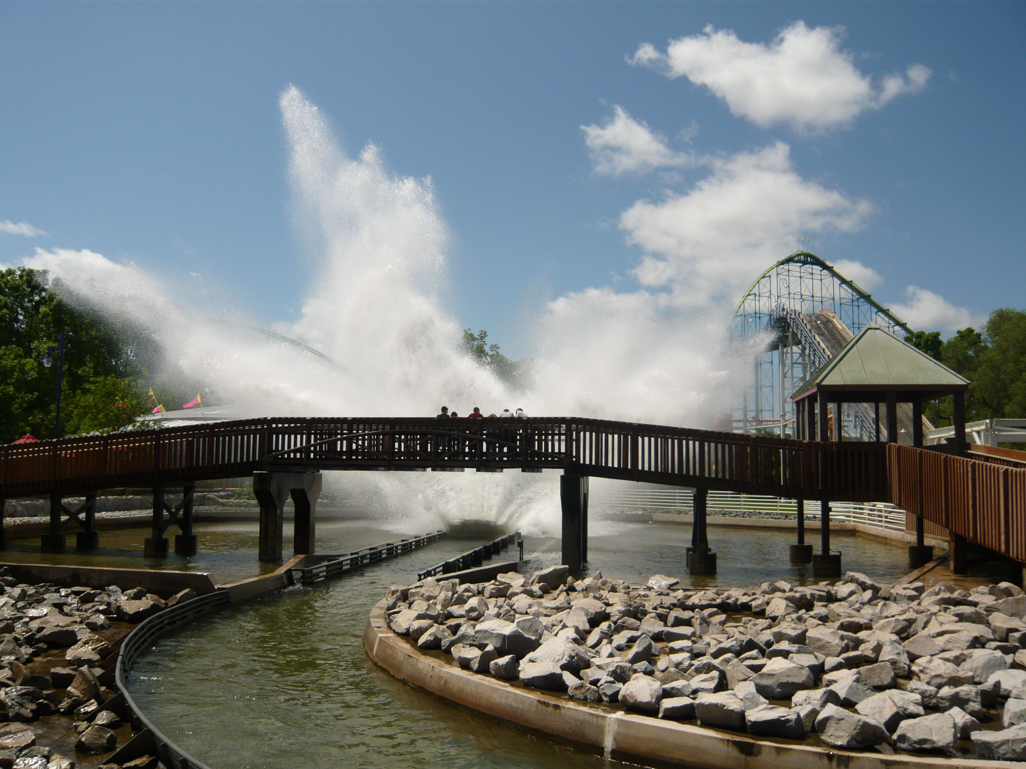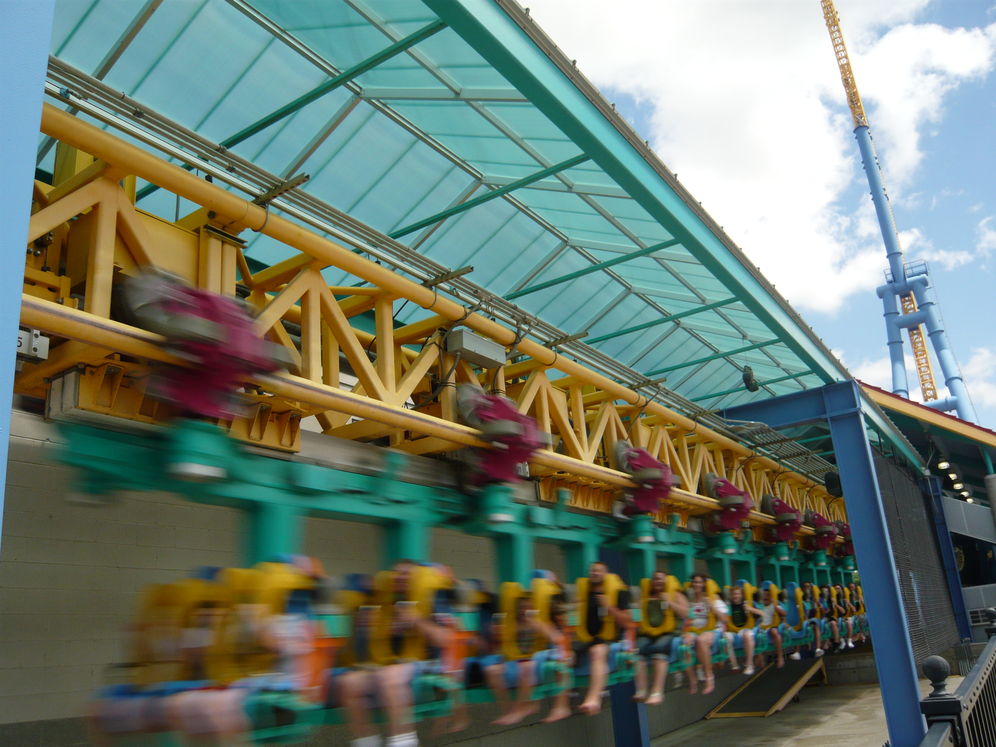 Eigentlich war mir schon bekannt, dass Amis beim Betreiben ihrer Top Spins generell nicht wasserscheu sind, aber ein derartiges Drenching-Ausmass wie beim hiesigen Exemplar Riptide habe ich trotzdem noch nie gesehen! Alle Passagiere sind hier aus unübersehbar guten Beweggründen nur in Badekleidung mitgefahren.