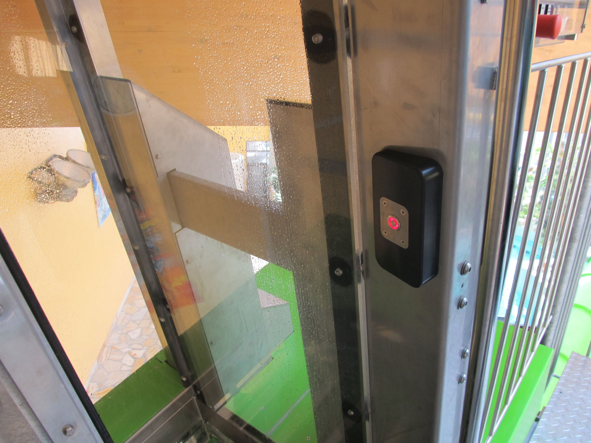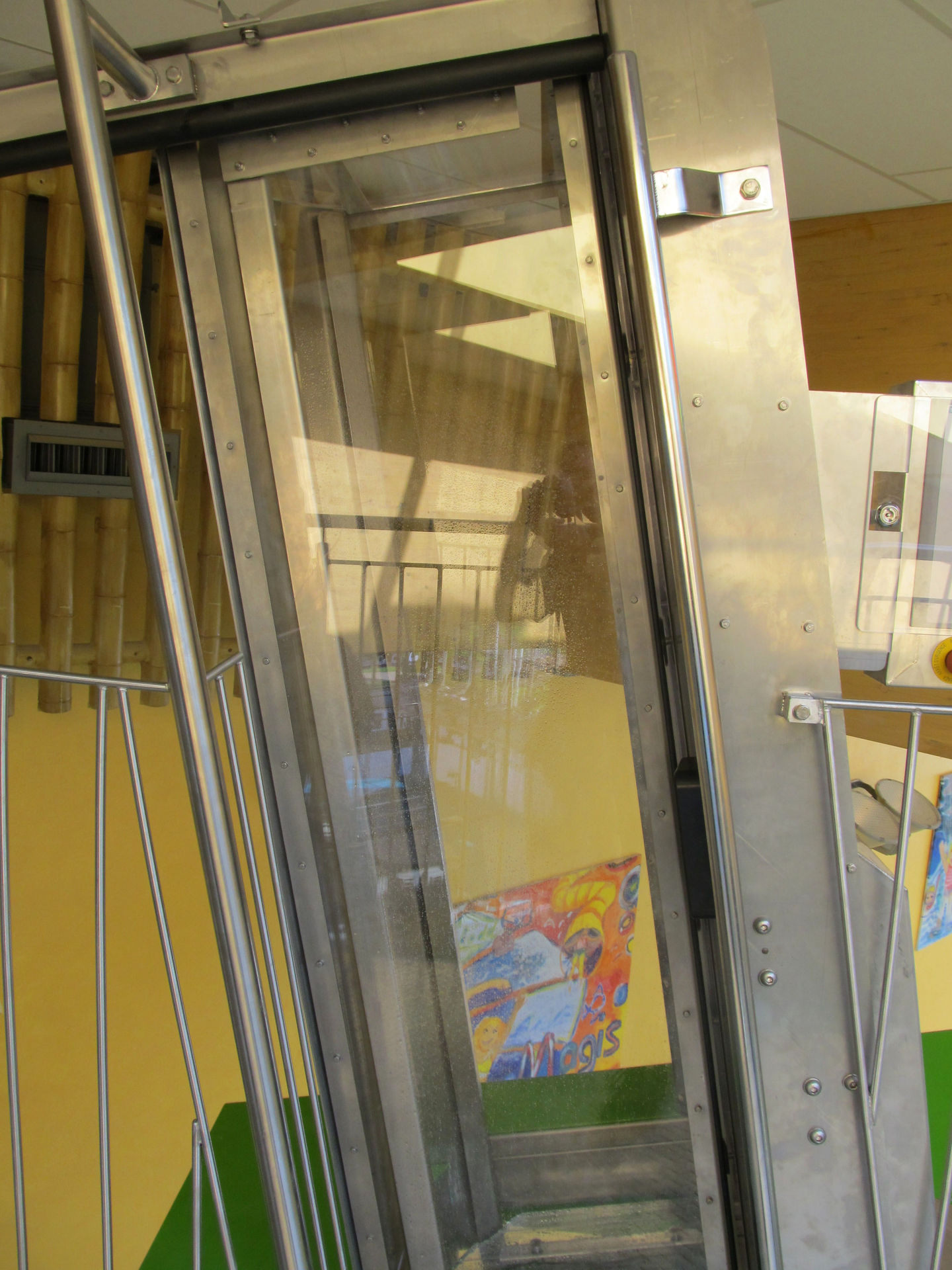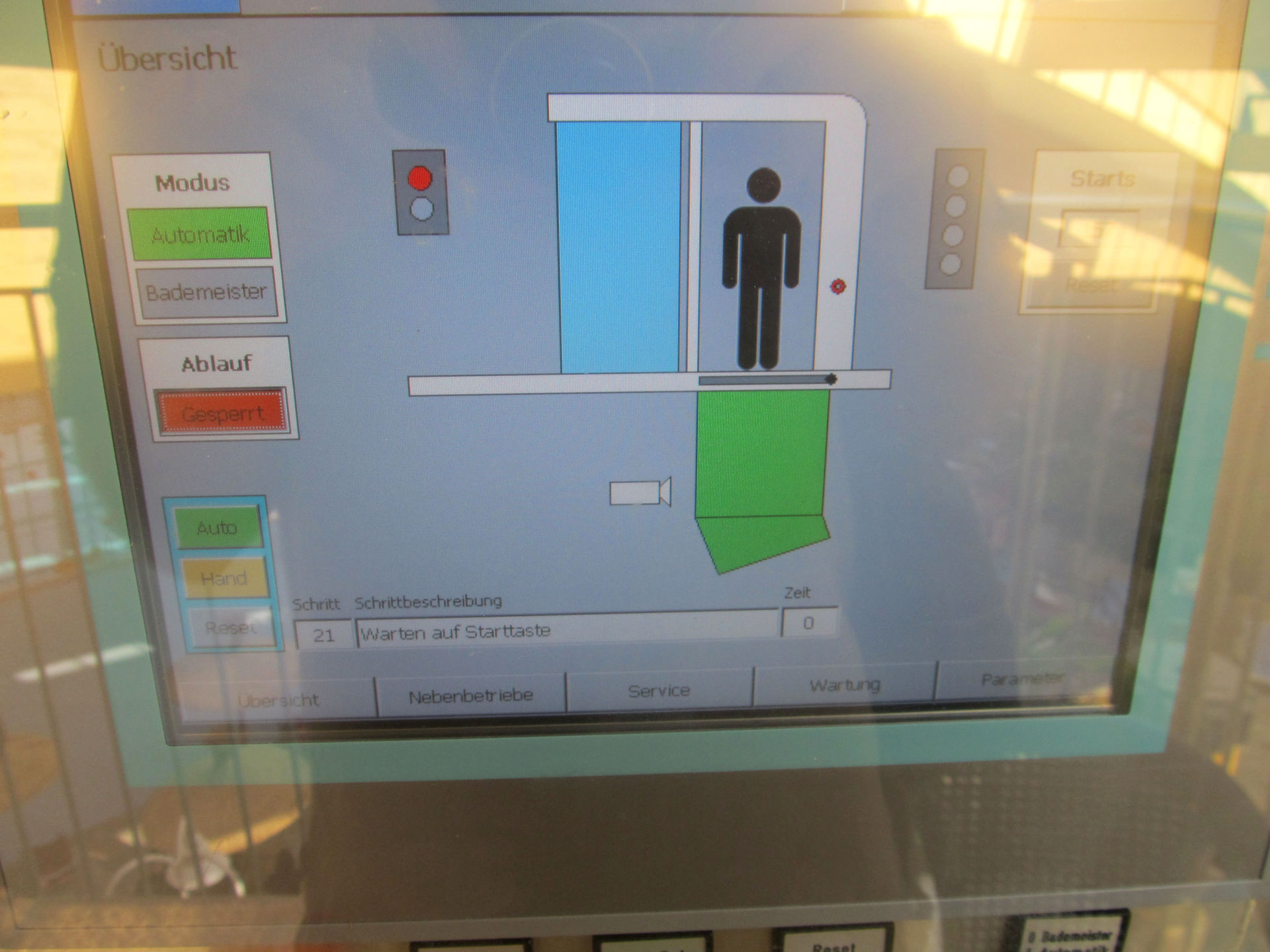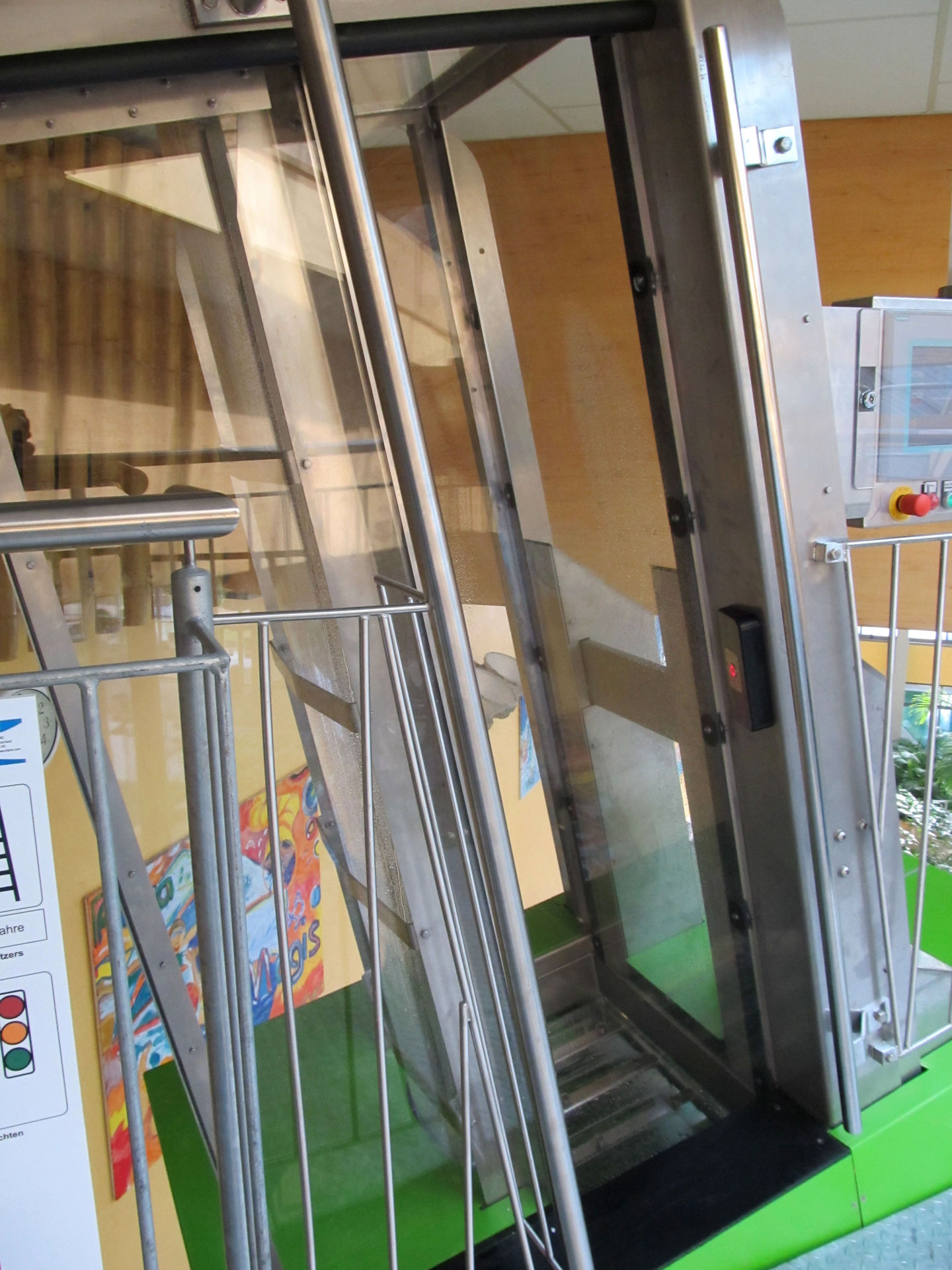 Nach Knopfdruck schließt sich die Schiebetüre, mehre farbige Lampen signalisieren den Countdown und schön öffnet sich die Falltüre