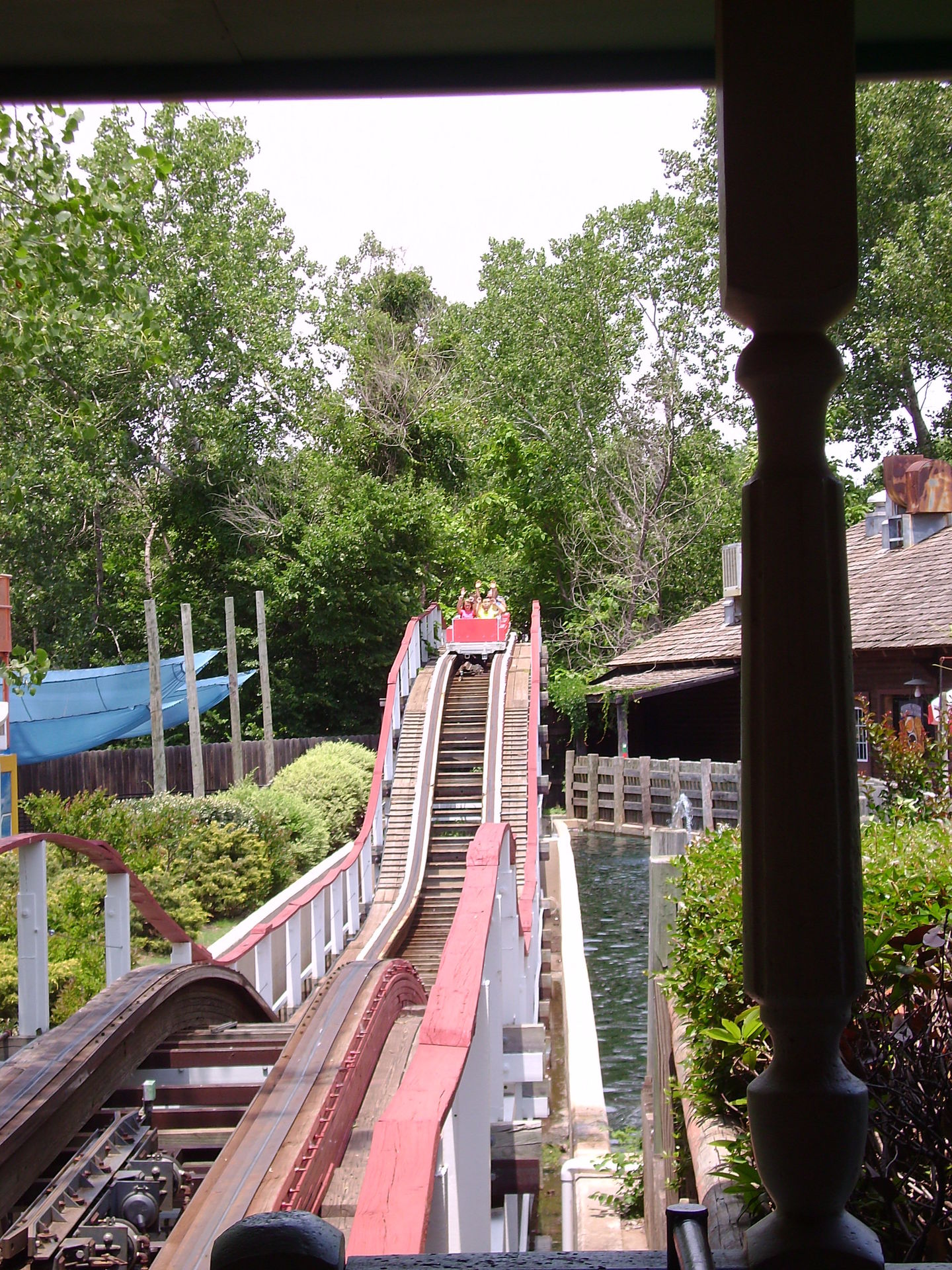 Jetzt ist allerdings eine Erfrischung nötig, denn es ist heute wieder brüllend heiß. Wir fahren also eine Runde auf dem Renegade Rapids und hängen einen Trocknungsspaziergang durch den Park an, bei der wir uns auf die Suche nach der letzten von uns ungefahrenen Achterbahn machen.