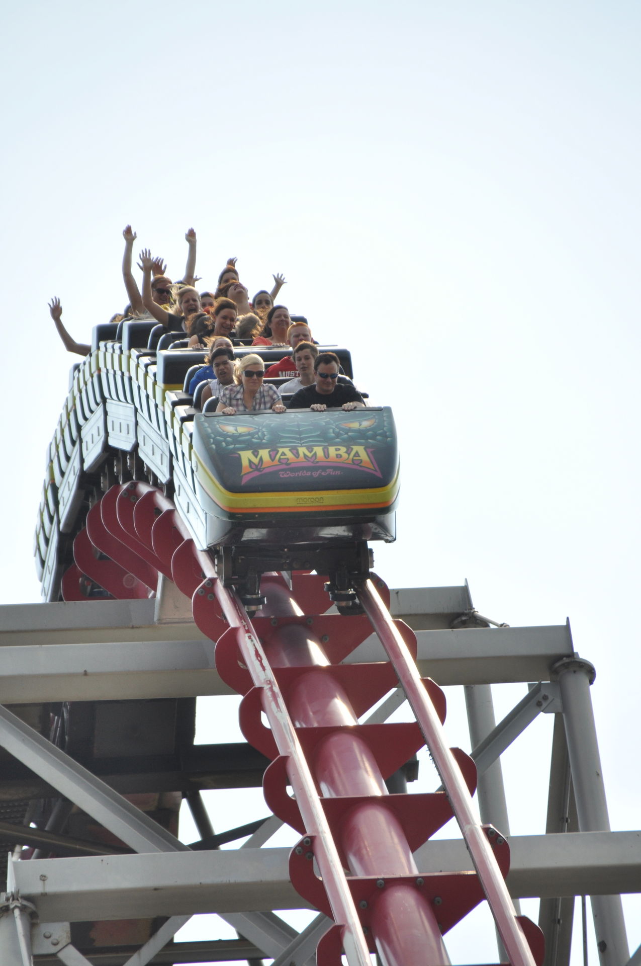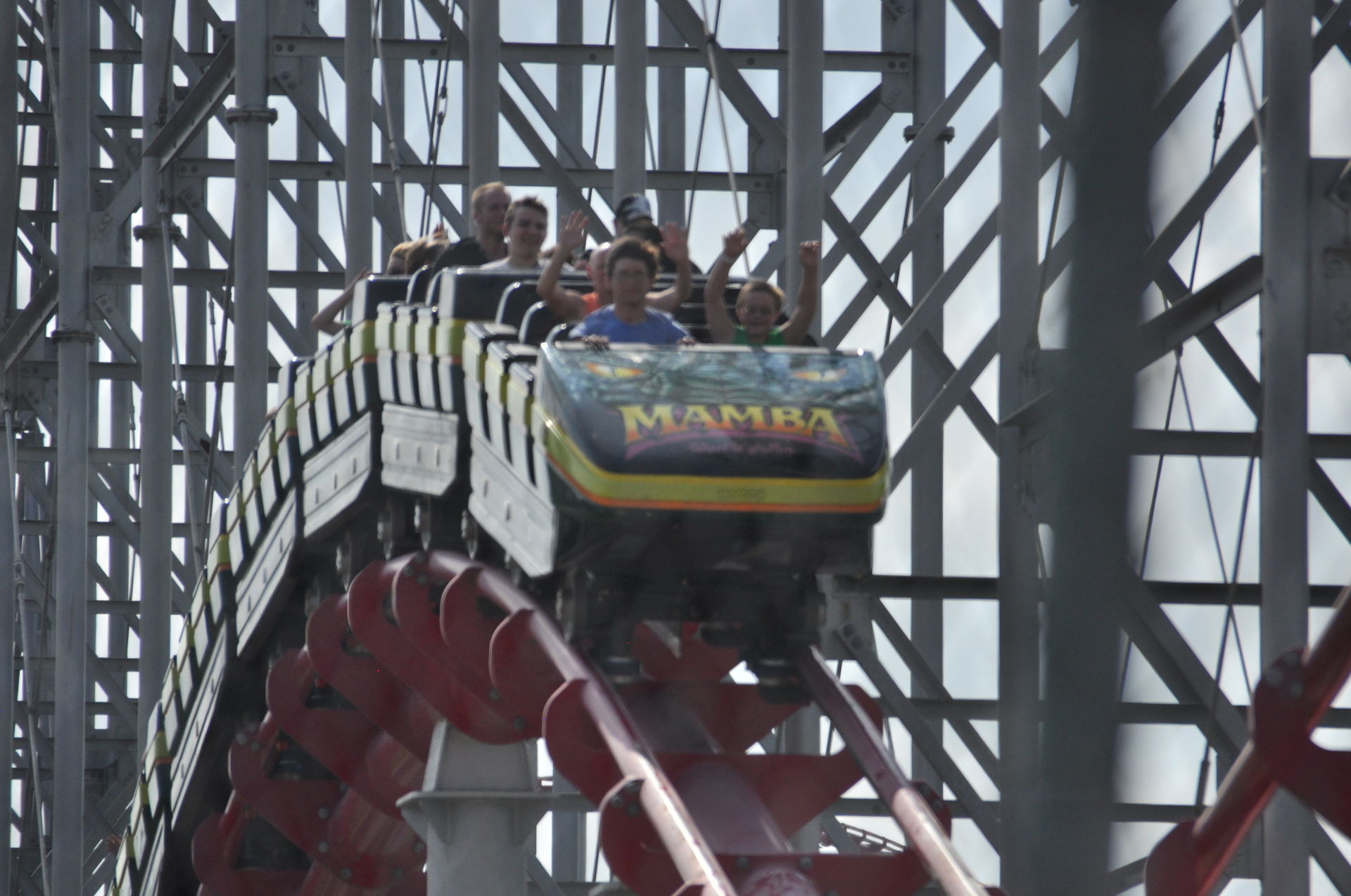 Die Fahrt auf Timber Wolf war eher ernüchternd, zumal wir die Bahn auch nach Prowler gefahren sind. Das Layout bietet (ausser der Anblick auf die daneben stehende Mamba) keine Besonderheiten, und die Fahrt ist auch nicht besonders sanft, auch wenn es noch schlimmer geht.
