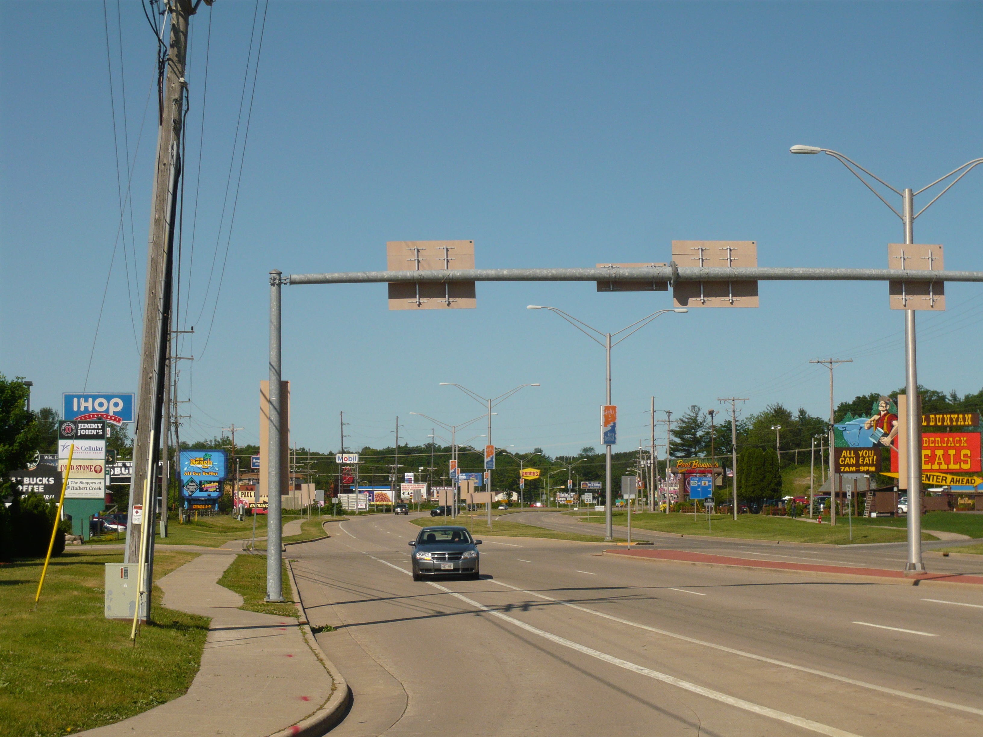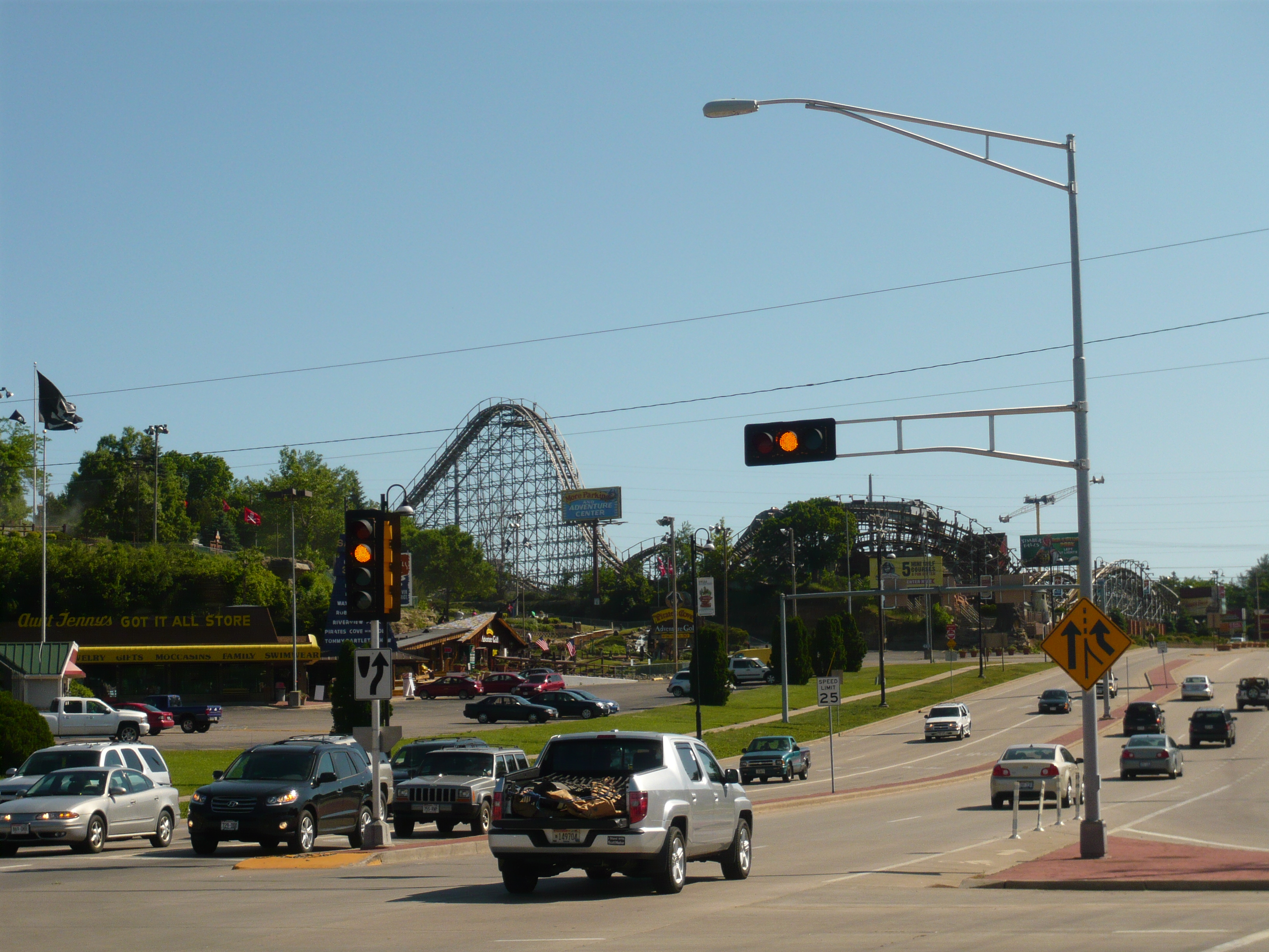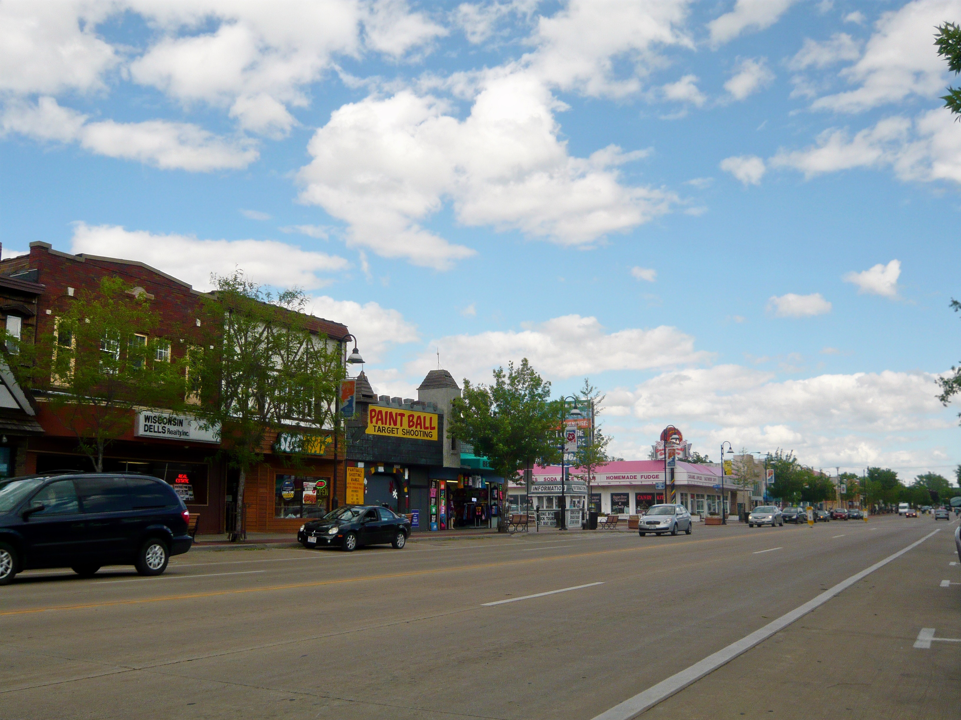 Das hier ist die Innenstadt von Wisconsin Dells. Die schon am Parkway anzutreffende Ansammlung von Touristen-Nepp wie Grusel-Walkthroughs, Kuriositätenmuseen, Kartbahnen, Rummelplätzchen, Souvenir-Emporien, Erlebnisrestaurants und dergleichen mehr setzt sich hier nahtlos fort.
