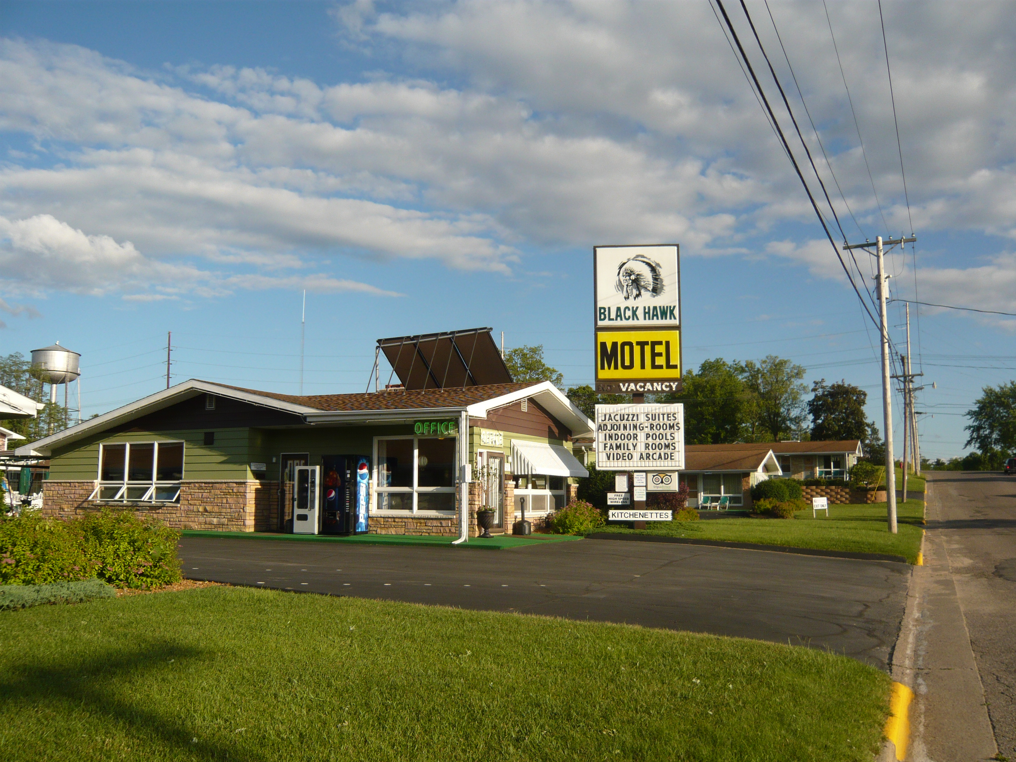 Die erste Nacht verbrachte ich in einem sehr guten Best Western, die zweite dann im herrlich amerikanischen und durch Tripadvisor zu Berühmtheit gelangten Black Hawk Motel. Von allen Hotels in Wisconsin Dells - was ja doch eine recht stolze Anzahl darstellt - ist dies dort eins der bestbewertetsten! Natürlich war ich gespannt darauf herauszufinden, wie sich dieses kleine No-Name-Motel gegen offenbar auch nicht allzu schäbig geratene Ableger einiger recht namhafter Ketten im Ort durchzusetzen vermochte. Die Antwort: durch eine wirklich schöne Reise in die Vergangenheit! Das fast schon ikonische Office an der Strasse, ein in der Nacht irgendwie beruhigend summendes Neonschild, Pool und Spielplatz in der Mitte, Parkplätze direkt vor der Zimmertür, Klappsessel daneben, Eismaschinen... Zu 100% so, wie man es aus alten Filmen kennt!