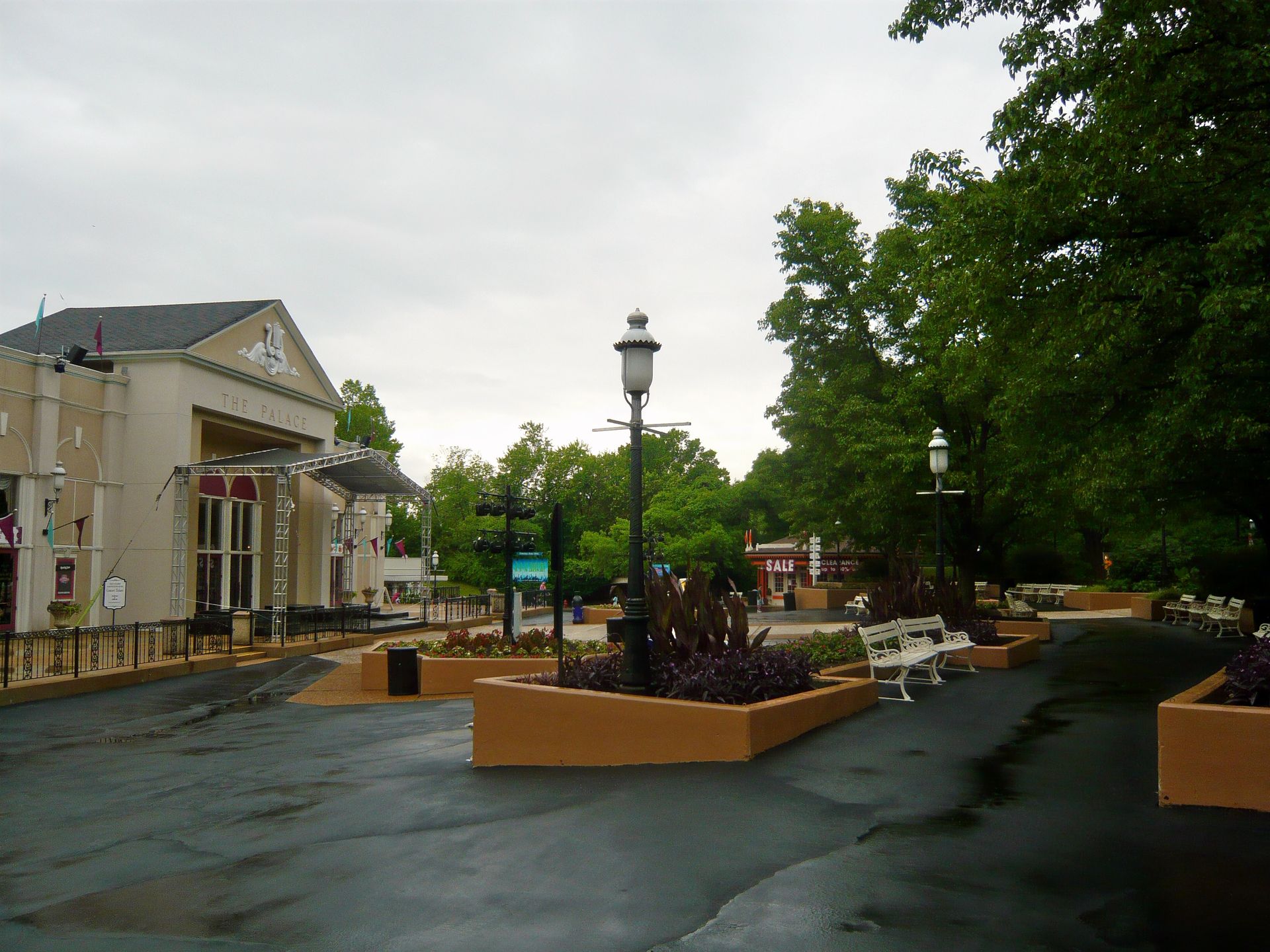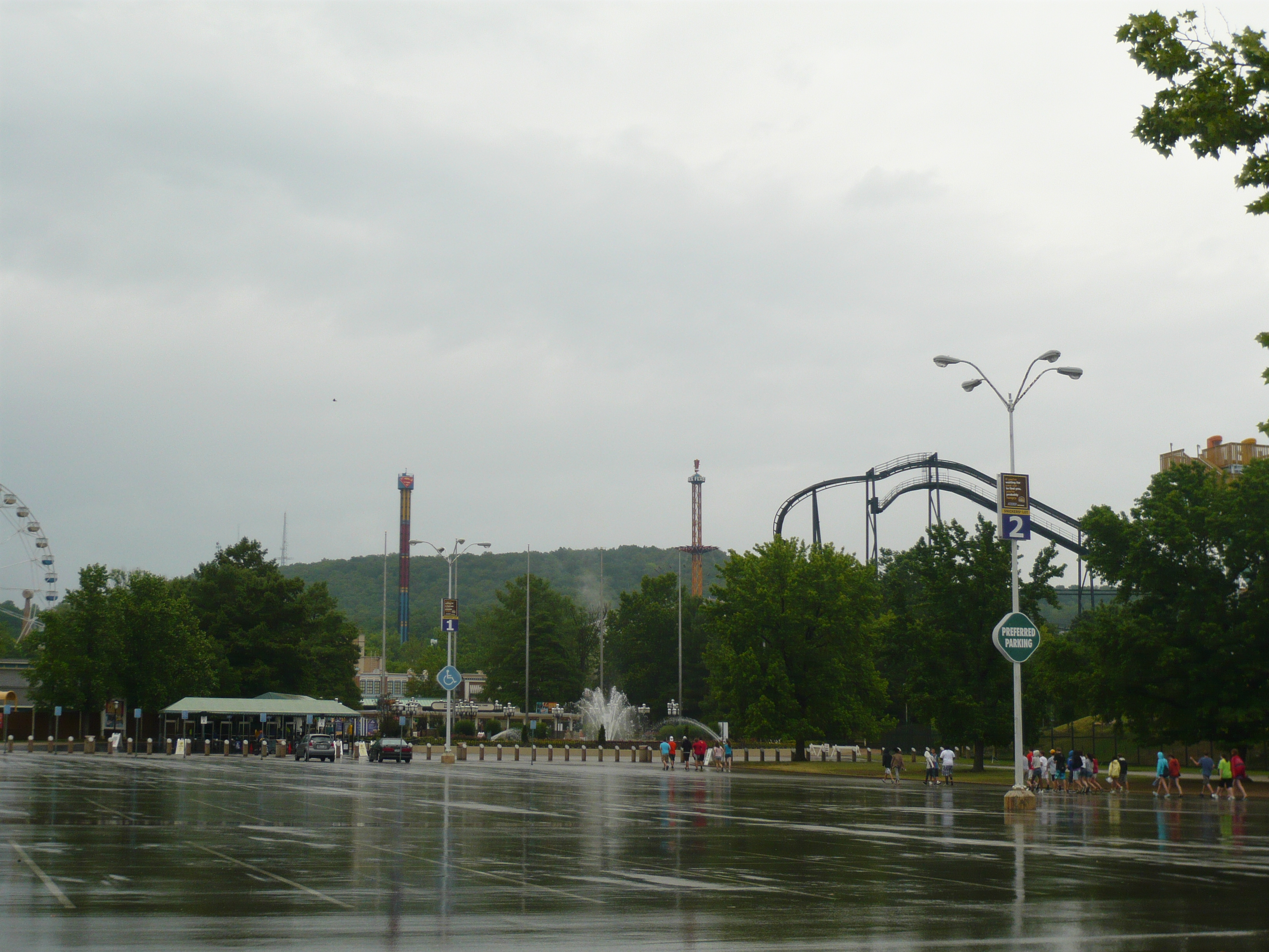 Nach unserem Zusammentreffen in Sunset Hills MO fuhren die Kollegen und ich tags darauf dann bei strömendem Regen ins knapp 17 Meilen entfernte Eureka, wo Six Flags St. Louis liegt. Auf der gesamten Fahrt fragten wir uns, ob es bei dem Wetter überhaupt etwas wird mit unserem Parkbesuch, so heftig prasselten die Wassertropfen auf unseren Kia. Als wir dann in die Ausfahrt abbogen, stellten wir fest, dass es mehrheitlich Spritzwasser von der Strasse gewesen sein muss und es gar nicht mehr so stark regnete. Bei der Parkplatzeinfahrt angekommen wandelte sich die Wetterlage sogar zu leichtem Nieselregen runter, und wir stellten fest, dass der Park offenbar ganz regulär den Betrieb aufnimmt. Also zahlten wir die Parkplatzgebühr (laut Screamscape ganz kurz nach unserem Besuch übrigens klammheimlich von 15 auf 18$ erhöht) und machten uns auf zum Parkeingang!
