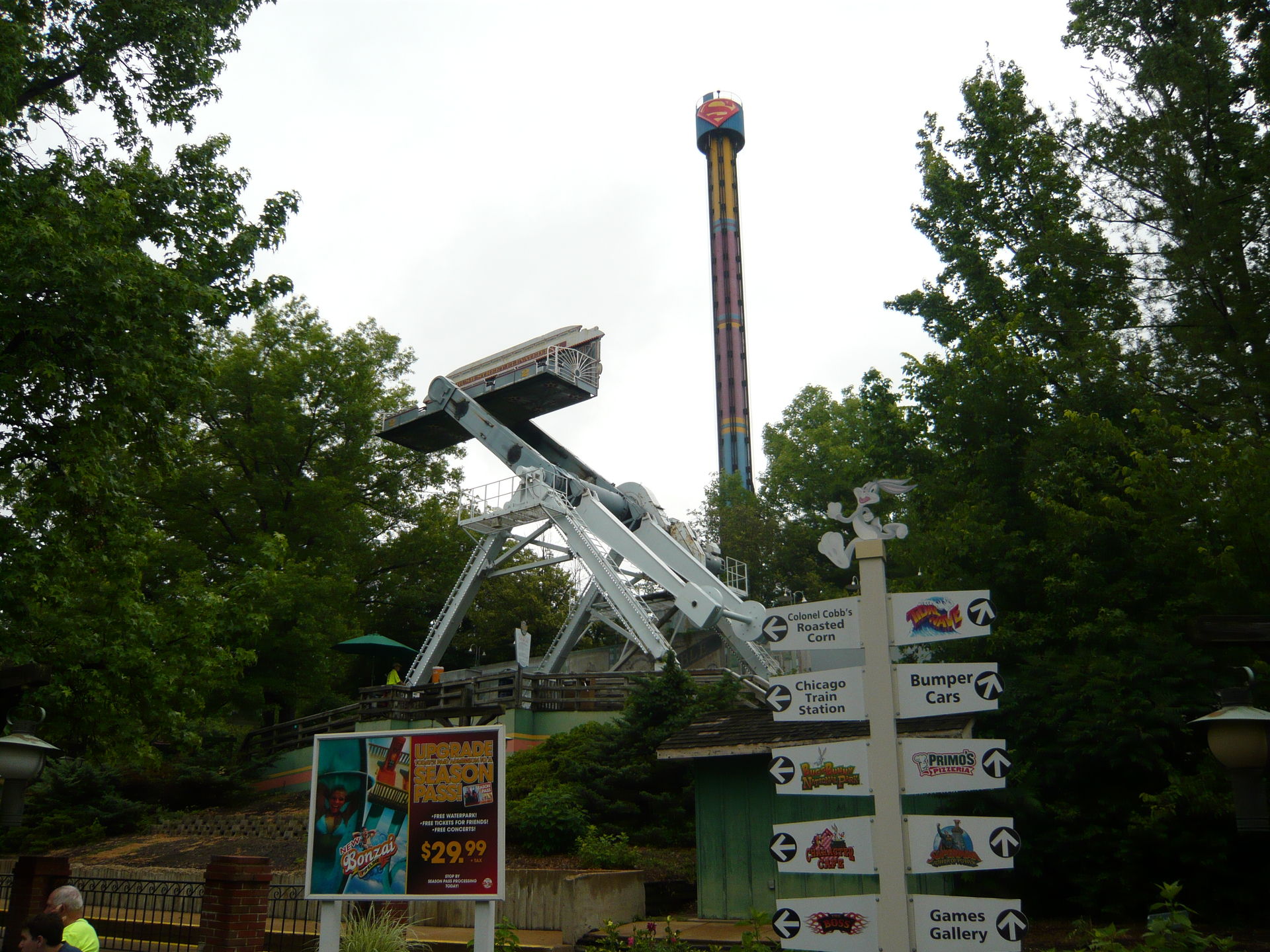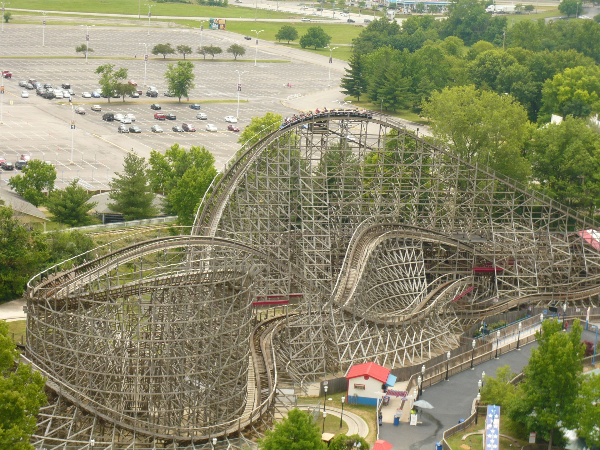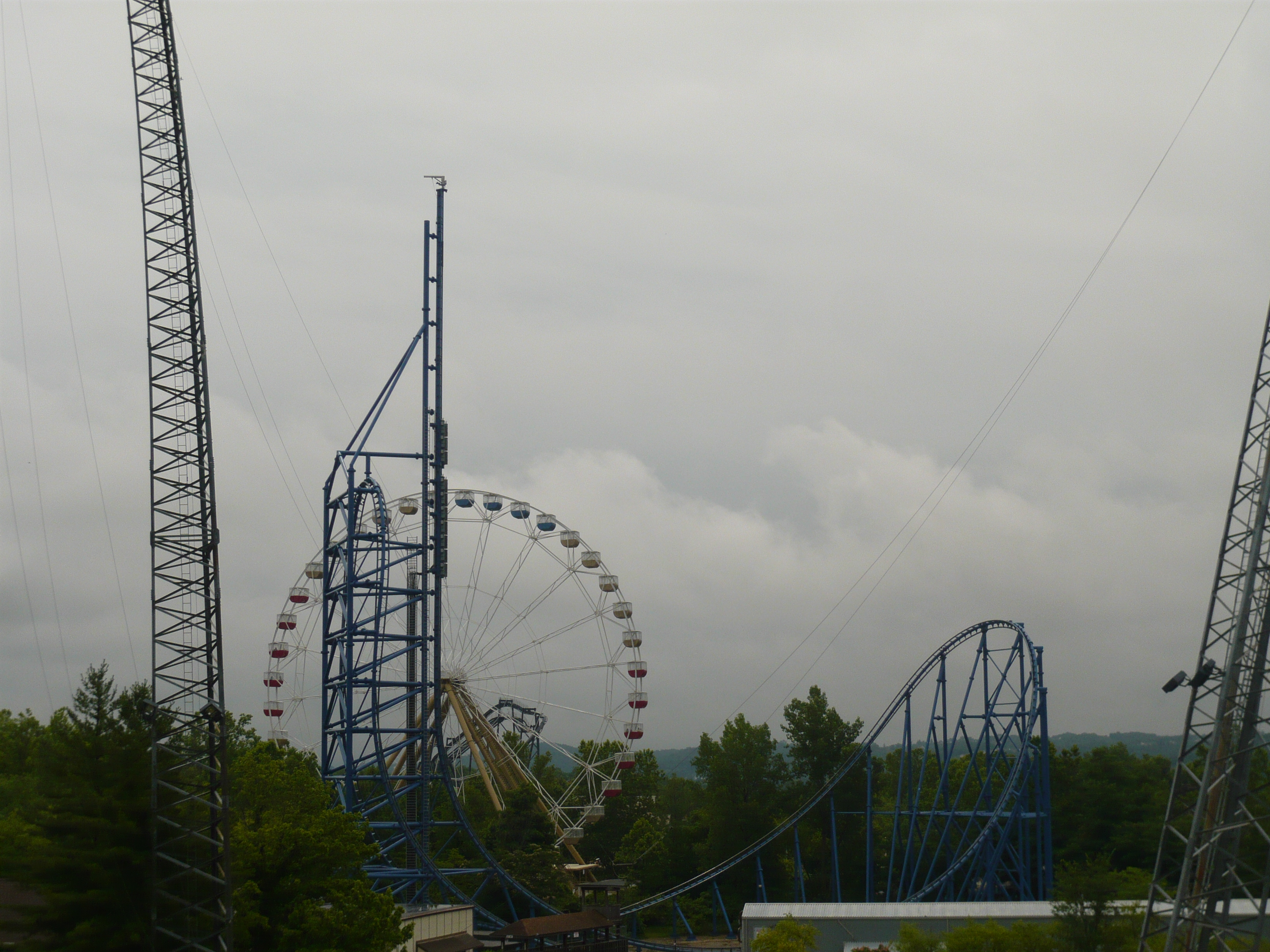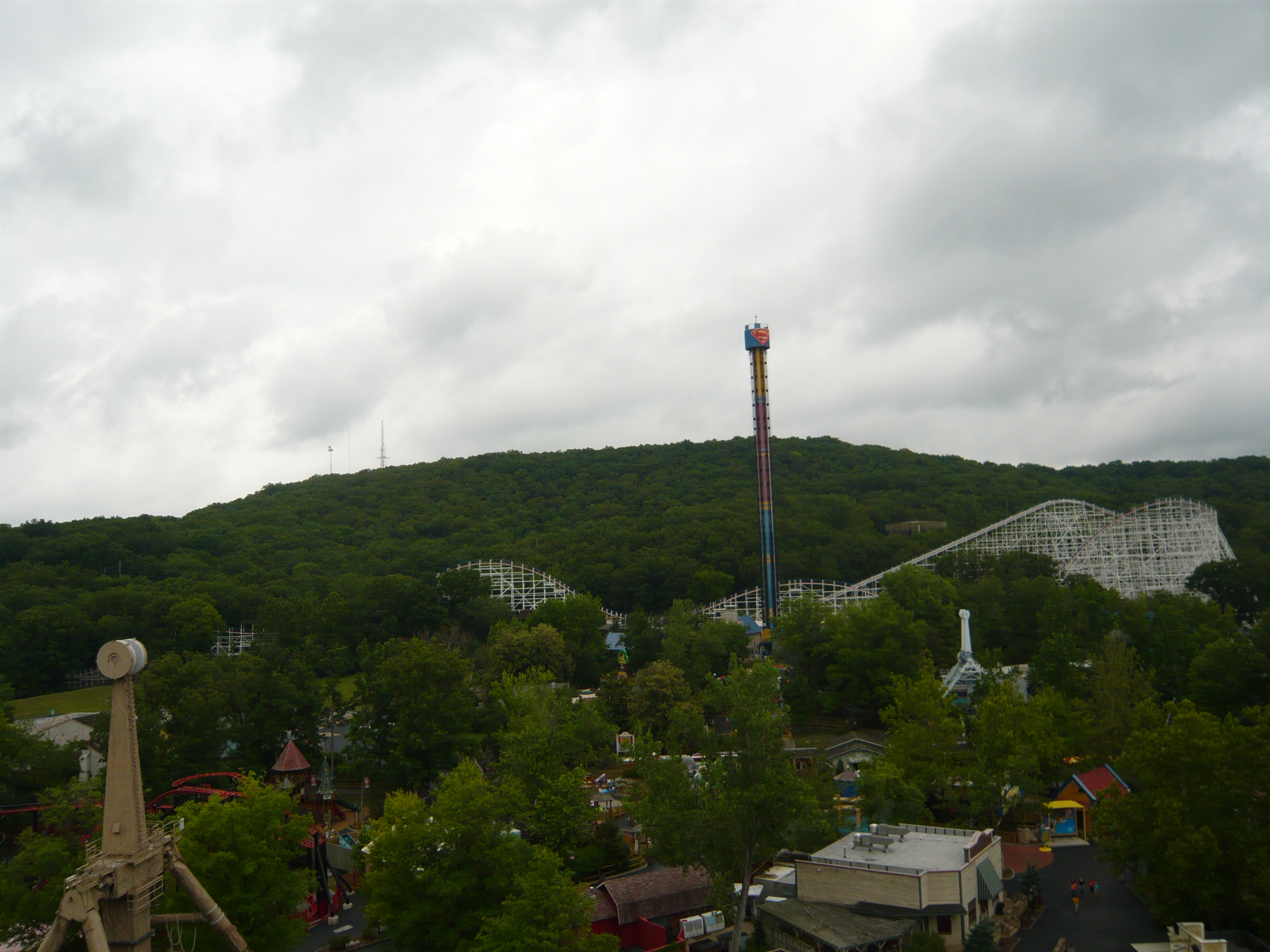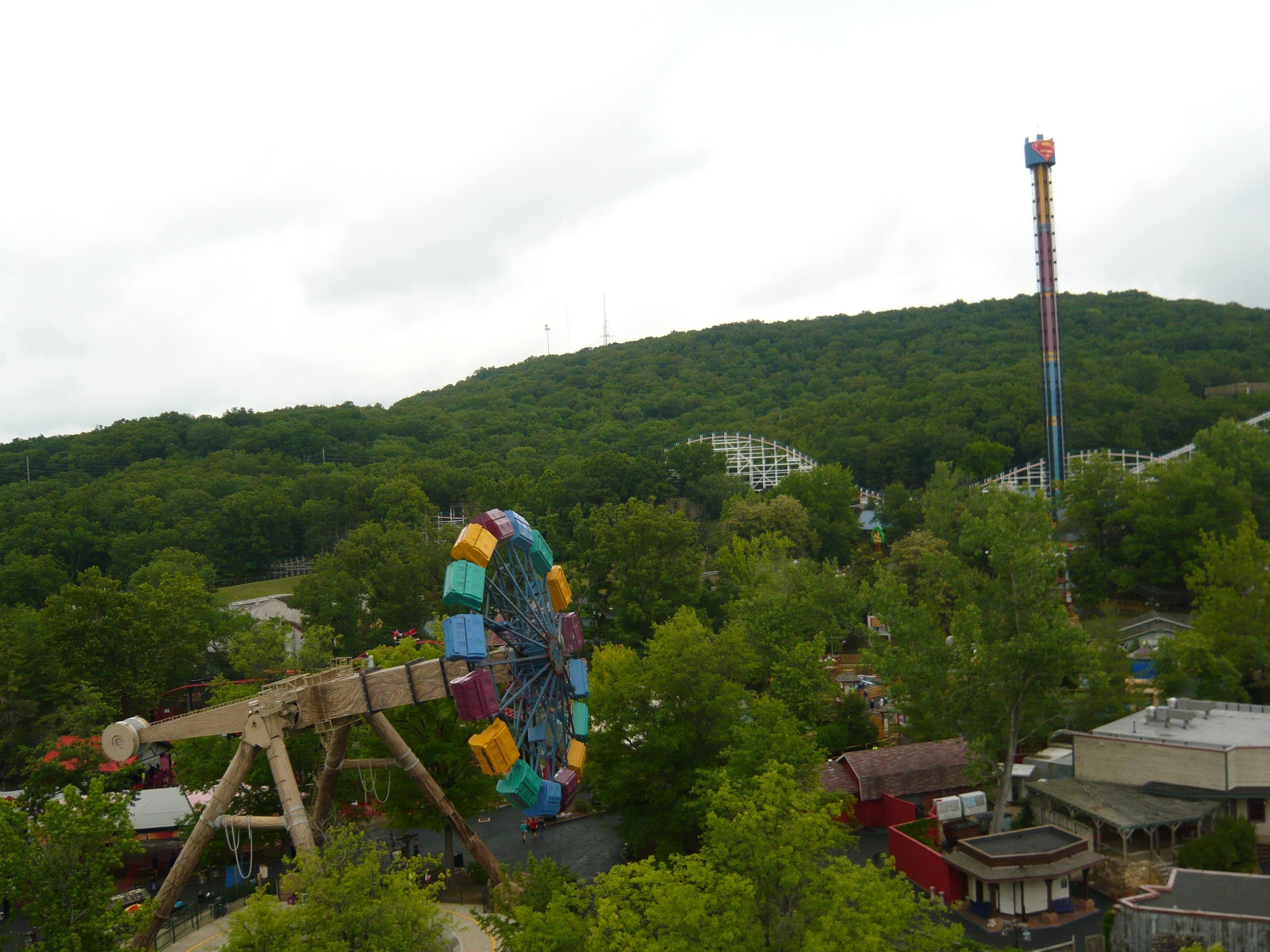 nicht auf den letzten Platz der Woodies in Six Flags St. Louis gehört! Darum drehten wir dort nochmals zwei Runden, zunächst mit einer Viertelstunde Wartezeit und dann noch eine mit gar keiner dank Sitzenbleiben, weil niemand an den Gates zu unseren Sitzreihen wartete. Im Anschluss gab es eine Runde Highland Fling (Schwarzkopf-Enterprise) und Riesenrad, wovon einige der im Bericht verwendeten Panorama-Fotos stammen. Von da oben sahen wir, dass Pandemonium nun endlich doch noch den Betrieb aufgenommen hat, also wagten wir dort auch noch eine Fahrt.