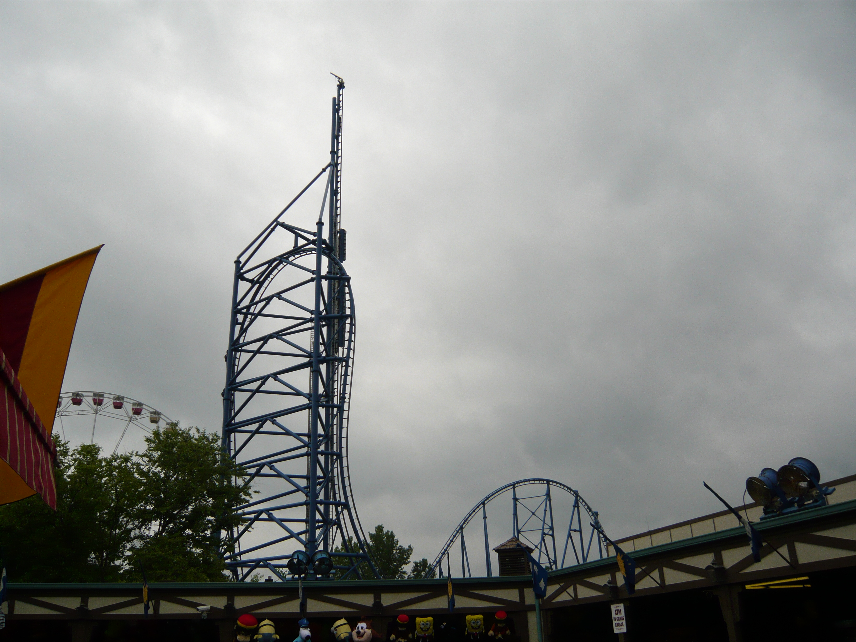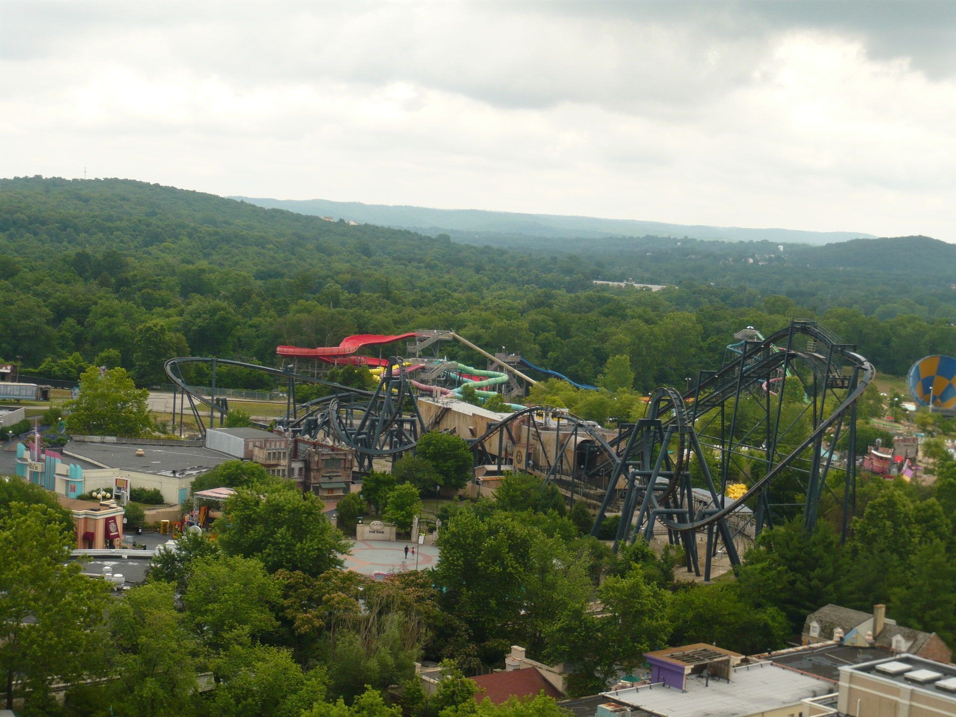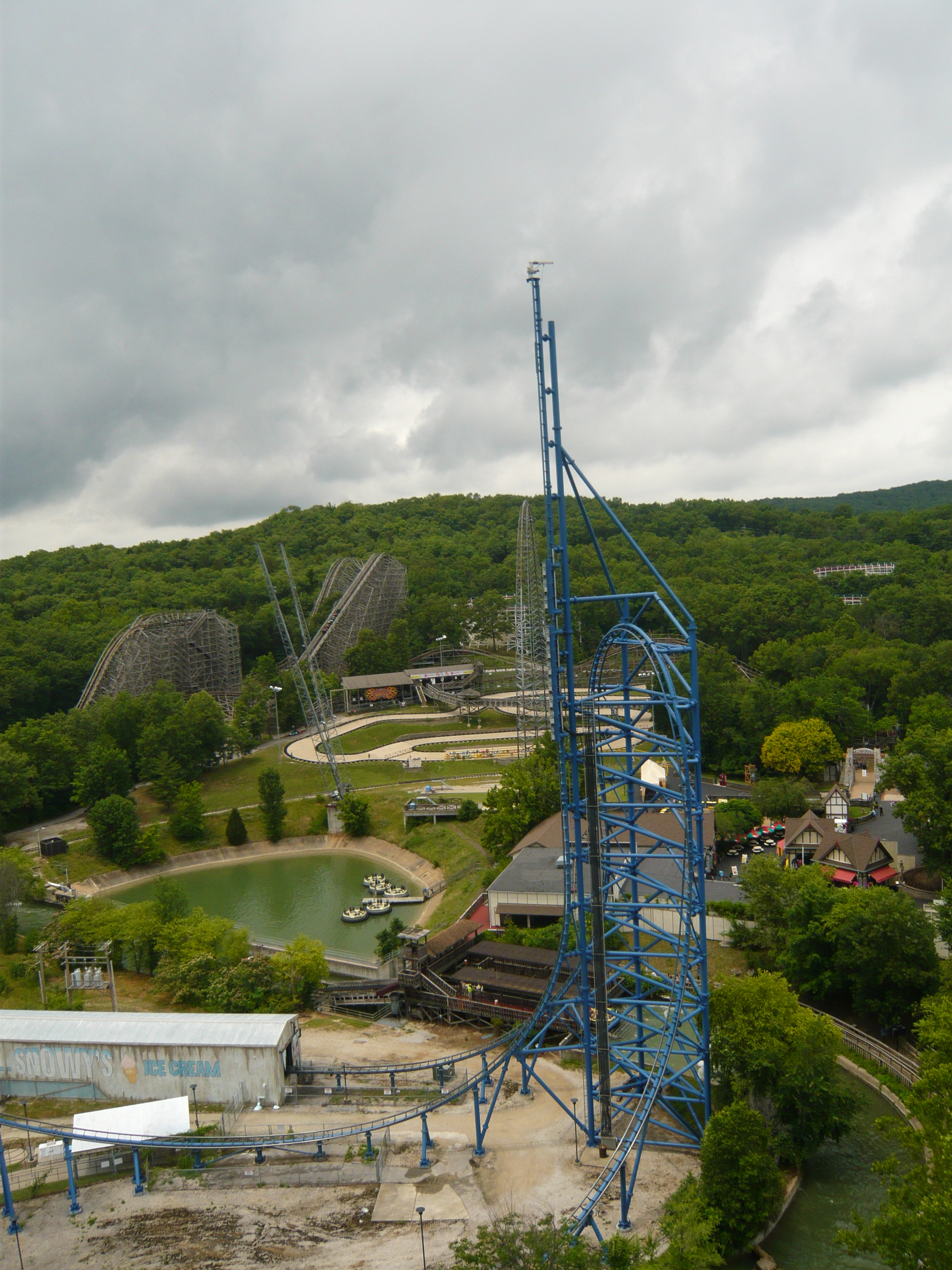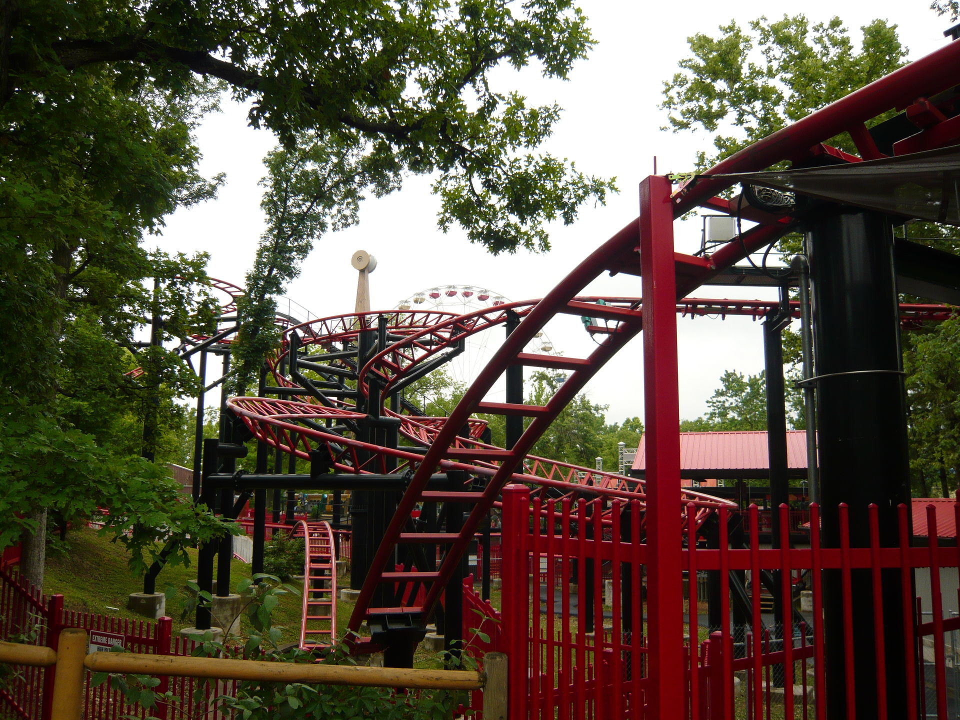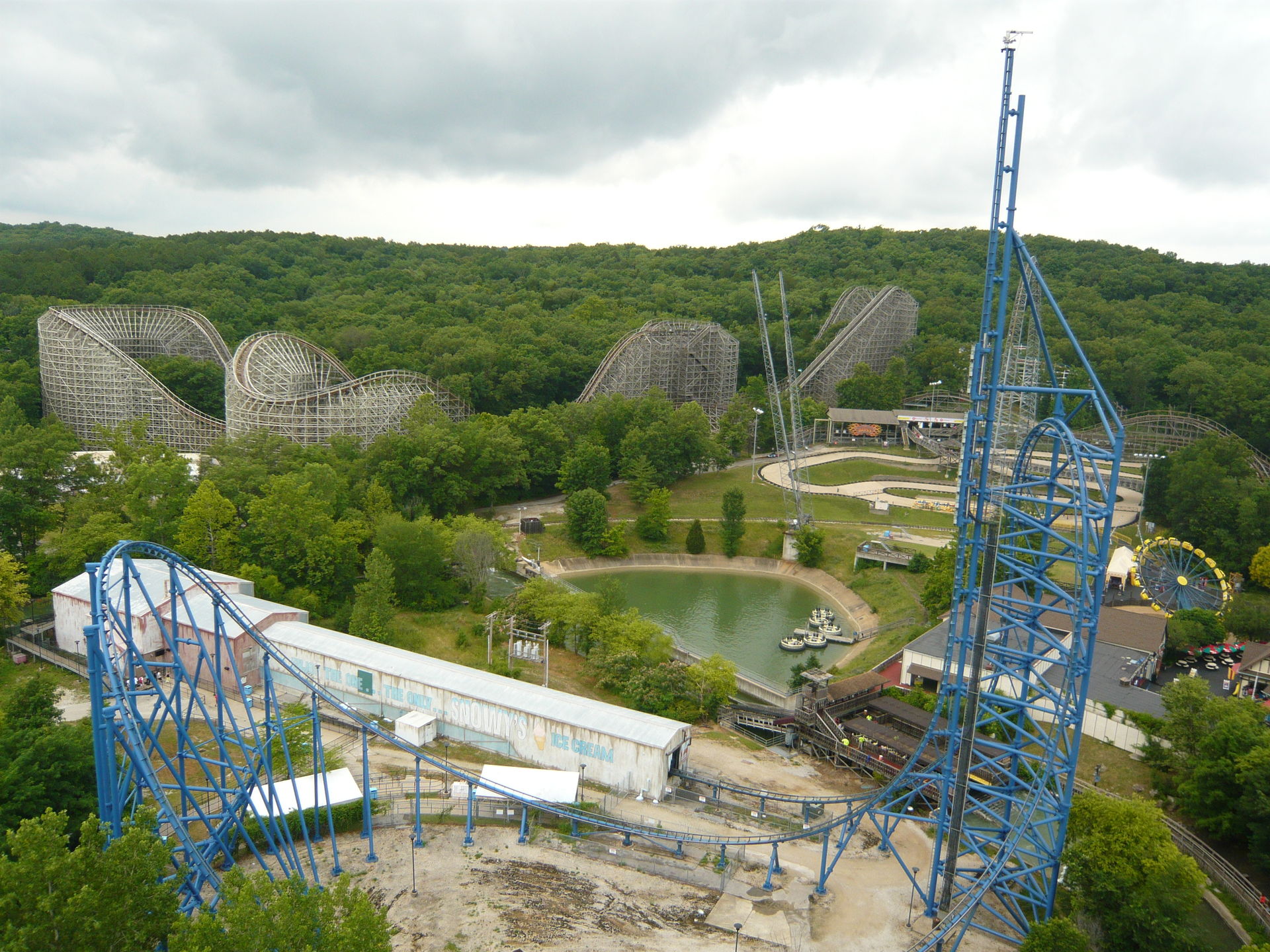 nicht auf den letzten Platz der Woodies in Six Flags St. Louis gehört! Darum drehten wir dort nochmals zwei Runden, zunächst mit einer Viertelstunde Wartezeit und dann noch eine mit gar keiner dank Sitzenbleiben, weil niemand an den Gates zu unseren Sitzreihen wartete. Im Anschluss gab es eine Runde Highland Fling (Schwarzkopf-Enterprise) und Riesenrad, wovon einige der im Bericht verwendeten Panorama-Fotos stammen. Von da oben sahen wir, dass Pandemonium nun endlich doch noch den Betrieb aufgenommen hat, also wagten wir dort auch noch eine Fahrt.