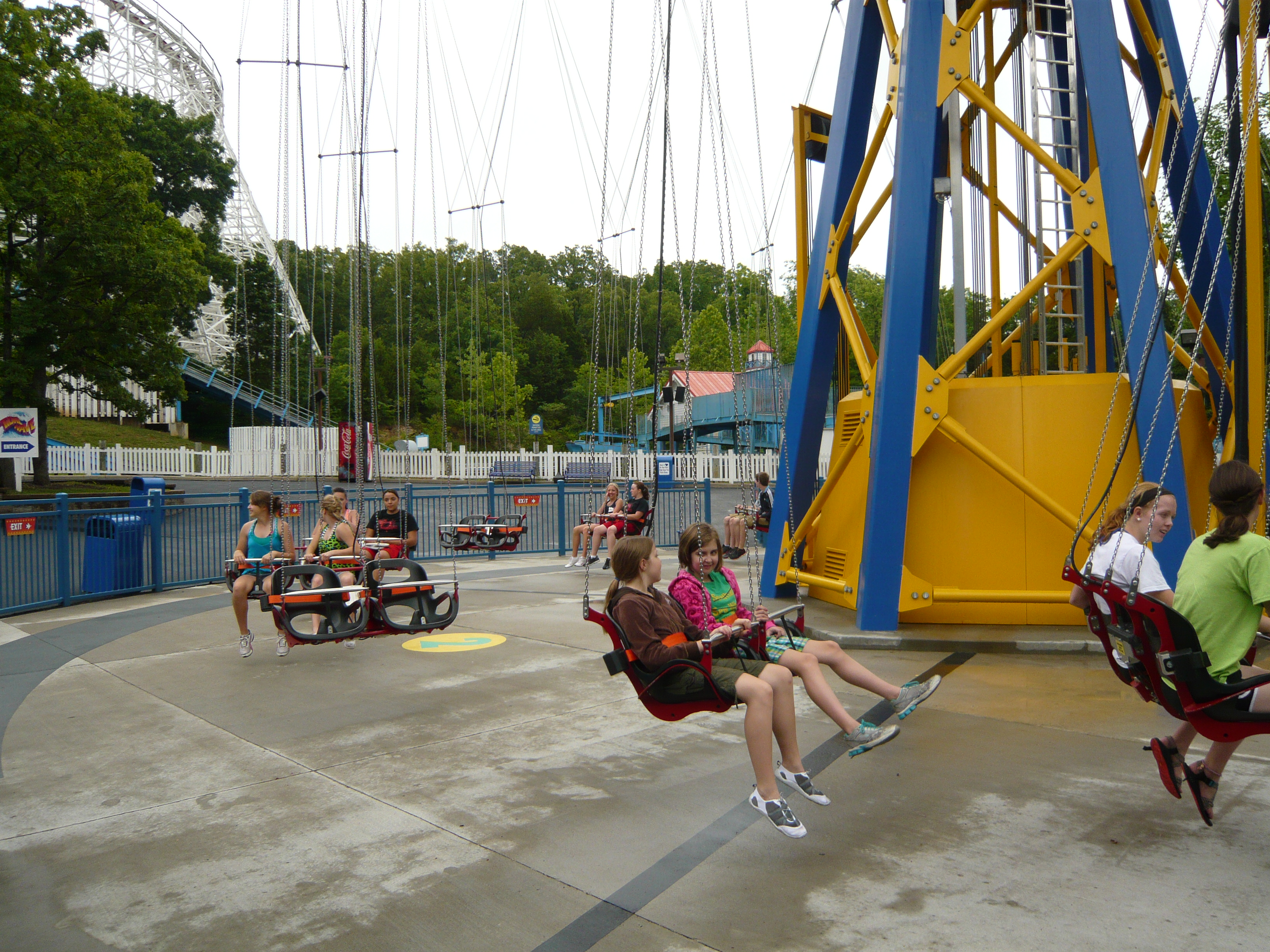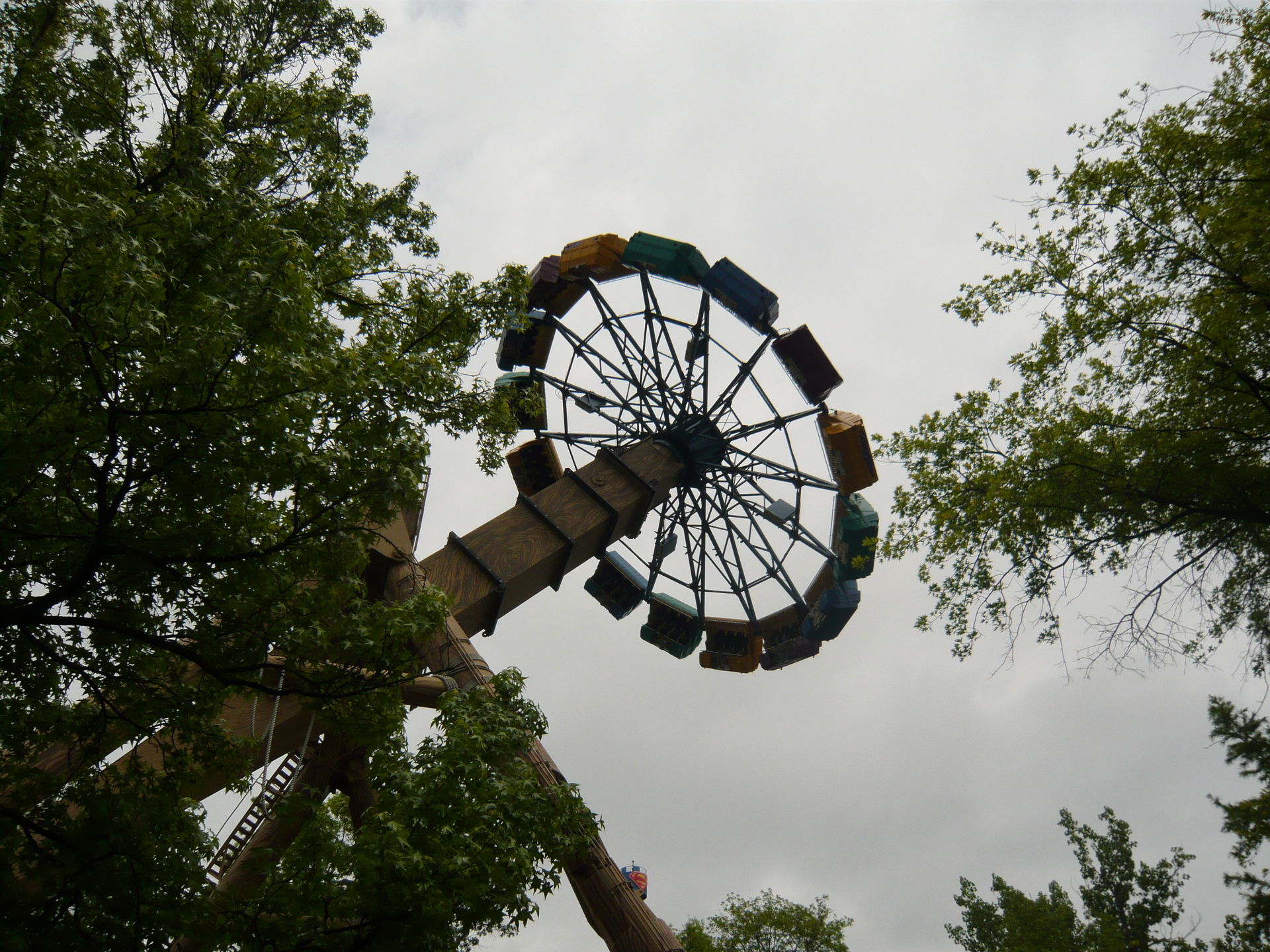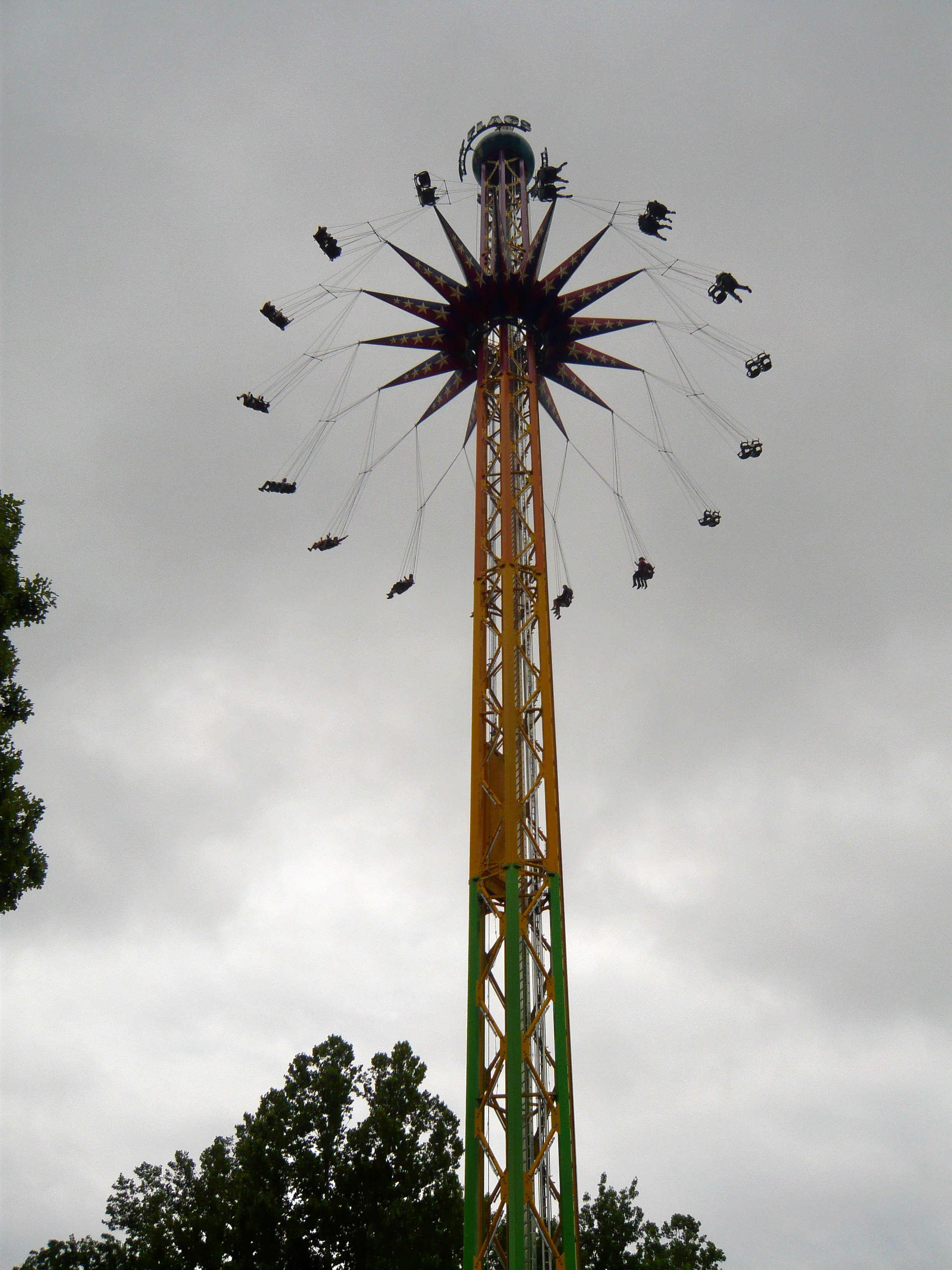 In dieser Höhe nur mit lockerer Sicherung unterwegs zu sein ist mir irgendwie noch nie geheuer gewesen. Die an einfachen Ketten befestigten Doppelsitze auf diesem gut 72 Meter hohen Exemplar tragen dann auch nicht wirklich zur Beruhigung bei. Nebst der üblichen Beinbügel-/Haltestangen-Kombination kommt ein Klickgurt über den Bauch von der einen Sitzlehnen-Seite zur anderen zum Einsatz. Mehrere zehnjährige Kinder haben bei unserem Durchgang übrigens demonstriert, dass das Nichtschliessen eben dieses Gurts eine Komplettentriegelung aller Sitze zur Folge hat und die Ride-OPs mit ihrer Kontrolle dann nochmals von vorn beginnen müssen. Irgendwann sind alle mehr oder weniger Fahrwilligen dann aber startklar und die Füsse verlassen langsam den Boden. Höher, höher, immer höher geht es nun in rotierender Manier hinauf, bis man irgendwann ein gewaltiges Panorama auf den Park und seine Umgebung geniessen kann. Es windet, es ist kühl, man scheint regelrecht zu fliegen! Das Gefühl ist einfach unbeschreiblich, für mich ein unfassbar grosser Nervenkitzel. Beim kleinsten Luftzug hab ich die Ketten krampfhaft zusammen gequetscht, bis ich irgendwann realisierte, dass das streng genommen nur zu schnellerem Zerschleiss derselben führt und mich woanders festgeklammert hab.