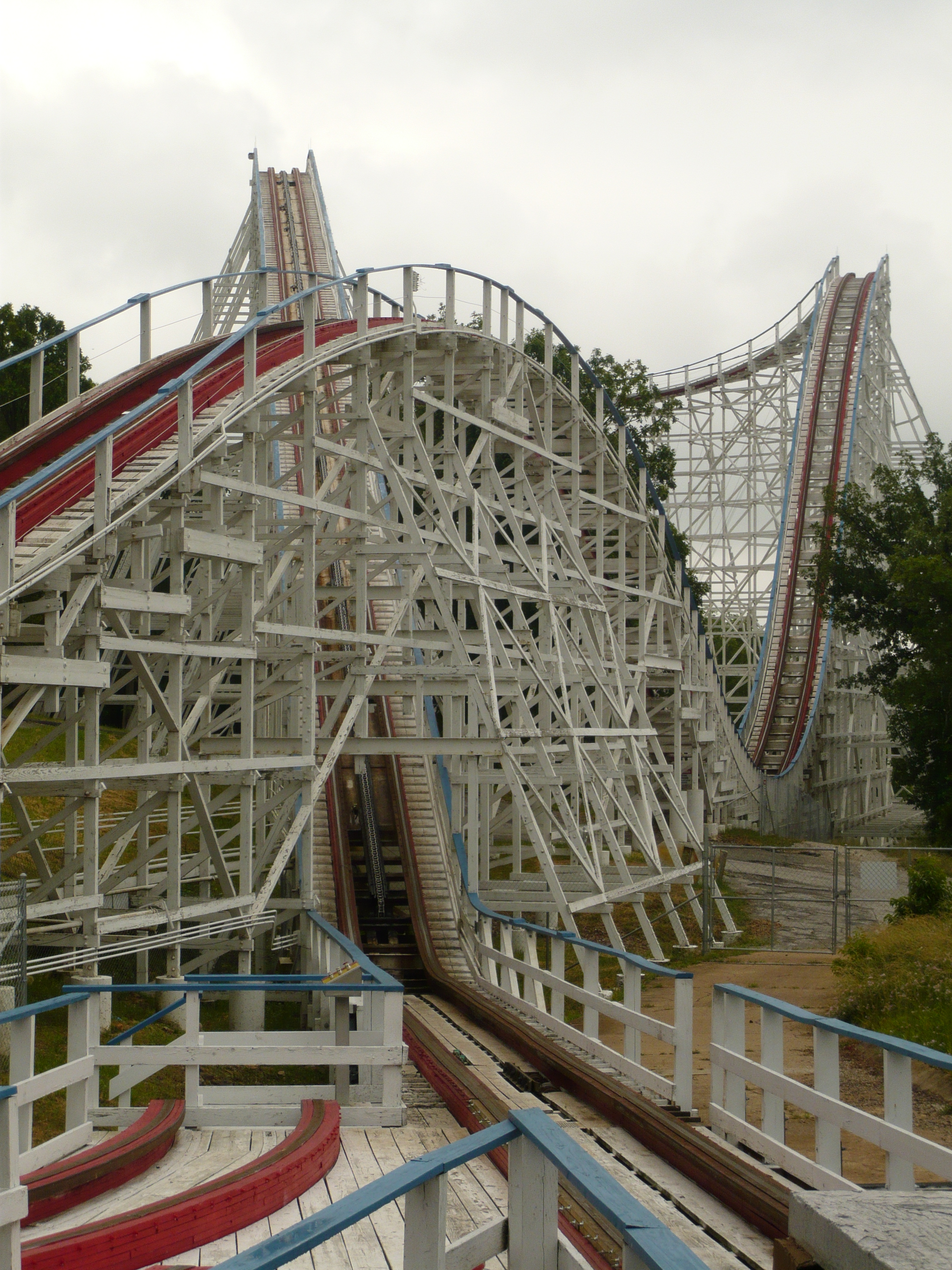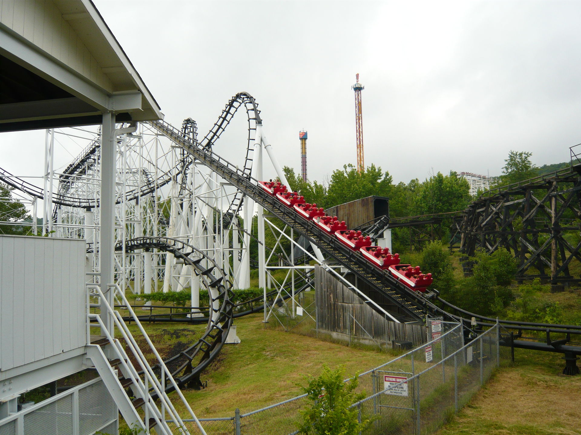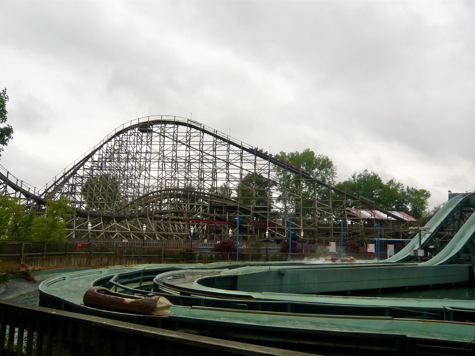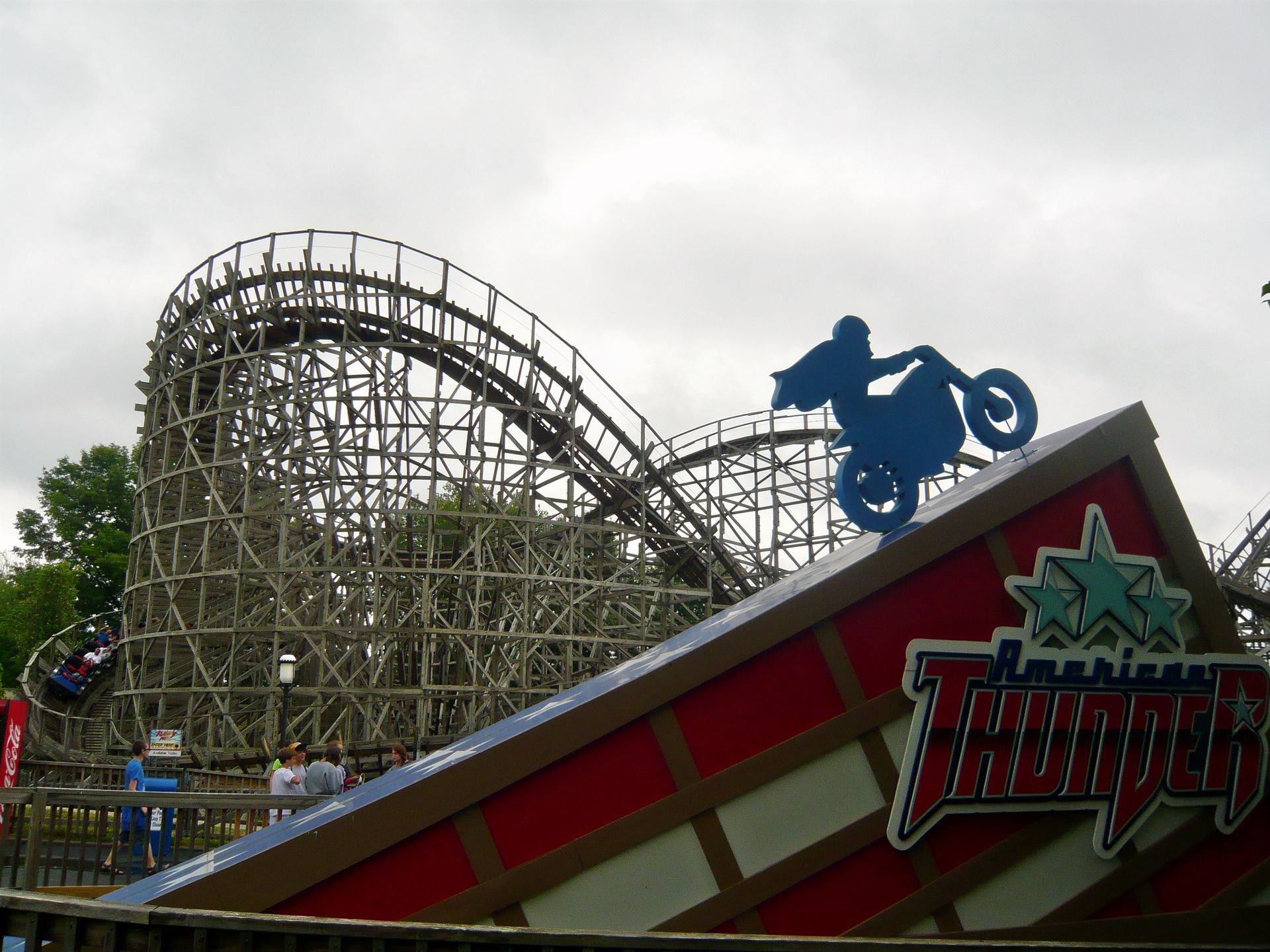 GCI-Holzachterbahn nach dem Stuntfahrer Evel Knievel bekannt, dann lief die Lizenz aus und nun heisst sie seit der letzten Saison eben American Thunder. Das Logo samt dem ursprünglich namensgebenden Rennfahrer ist allerdings noch da - sehr Six Flags eben.