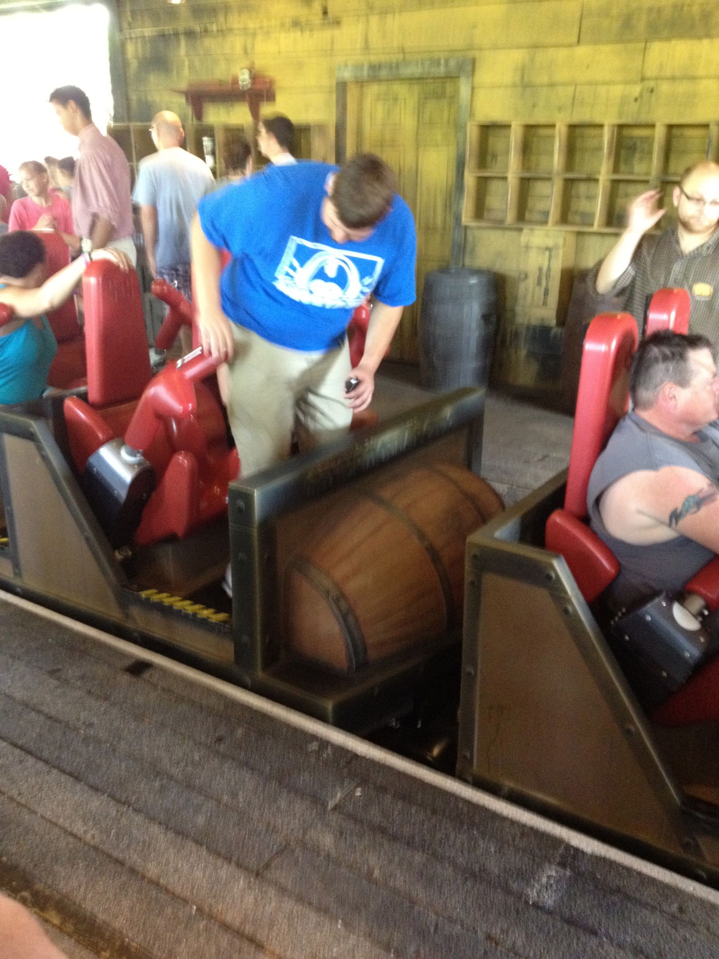 Auch die Züge sind als "altes Fass" sehr stylisch. Nachdem man in einem der Fässer Platz genommen hat, wird man mit den gleichen Bügeln gesichert, die auch bei den