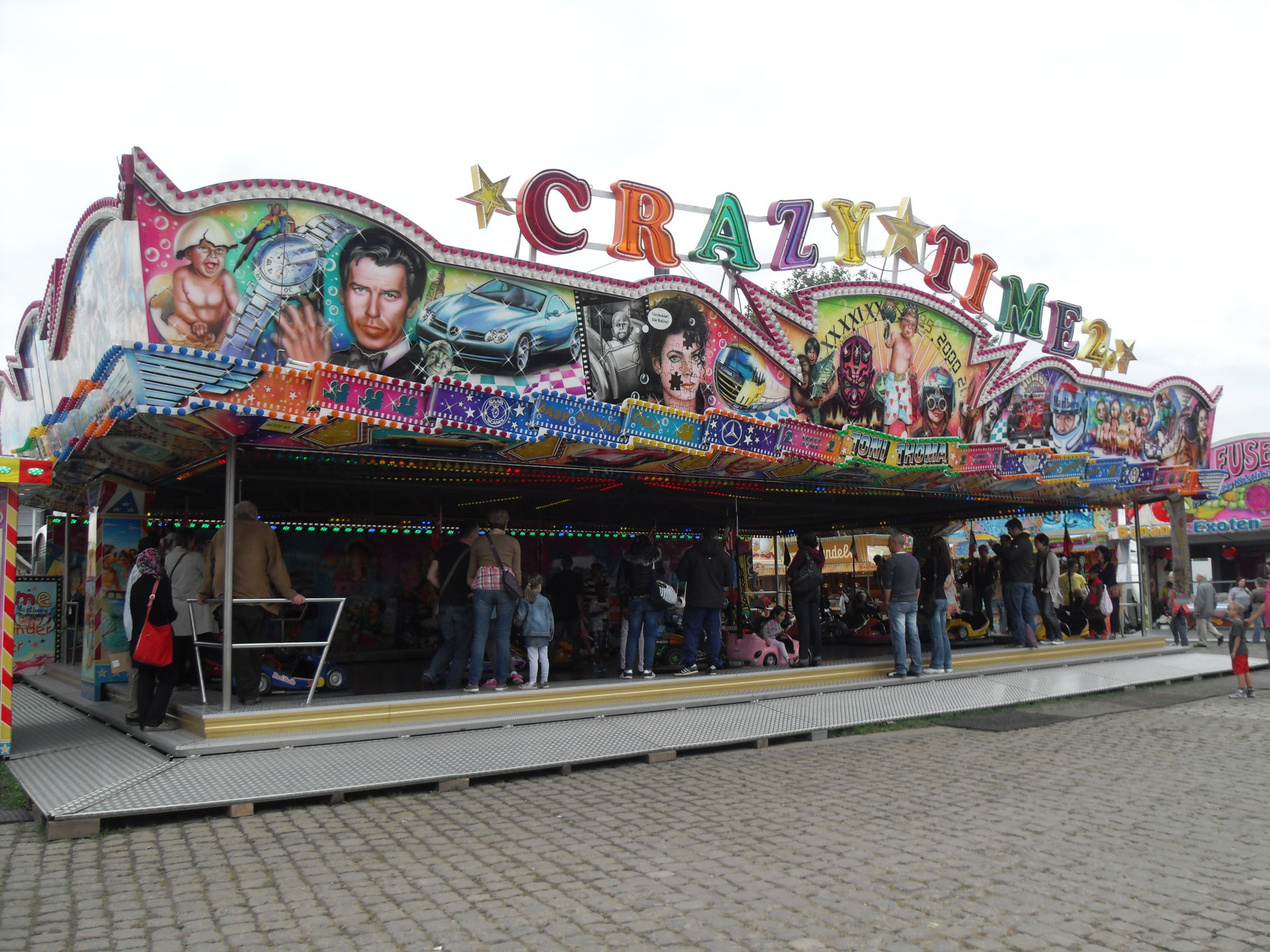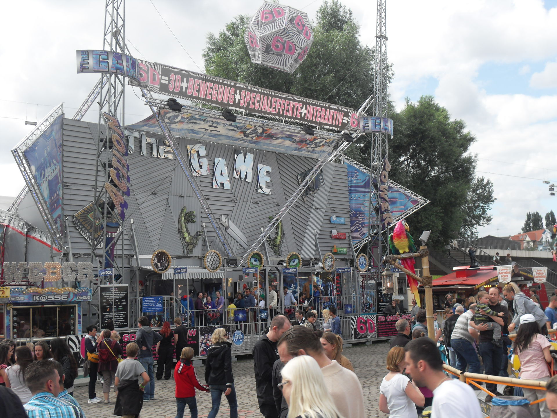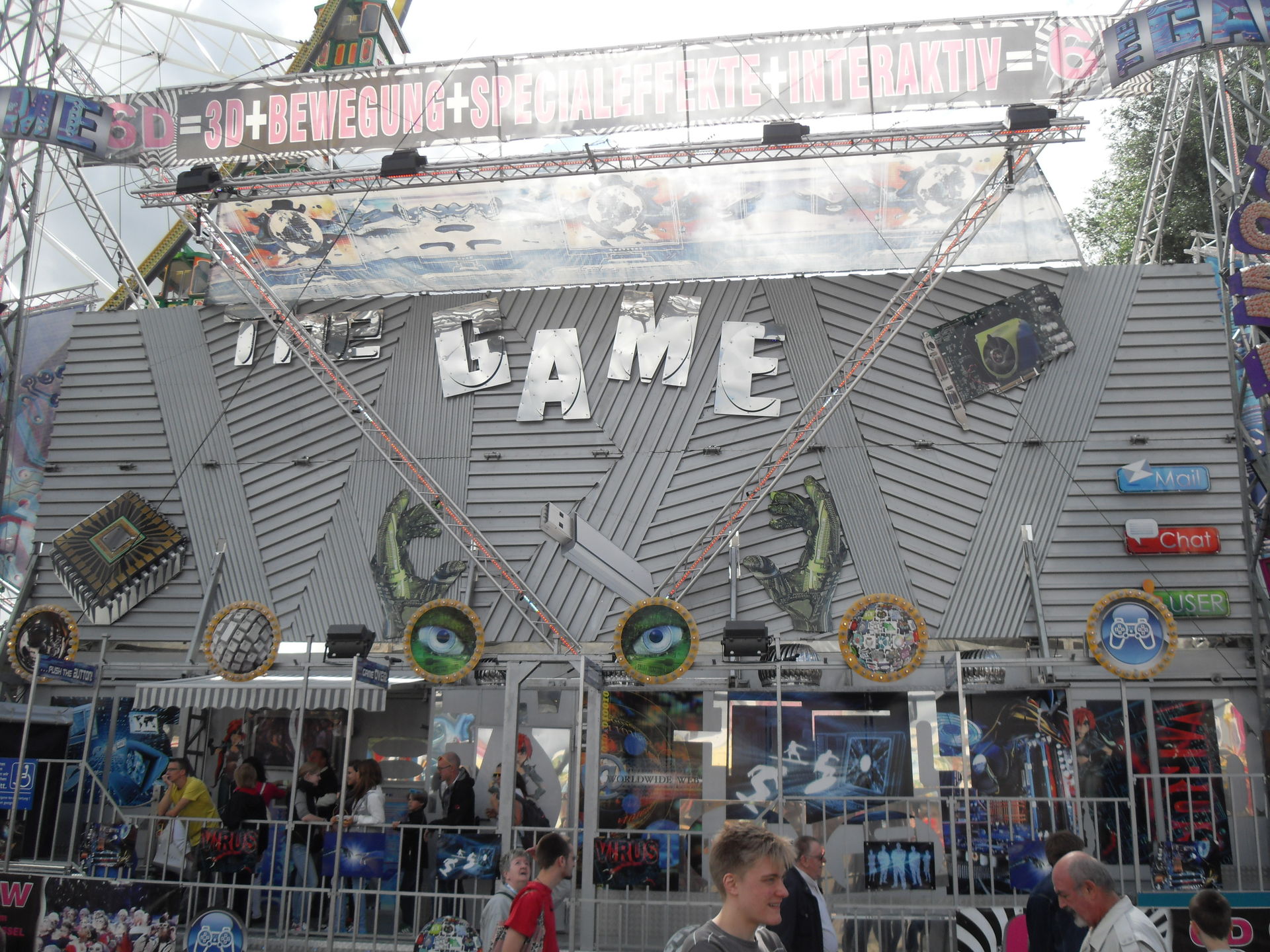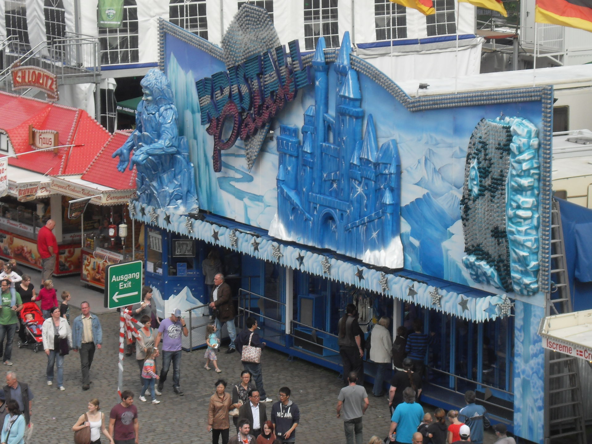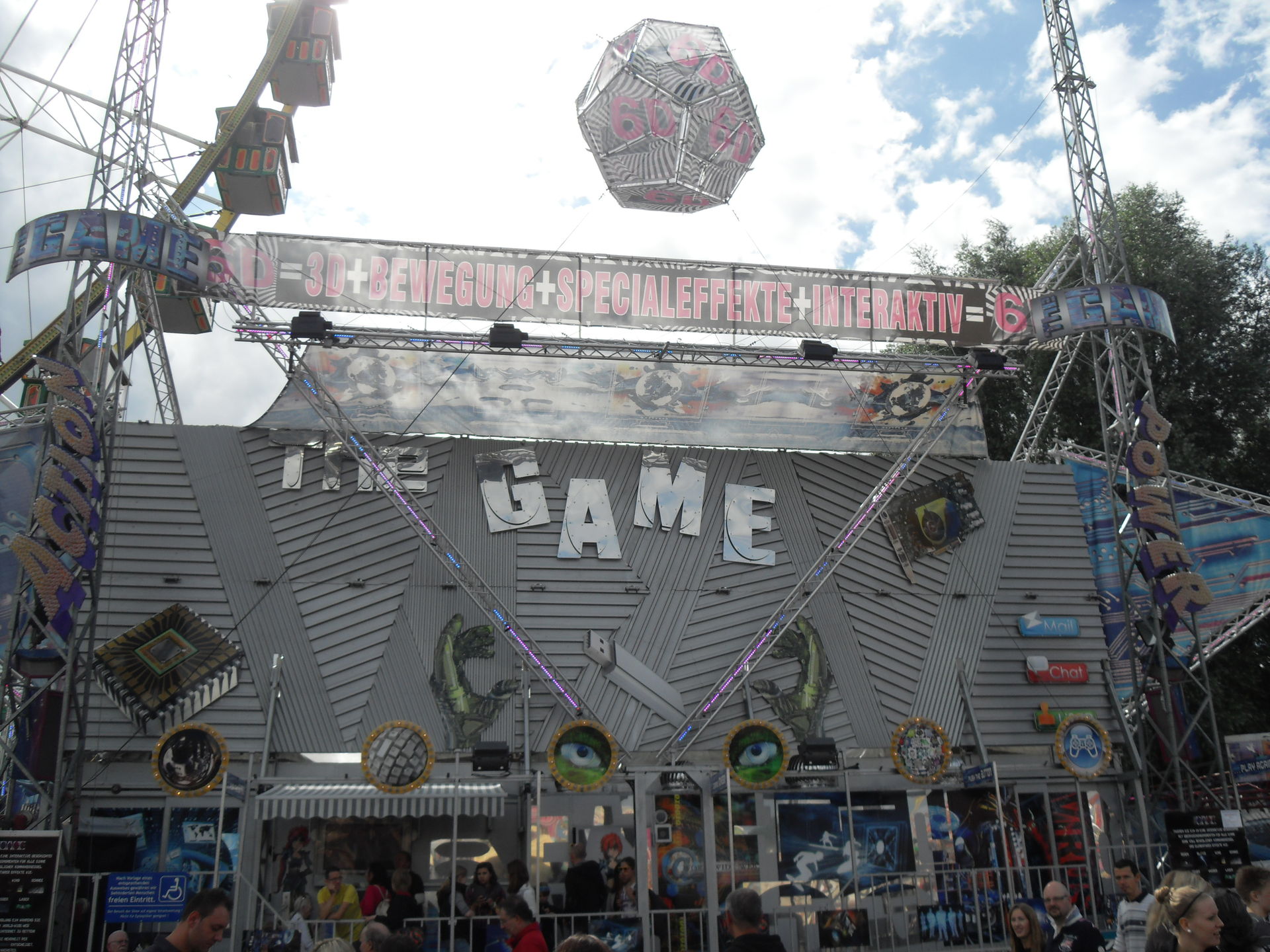 Kurz danach hatten wir auch schon das andere Ende der Kirmes erreicht. Hier im Bereich des Riesenrades, das natürlich auf Fortuna gepimpt war, traf man auf "Big Monster", auf den "Boostermaxx" und auf die interaktive Special Effekt Show "The Game". Ebenfalls war hier auch noch der Glasirrgarten "Kristall Palast" zu finden.