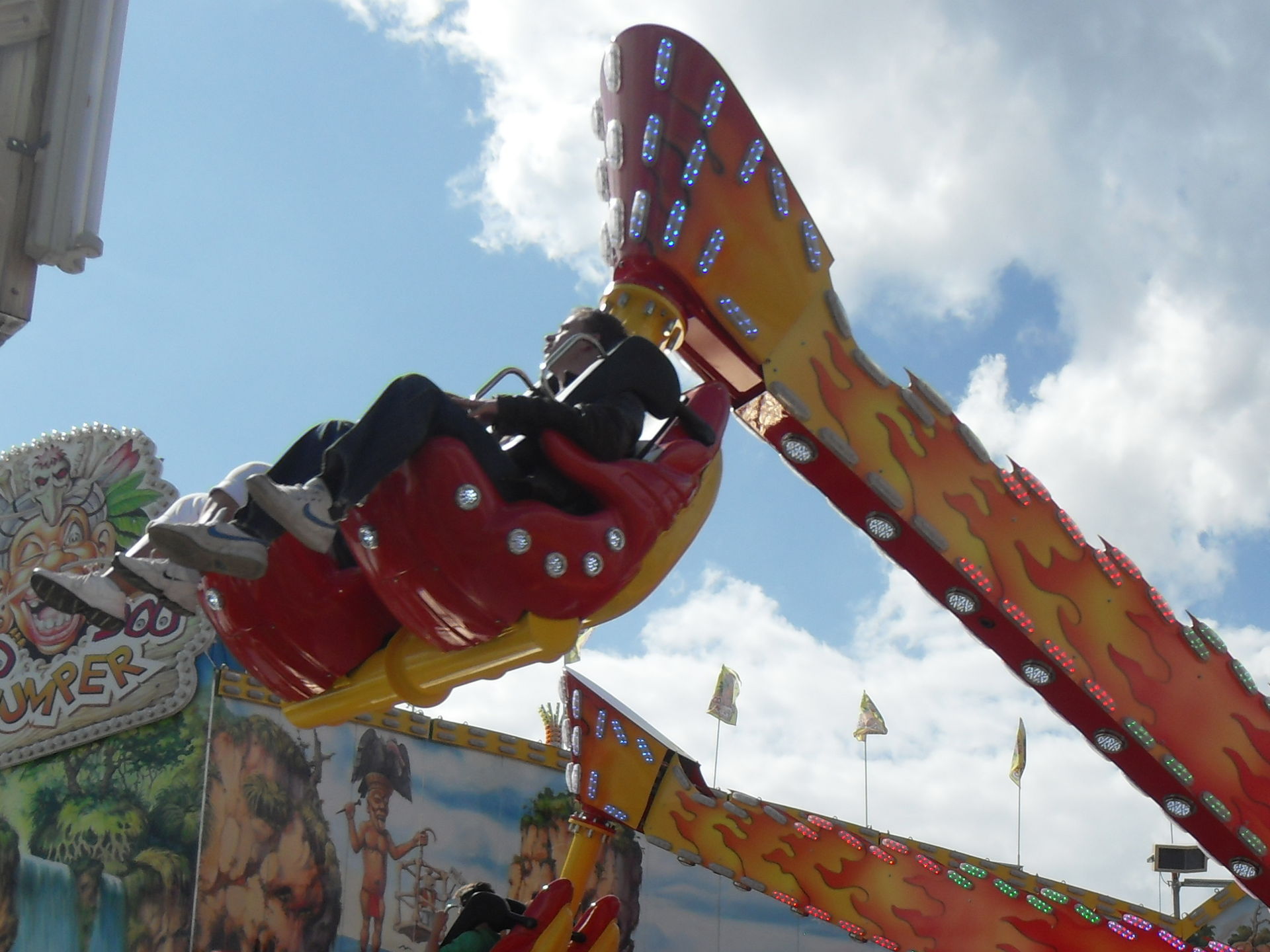 So langsam näherte sich unsere ausgiebige Kirmesrunde dem Ende, der letzte große Platz war erreicht. Dort fand man den Höllenblitz, den Wellenflug und als Neuheit präsentierte sich hier der Vodoo Jumper. Hmm....ich weiss nicht, das Gerät hat mich jetzt vom Zuschauen überhaupt nicht vom Hocker gerissen. Irgendwie sieht das alles sehr brav und sehr eintönig aus. Optisch gesehen wirkt das Karussell auch überhaupt nicht zur Zeit. Kommt da noch ein großer Schriftzug? Oder bleibt das so? Ich werde das Ding mal fahrtechnisch auf Crange testen.