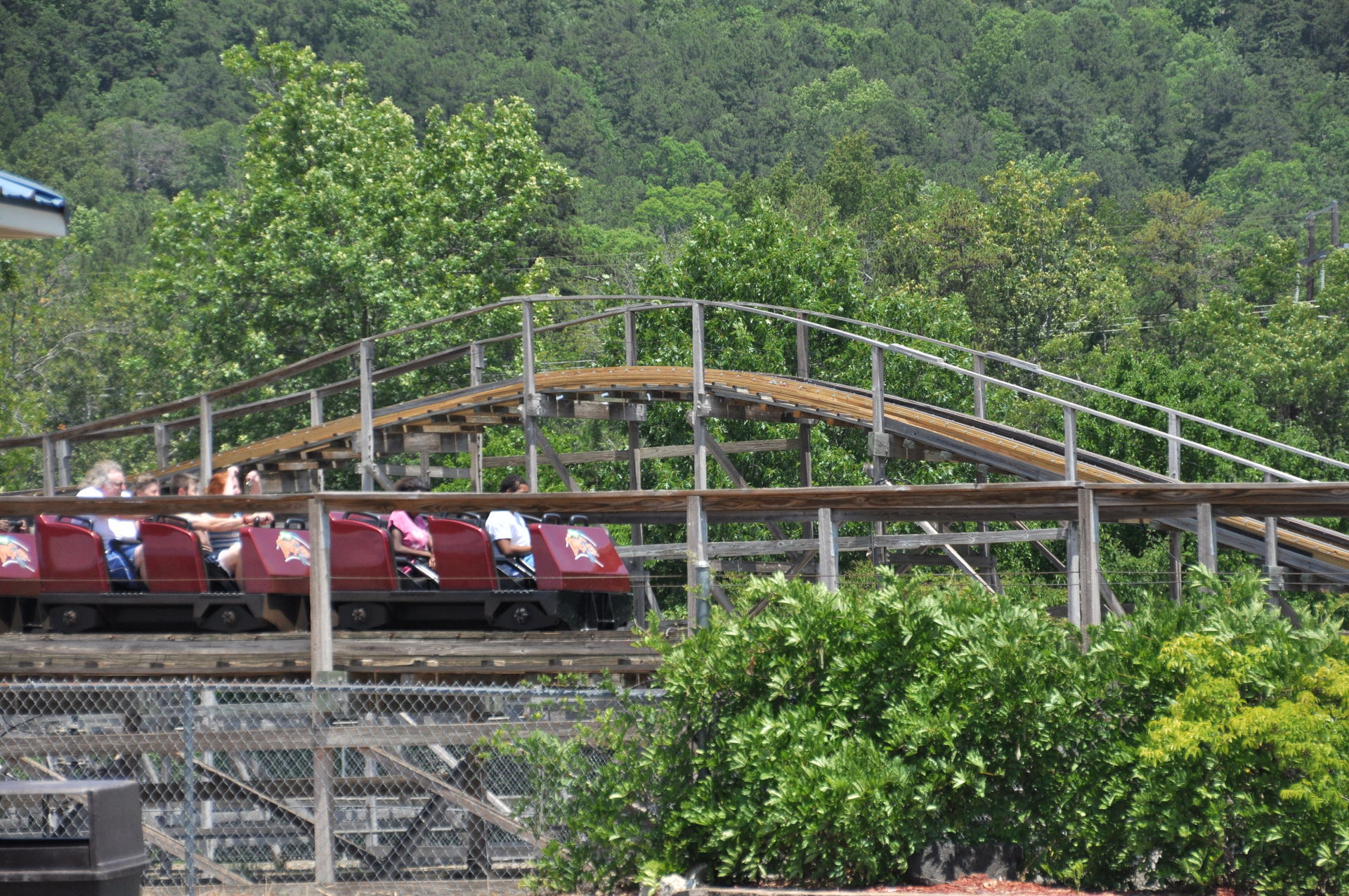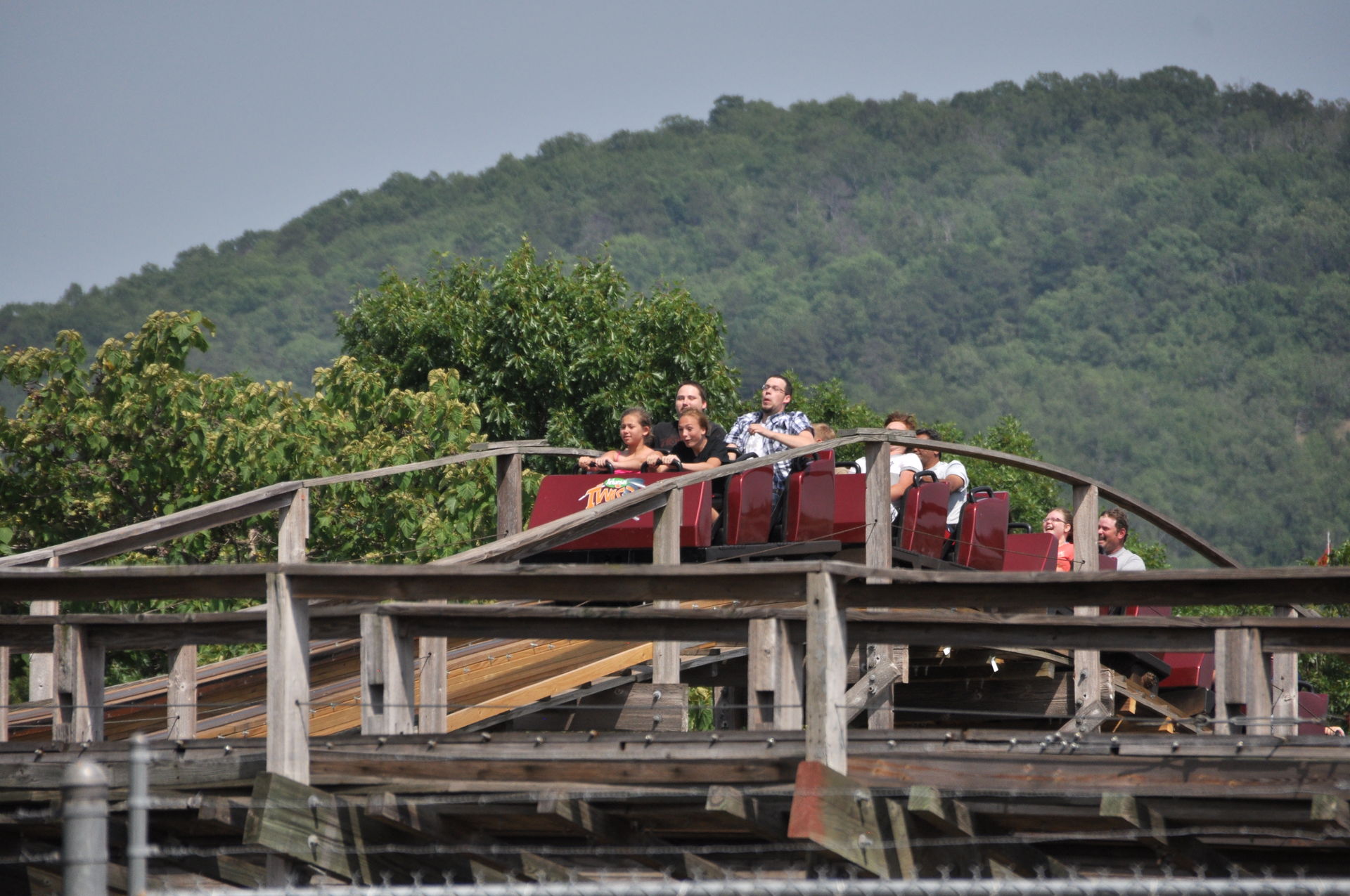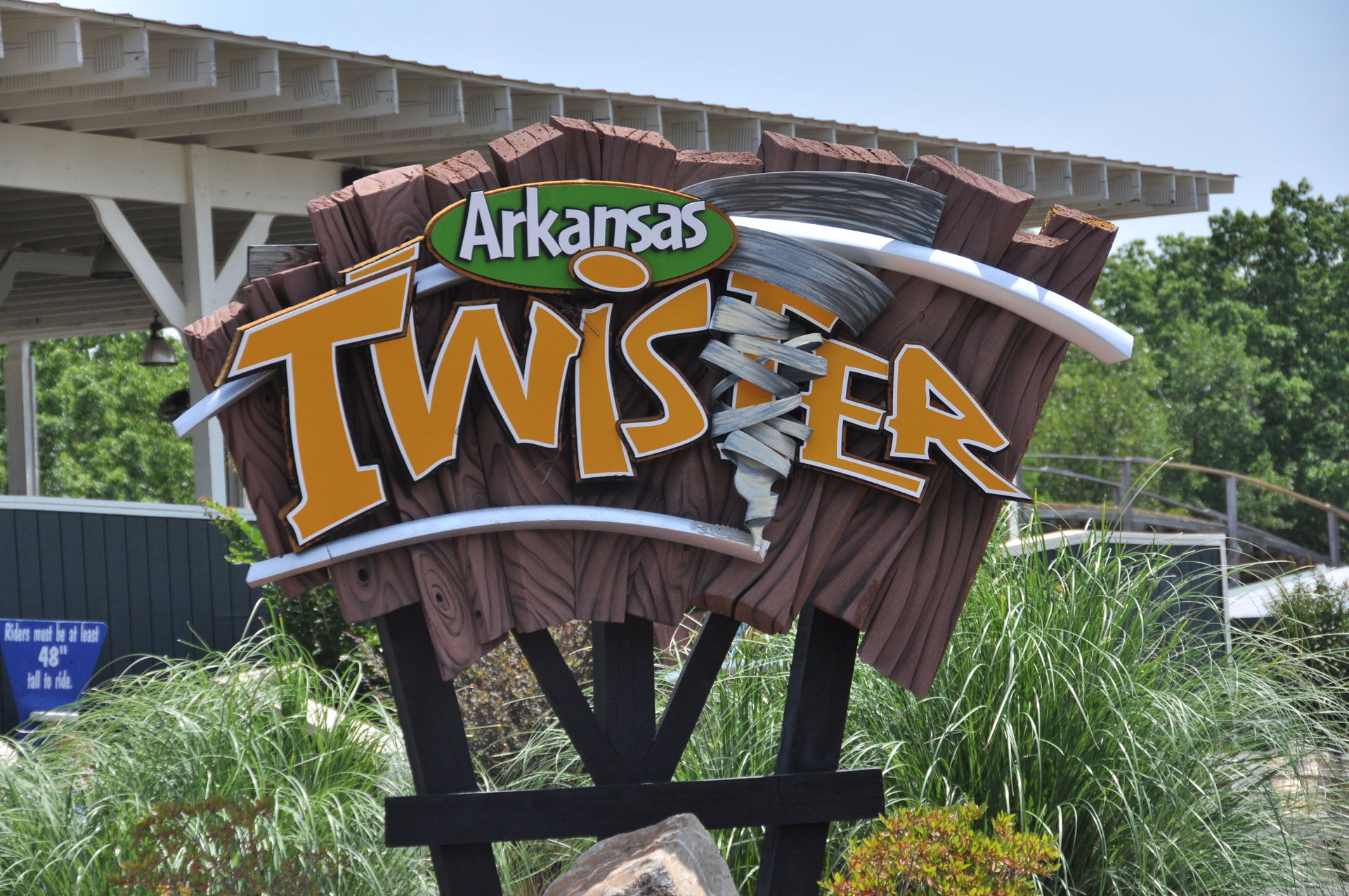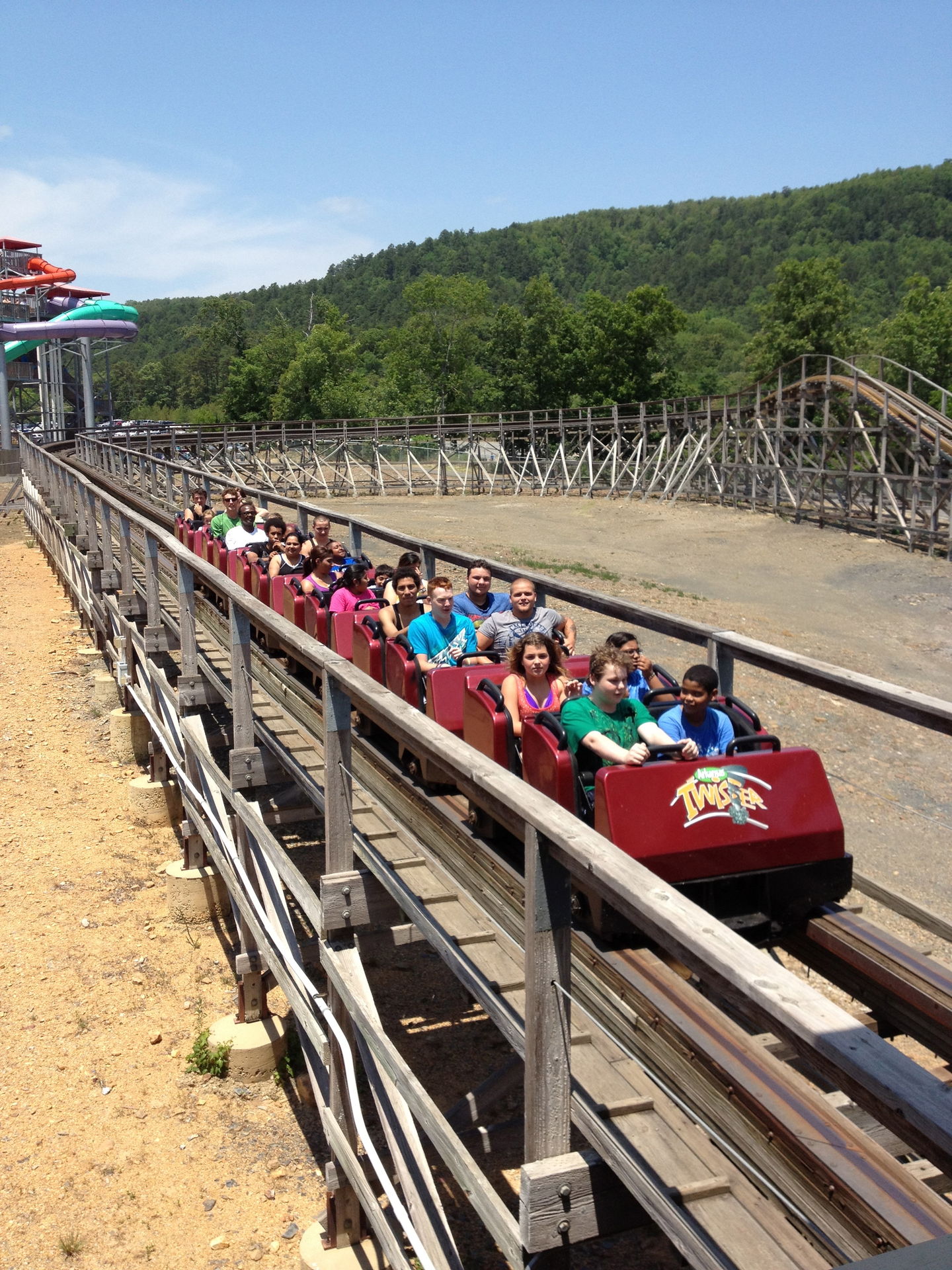 Der Arkansas Twister macht seinem Namen nur halbe Ehre. Ja, er steht in Arkansas, aber getwistet sind allenfalls die Schrauben, die das Gebälk zusammen halten. Vielmehr findet man hier ein klassisches Out&Back-Design, wie es vorbildlicher nicht sein kann. Denn hat man den Lift wie üblich an der höchsten Stelle verlassen, geht es erst einmal schnurgerade vorbei an dem Amphitheater des Parks und hinaus in den Wald. Nach einigen Hügeln mit mäßiger bis guter