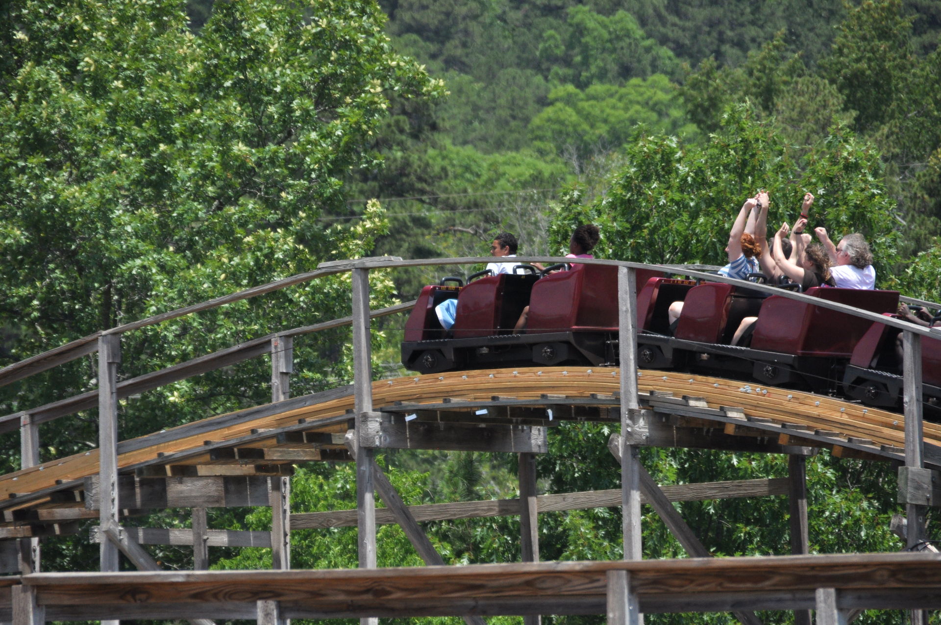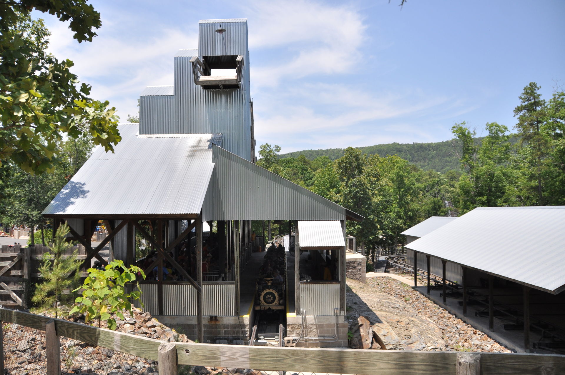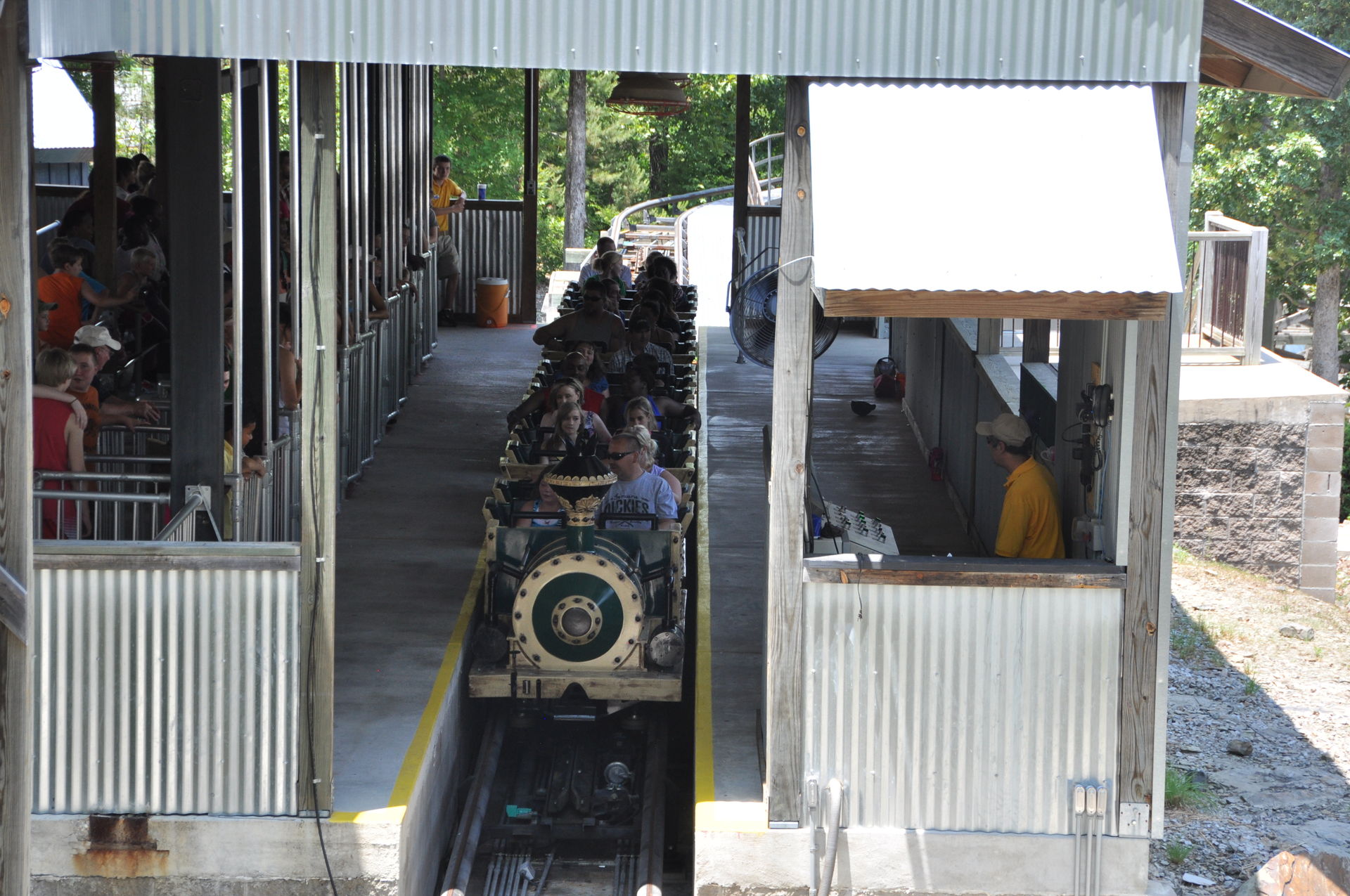 Der Arkansas Twister macht seinem Namen nur halbe Ehre. Ja, er steht in Arkansas, aber getwistet sind allenfalls die Schrauben, die das Gebälk zusammen halten. Vielmehr findet man hier ein klassisches Out&Back-Design, wie es vorbildlicher nicht sein kann. Denn hat man den Lift wie üblich an der höchsten Stelle verlassen, geht es erst einmal schnurgerade vorbei an dem Amphitheater des Parks und hinaus in den Wald. Nach einigen Hügeln mit mäßiger bis guter