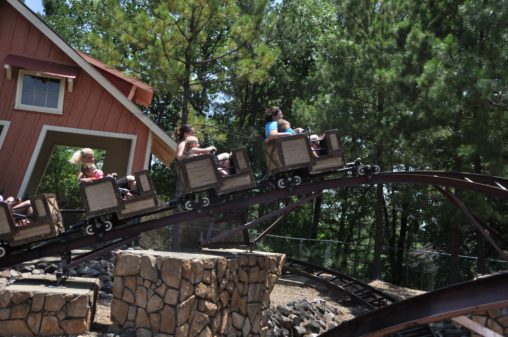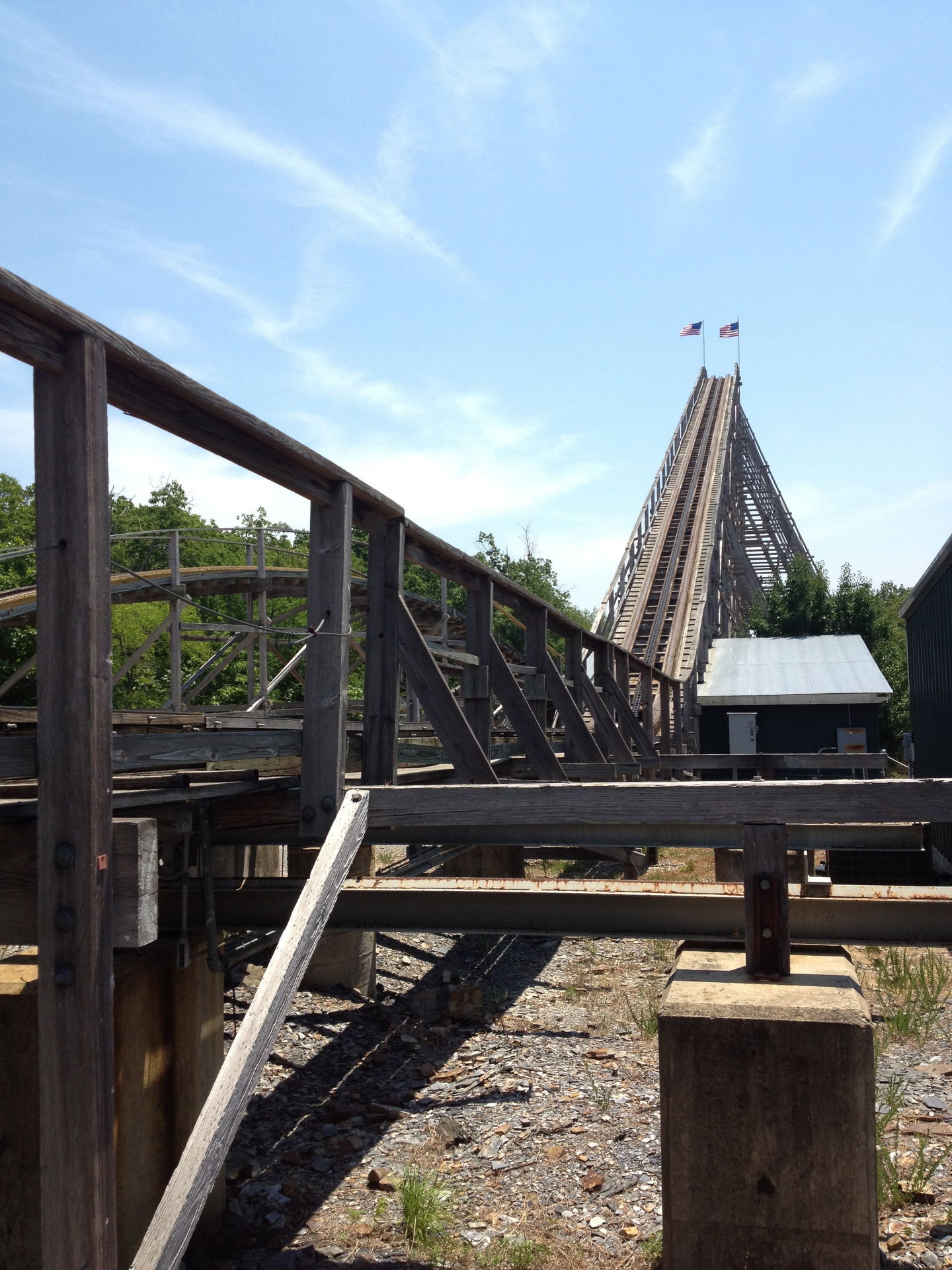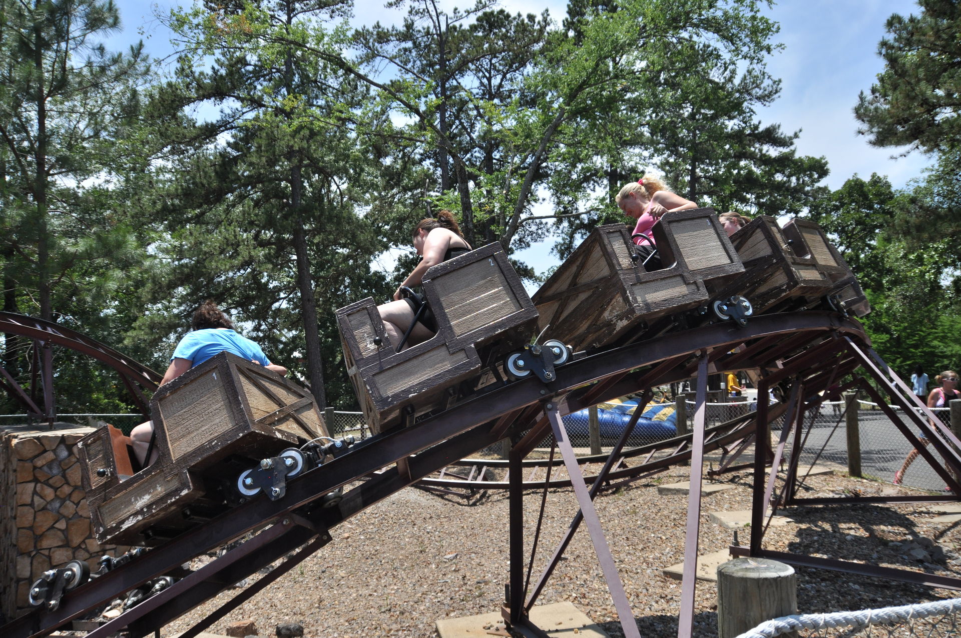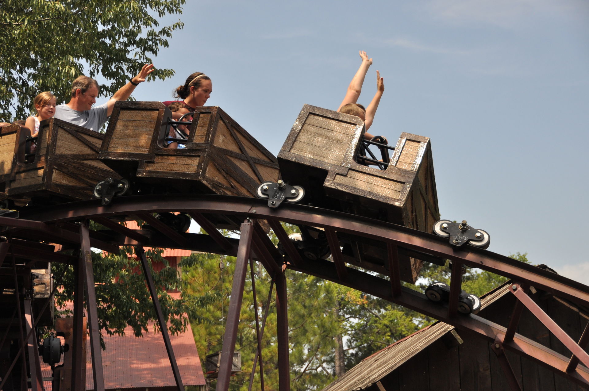 Der Arkansas Twister macht seinem Namen nur halbe Ehre. Ja, er steht in Arkansas, aber getwistet sind allenfalls die Schrauben, die das Gebälk zusammen halten. Vielmehr findet man hier ein klassisches Out&Back-Design, wie es vorbildlicher nicht sein kann. Denn hat man den Lift wie üblich an der höchsten Stelle verlassen, geht es erst einmal schnurgerade vorbei an dem Amphitheater des Parks und hinaus in den Wald. Nach einigen Hügeln mit mäßiger bis guter
