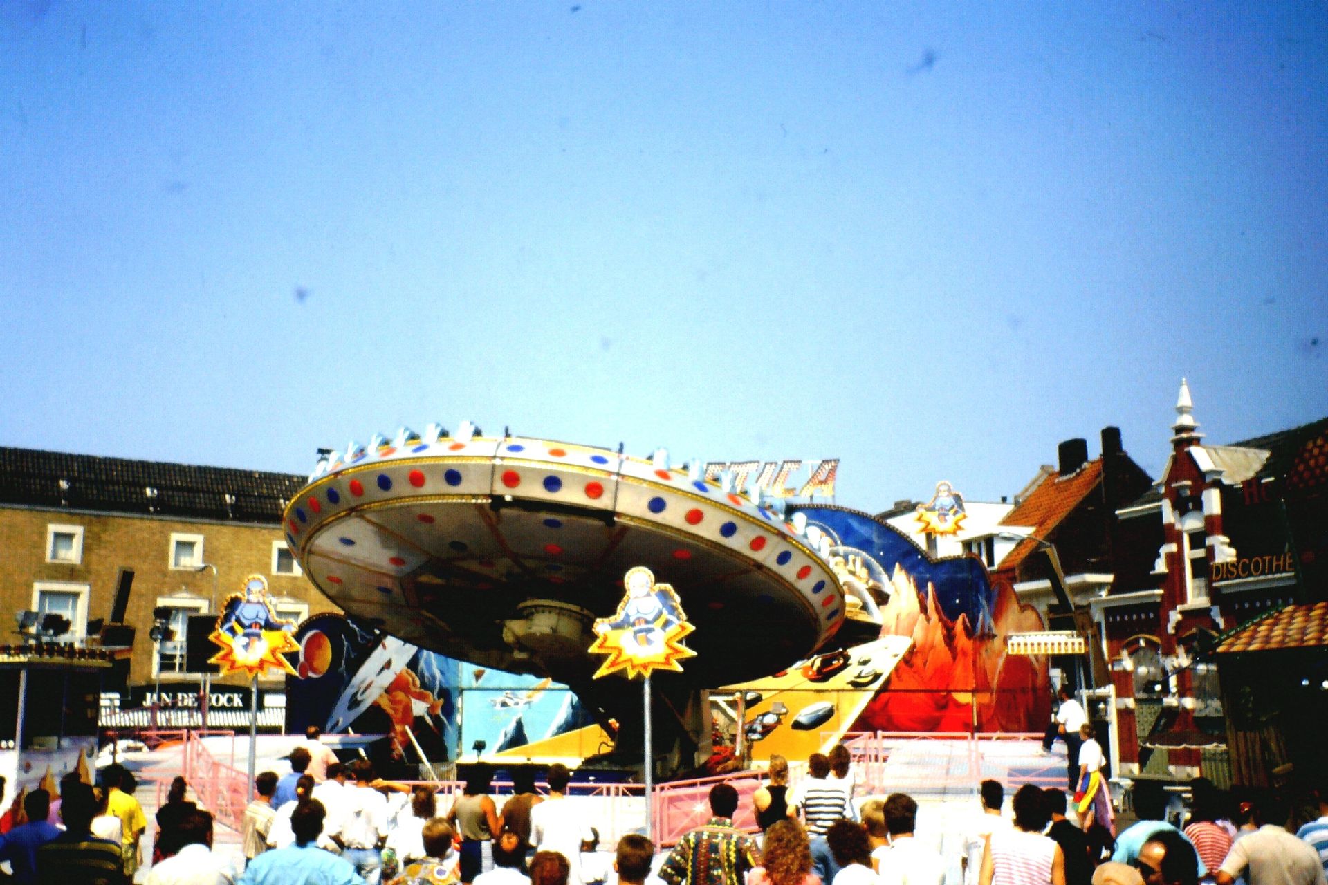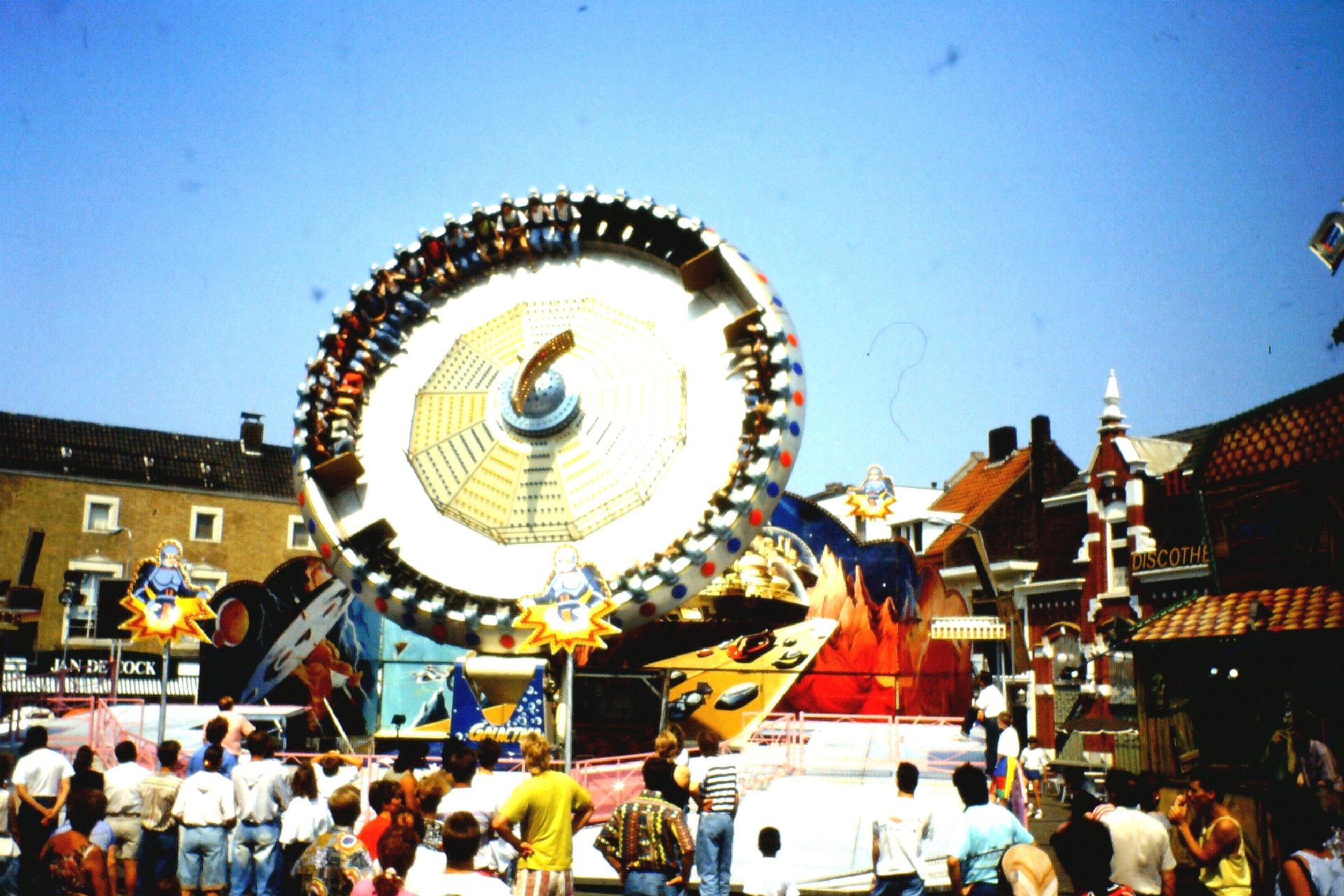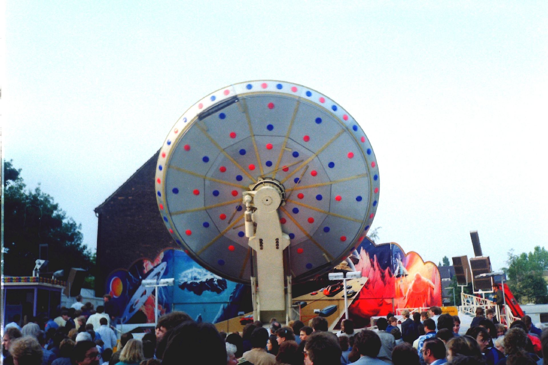 Nun, der Vorläufer des Centrox die Galactica, im SDC-Prospekt "Moonraker" benannt, war die erste Version dieses Karusselltyp's. Wie das schon erwähnt wurde konnte hier die "Scheibe" nicht per Hydraulik gekippt werden. Vielmehr konnte bei dieser Version der Mittelbau-Ausleger um 360 Grad um die eigene Achse gedreht werden. Aber das in sehr gemäßigtem Tempo bzw. nicht in gegengesetzter Richtung so das kein "Hully-Gully Effekt" aufgekommen ist.