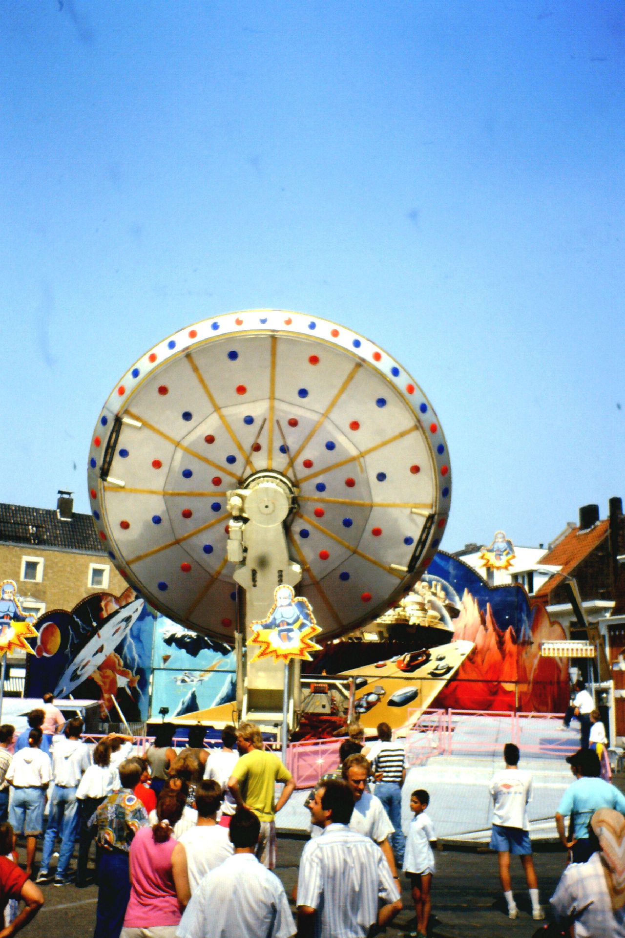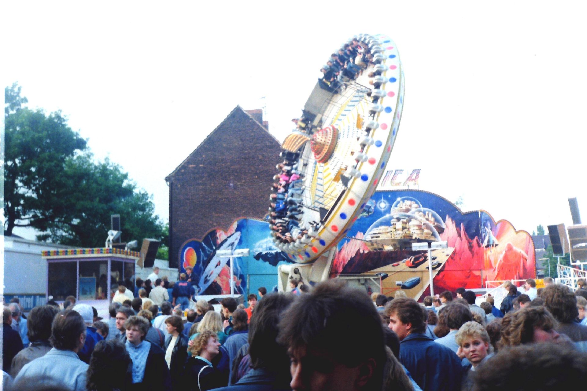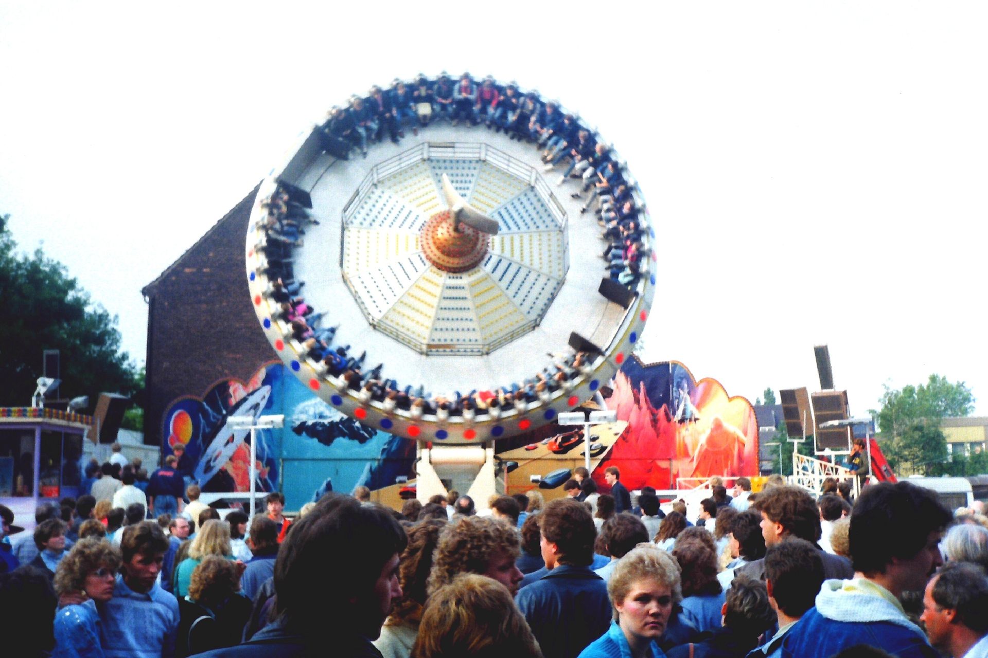 Nun, der Vorläufer des Centrox die Galactica, im SDC-Prospekt "Moonraker" benannt, war die erste Version dieses Karusselltyp's. Wie das schon erwähnt wurde konnte hier die "Scheibe" nicht per Hydraulik gekippt werden. Vielmehr konnte bei dieser Version der Mittelbau-Ausleger um 360 Grad um die eigene Achse gedreht werden. Aber das in sehr gemäßigtem Tempo bzw. nicht in gegengesetzter Richtung so das kein "Hully-Gully Effekt" aufgekommen ist.