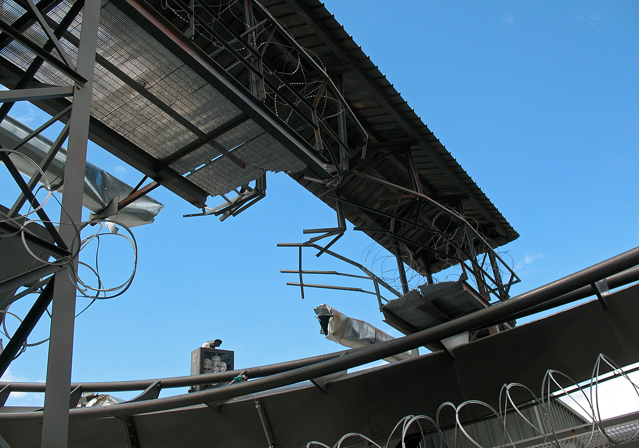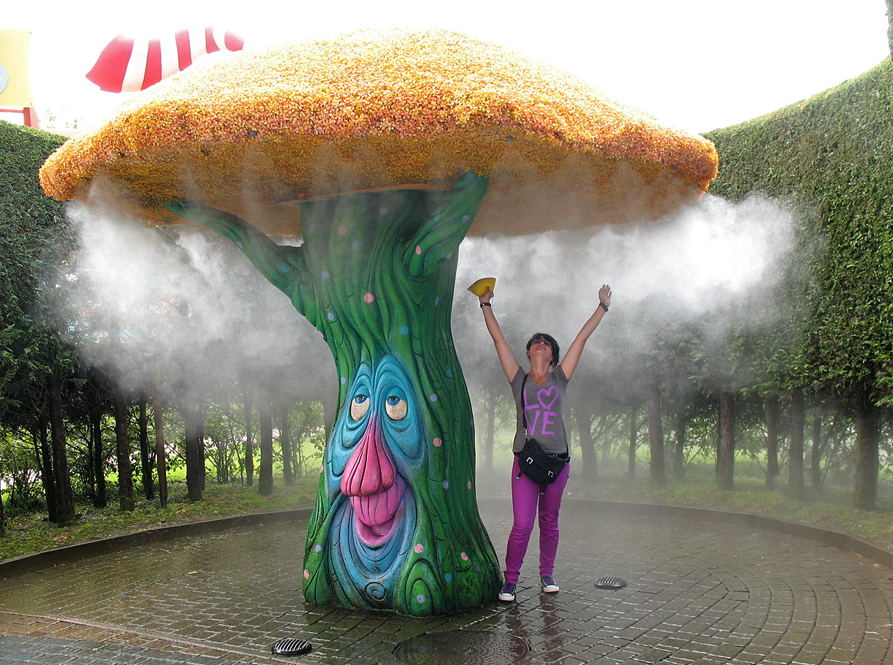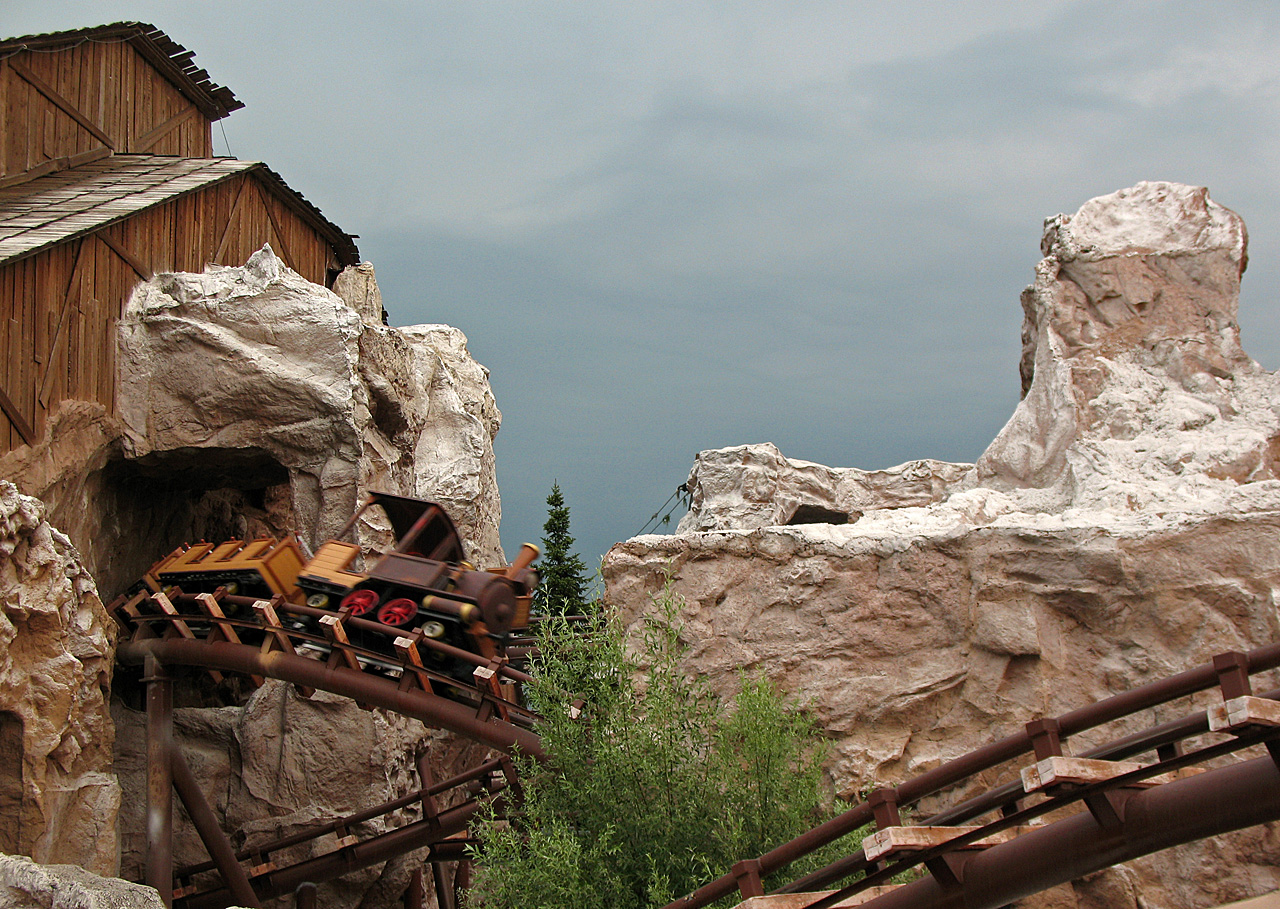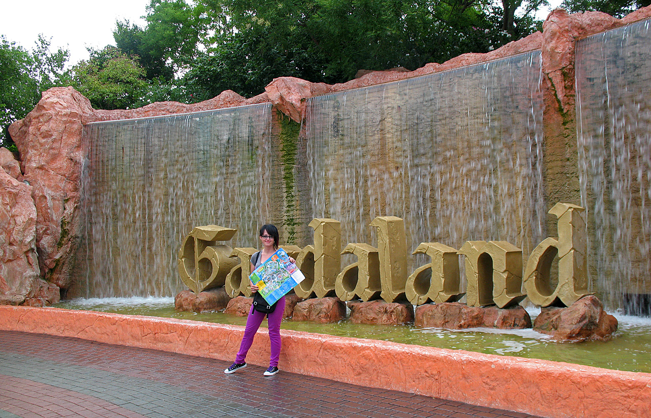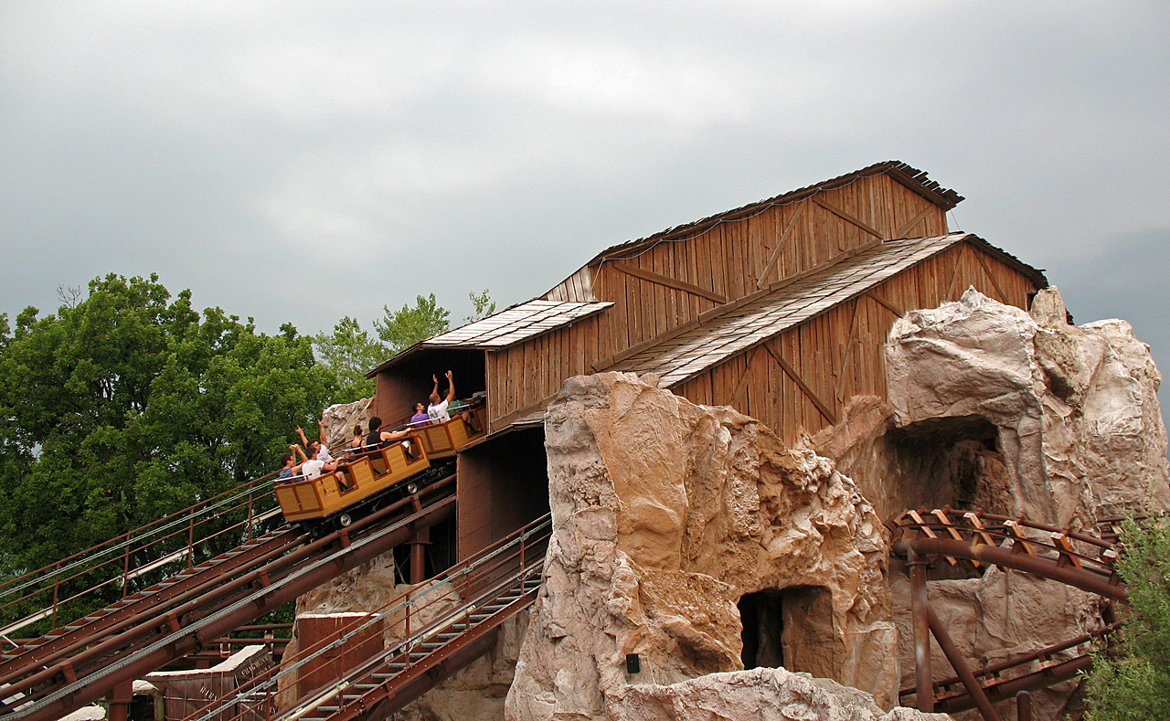 Direkt nach der Fahrt im Mammut ging das Unwetter los. Regen. Was für ein Regen. Wir warteren lieber im Shop der Bahn auf besseres Wetter. Wie übrigens auch viele andere Besucher. Gewitter. Donner. Mehr Regen. Sturm. Auf einmal zup, alle Lichter aus. Dunkel. Stromausfall. In der nächsten Stunde kämpfte der Park mit dem Strom. Immer wieder vielen die Systeme und Kassen aus. Wir saßen also im Shop fest. Die Regenjacken zum Preis von 6 ¤ gingen über den Ladentisch. Ich dachte schon, deren Bestände würden knapp werden. Also kauften wir uns auch zwei davon. Man sind die schick.