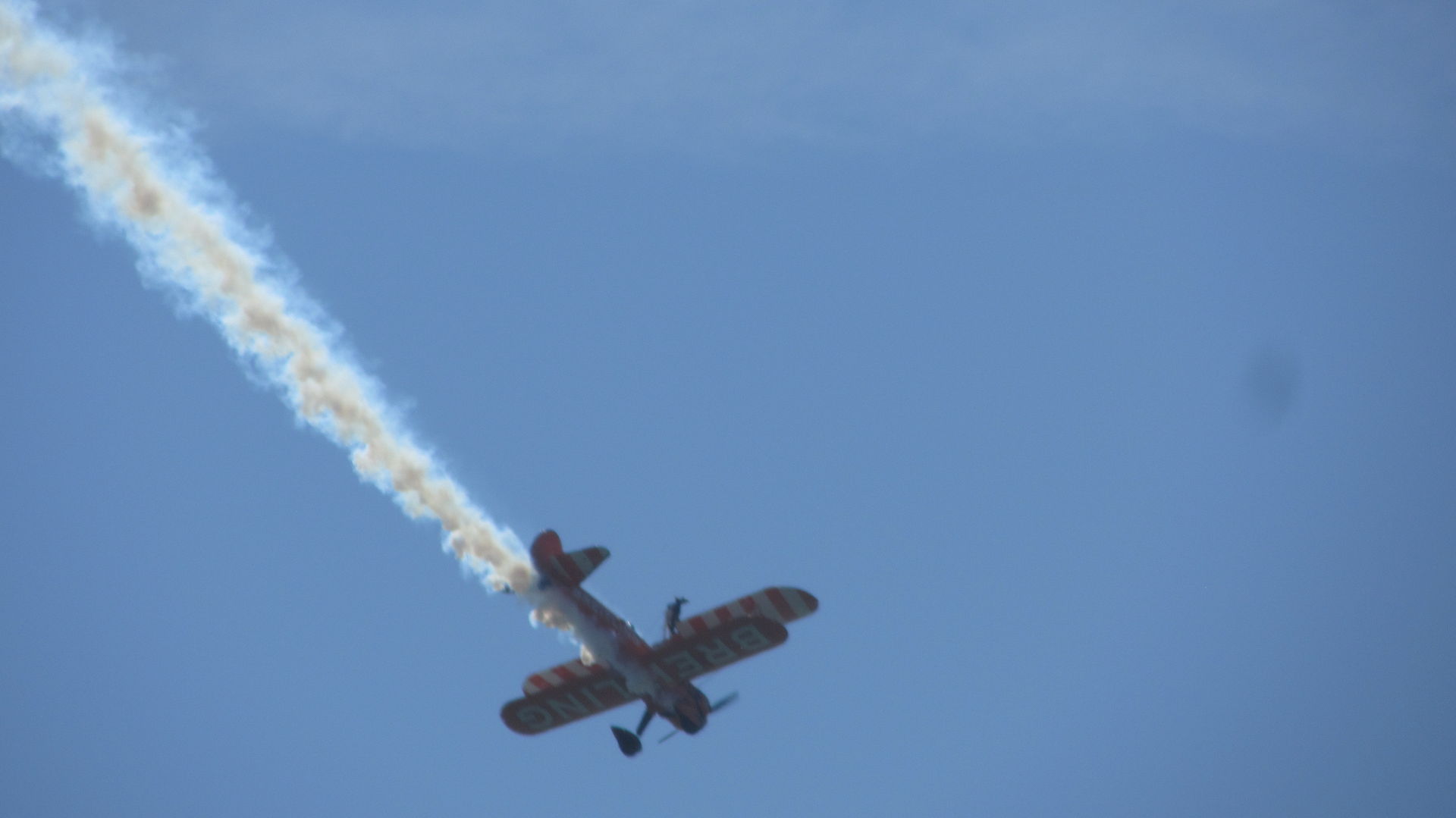Bei der Flugshow wurde allerhand geboten. Neben vielen klassischen Flugzeugen wie diesem Doppeldecker, auf dem übrigens jemand stand, gab es auch einen Helikopter und diverse moderne Jets. Darunter auch ein Eurofighter, der ironischerweise gerade dann auftauchte, als wir uns für den Eurofighter in Coasterform anstellten.