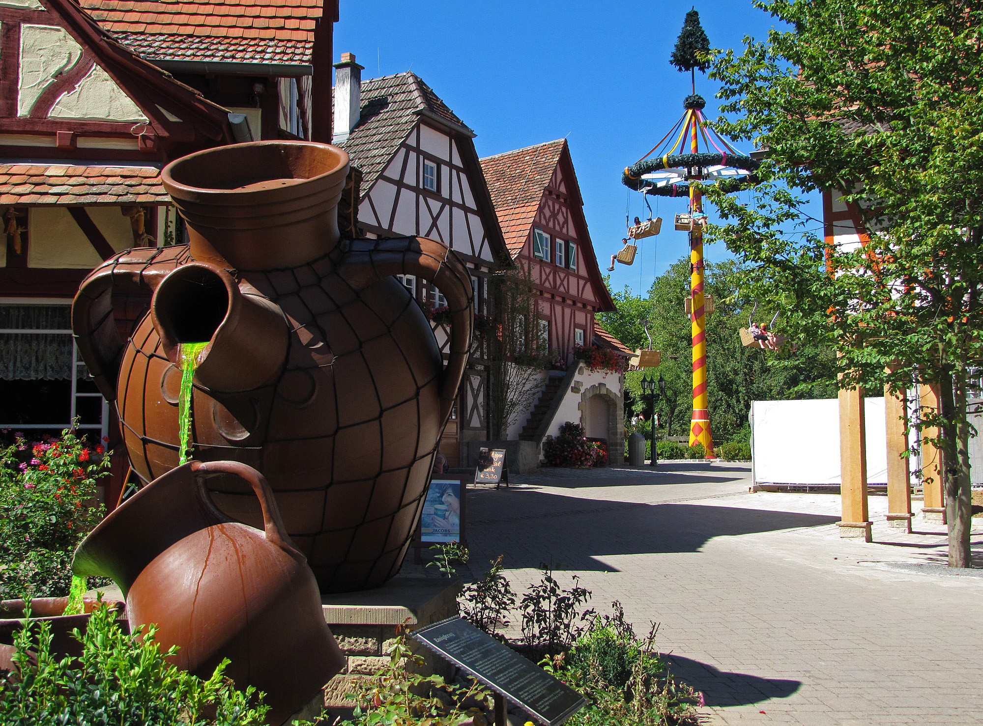 Blick in das kleine Dorf am Parkeingang. Im Hintergrund ist der neue Maibaum zu sehen. Die Körbe lassen sich kurzzeitig selbst steuern.