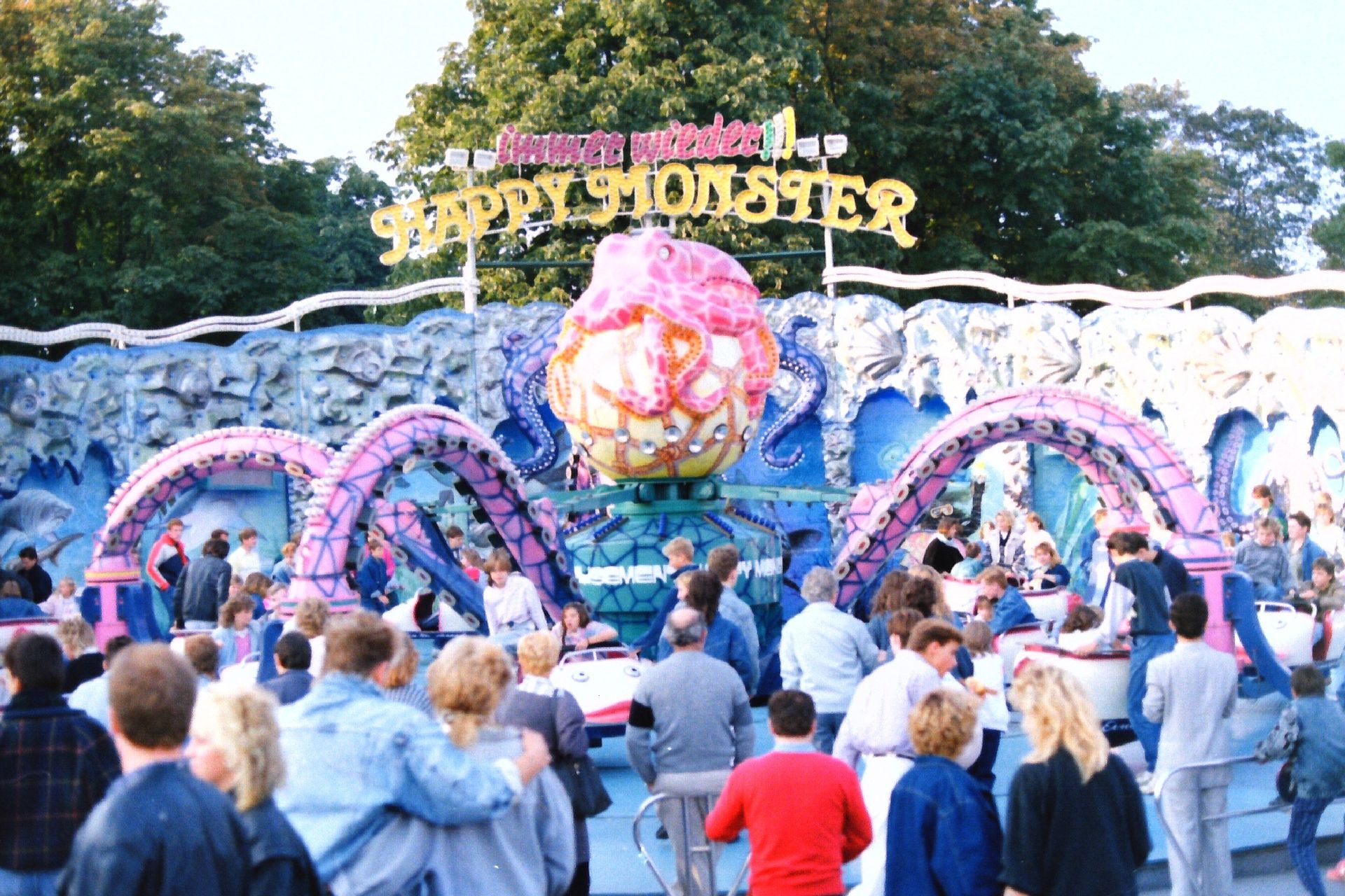 Das Happy Monster war für mich damals, und heute auch noch, das schönste Monster von Schwarzkopf überhaupt. Auch die neuere Version "Monster III" kam da nichtmal nur ansatzweise herran. Und wenn dann auch noch Ute Bruch in der Operator-Box saß war der Tag gerettet. Unbeschreiblich wie die Frau den Laden Rekommandiert hat, da stimmte einfach alles. Abend's die Fahrten unter Strobo-Licht werde ich nie vergessen. Nachteil der Sache war das man damals Abend's auf allen Kirmes-Plätzen ohne Baseballschläger bewaffnet so gut wie keine Chance hatte eine leere Gondel zu erwischen.