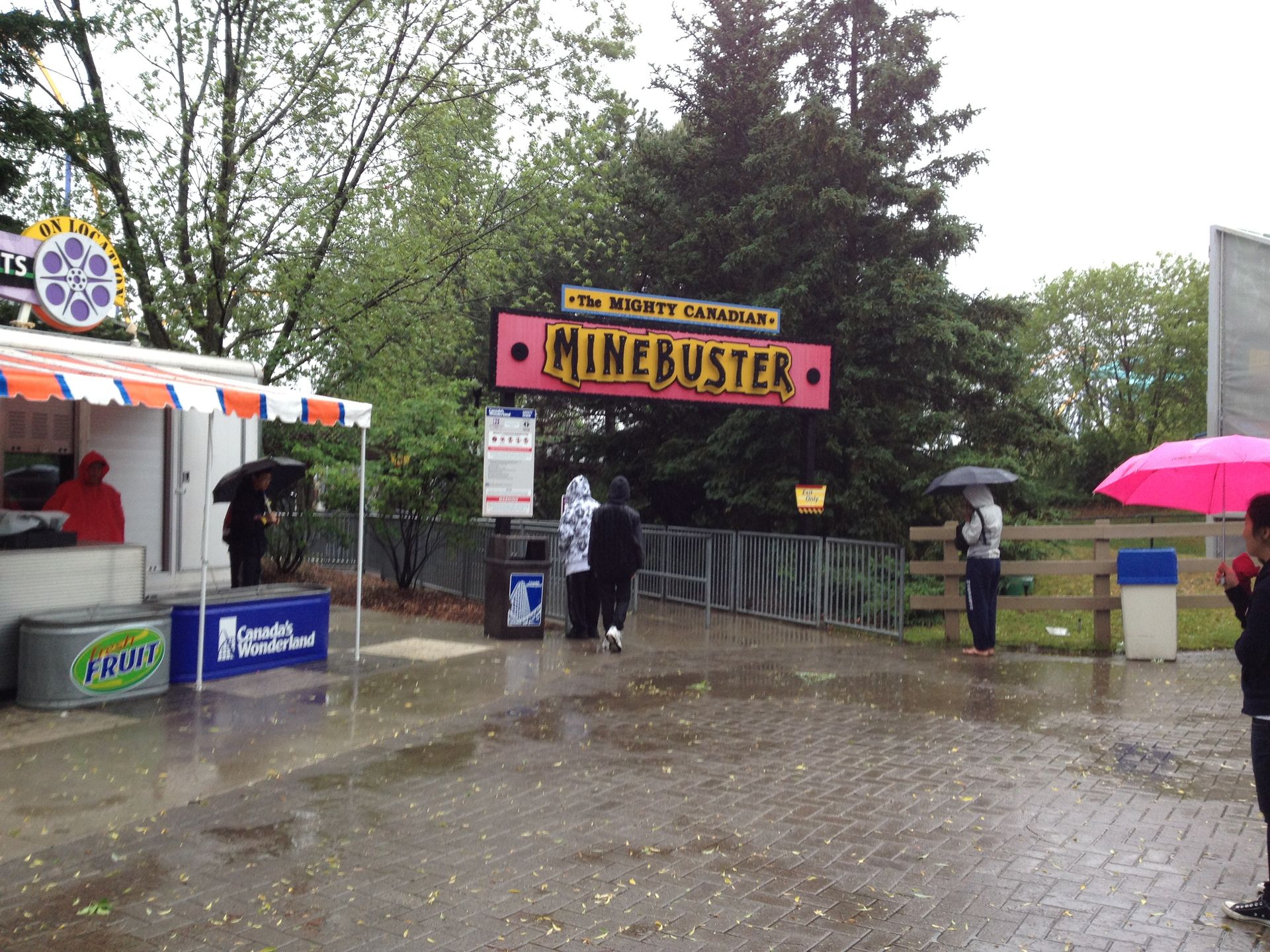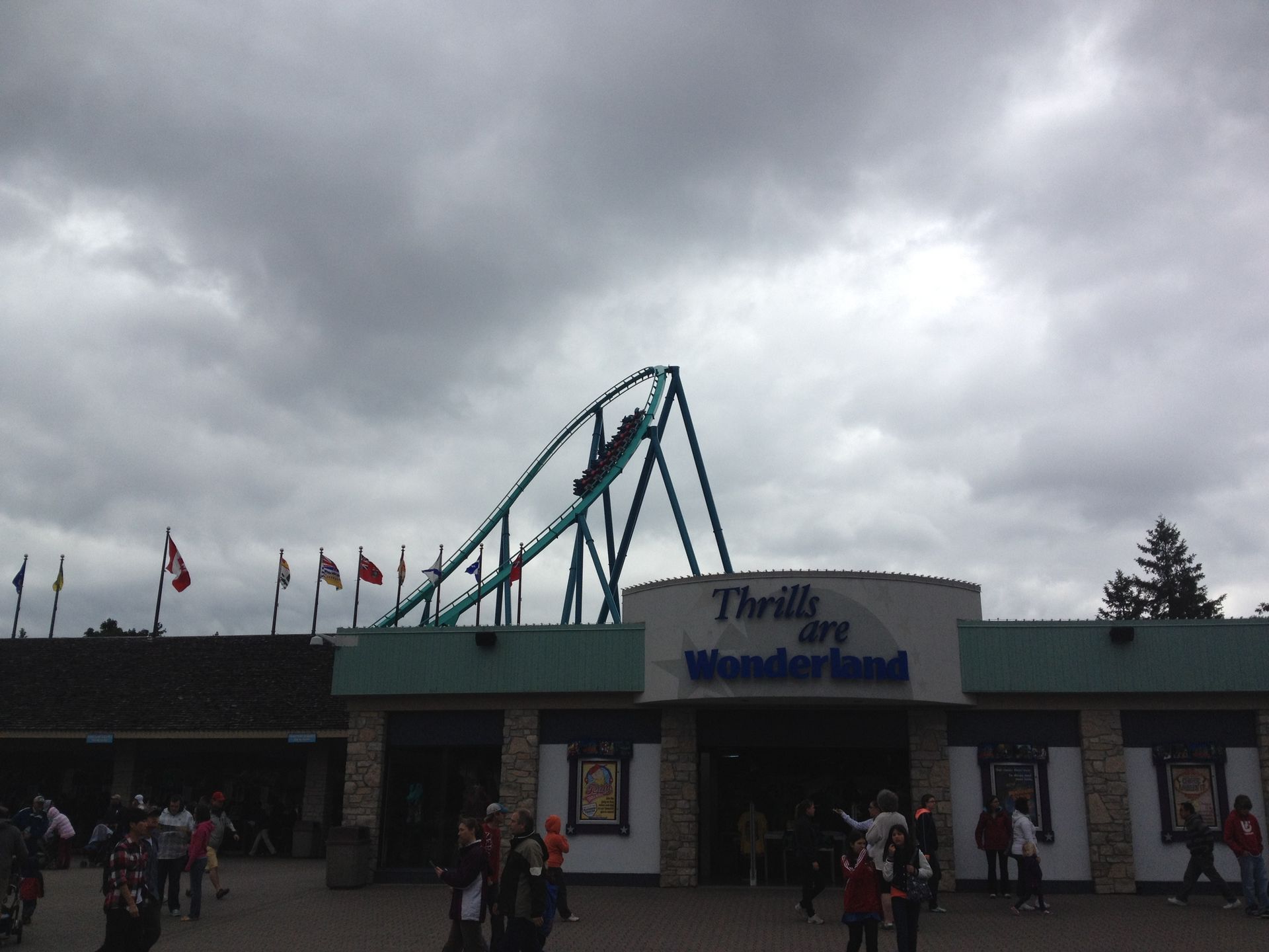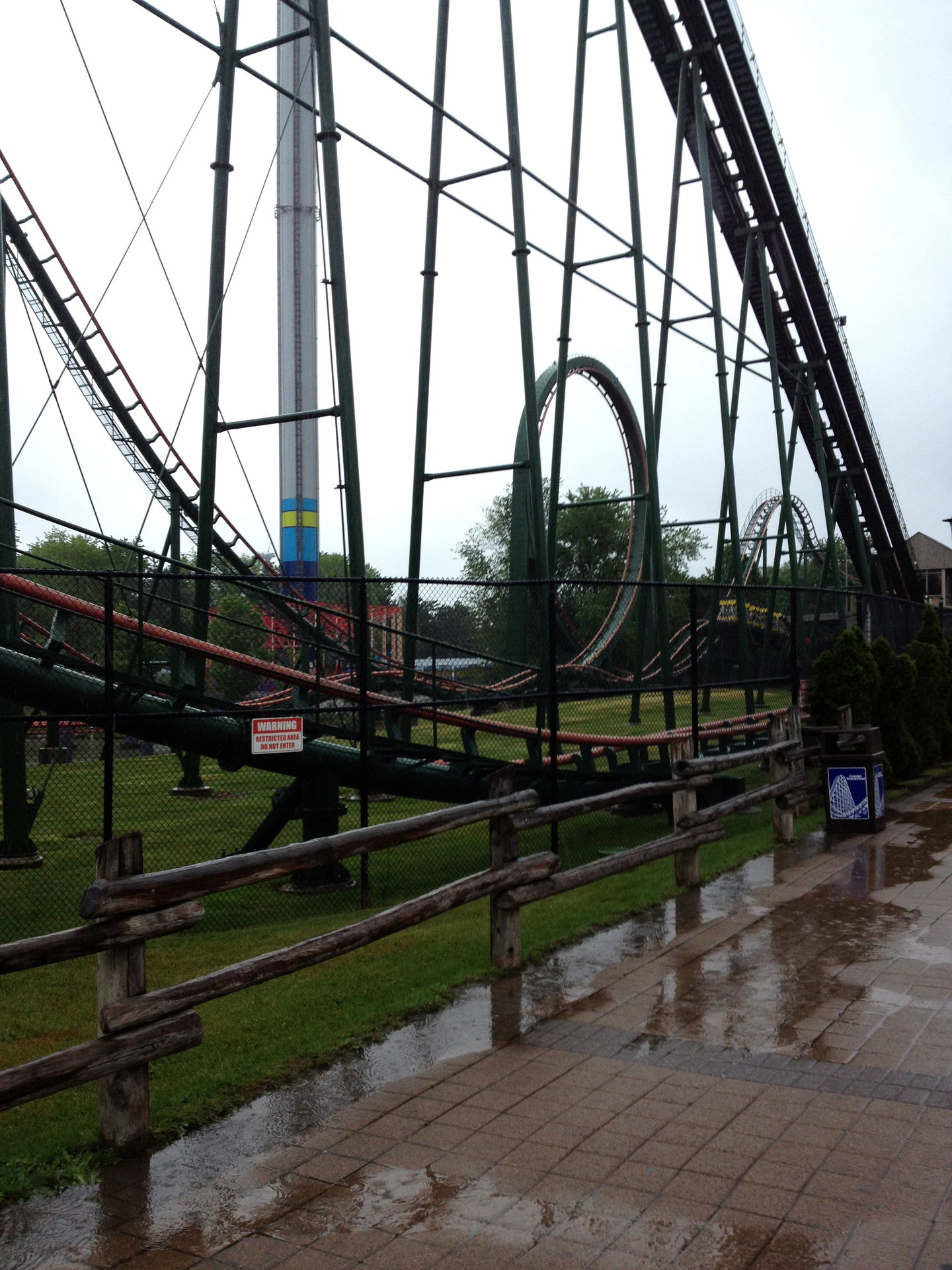 Relativ pünktlich zur Öffnung ging es dann unter strömenden Regen - und daher auch nur mit dem iPhone als fototechnische Unterstützung - hinein ins feuchte Vergnügen. Allerdings kam dann auch schon gleich am Eingang die erste grosse Ernüchterung, denn wir wurden mit einem freundlichen "Leviathan und Windseeker are closed today" empfangen. Gut, Windseeker war uns relativ egal, aber ein geschlossener Leviathan war eine mittlere Katastrophe. Naja, wir dachten uns, da müssen wir halt durch und fahren halt "nur" die anderen 15 Coaster.