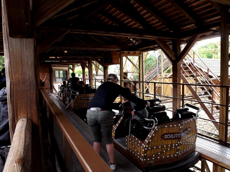 Die erste Fahrt des Tages war ein Powered Coaster und liegt etwas weiter vom Eingang entfernt und wurde noch von (fast) allen gemeinsam bestritten. Bis auf die, die sich zu früh angestellt hatten als alle auf der Toilette waren und bis auf die, die auf einmal am anderen Ender der Schlange hinter uns standen!