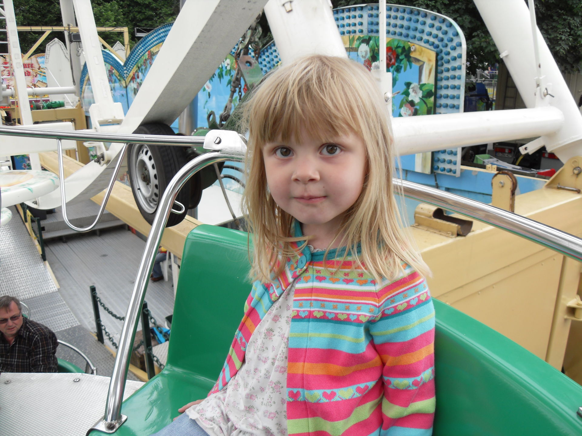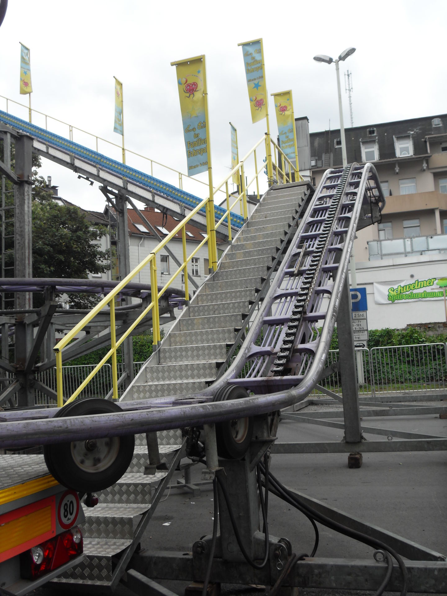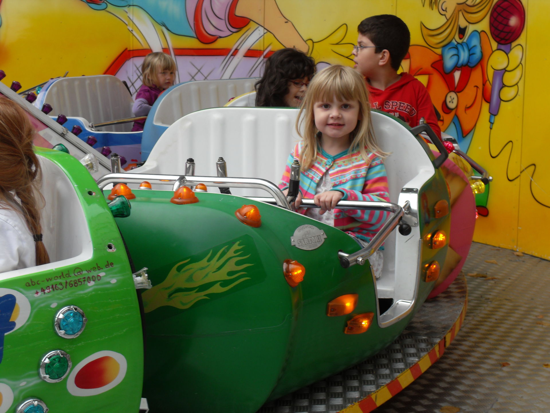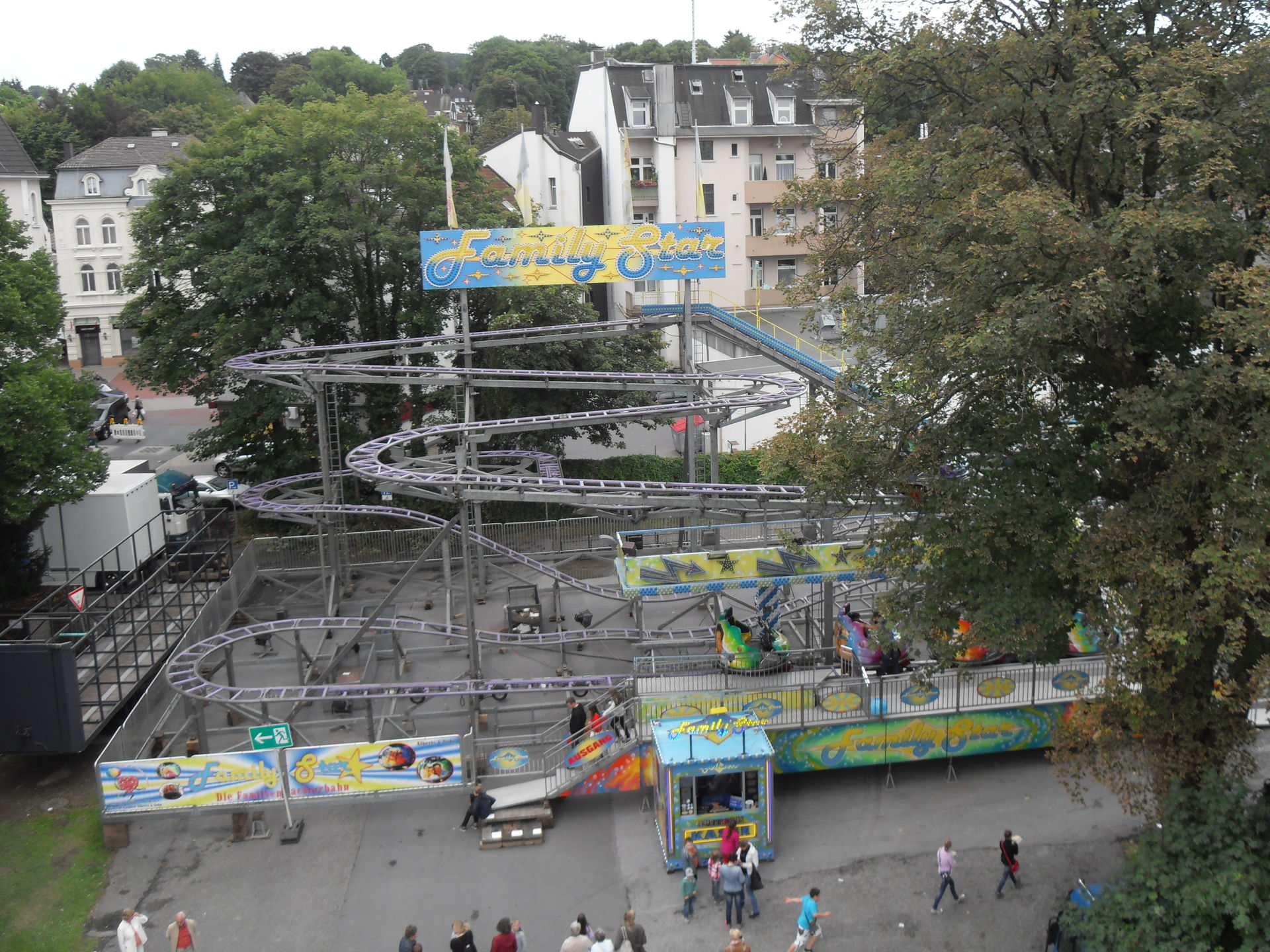 Auf dem letzjährigen Konga Platz gastierte in diesem Jahr der Family Star in Schwelm, eine kleine niedliche Familienachterbahn mit drehenden Gondeln. Nichts spektakuläres und leider auch mit diversen Spaßbremsen versehen aber für Mia genau die richtige Bahn für ihrer allererste Achterbahnfahrt auf der Kirmes. Kinder wie die Zeit vergeht...