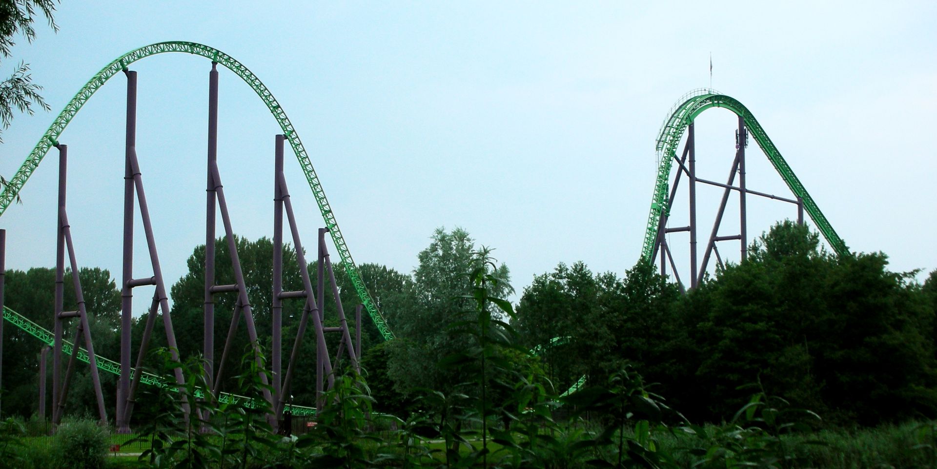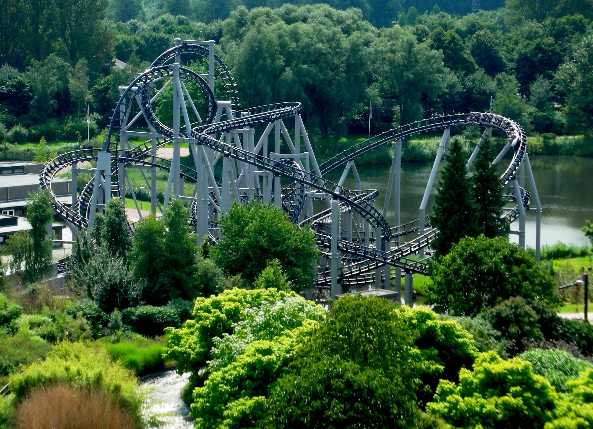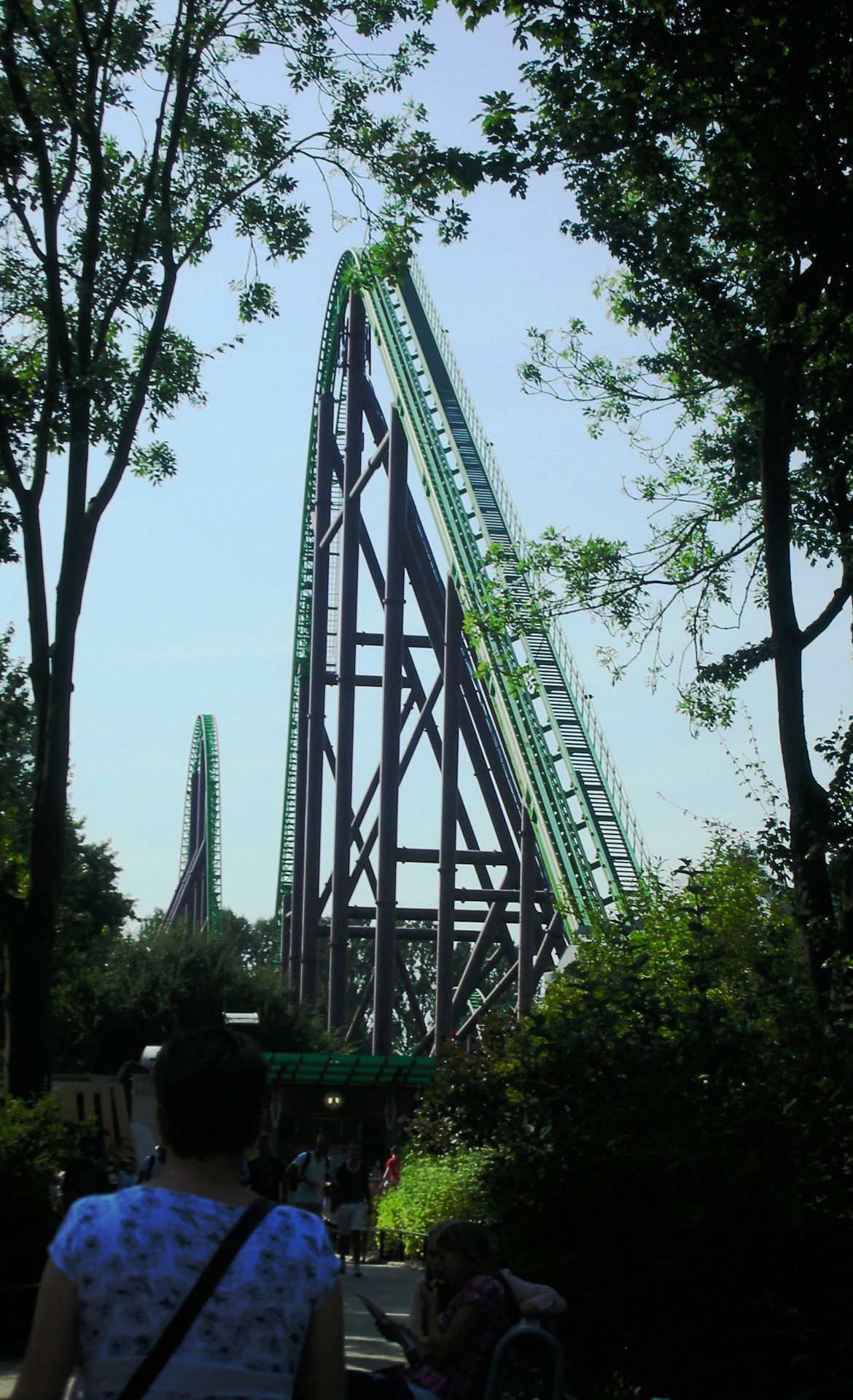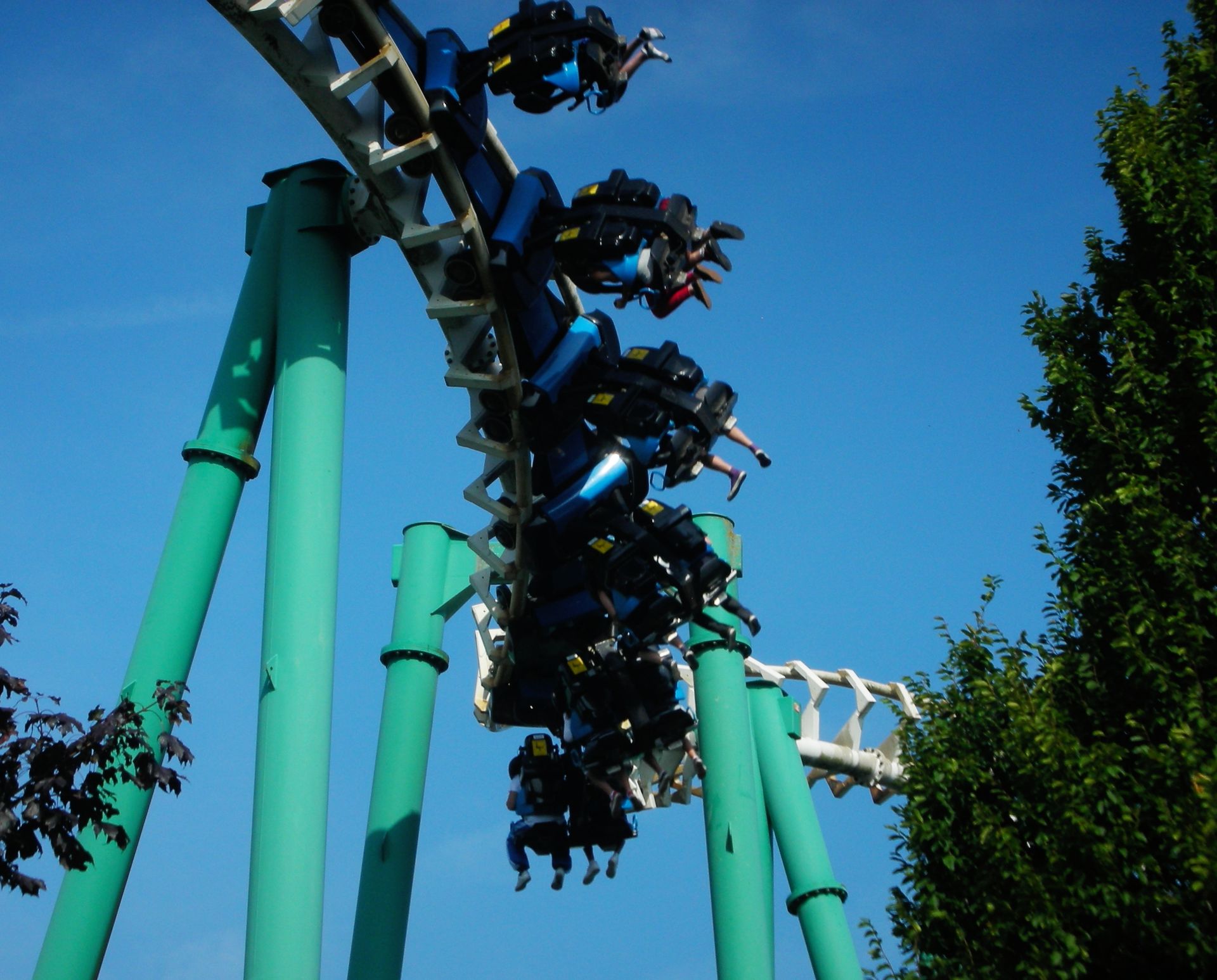 Inversion nach oben und erblickt das Schienenknäuel über dem See aus einer vollkommen neuen Perspektive. In luftiger Höhe schraubt man sich über den Rest des Streckenverlaufs hinweg, ehe man wieder einen waghalsigen Sturz gen Wasser unternimmt. Es folgt die erste Steilkurve, in der zu leichtem Rappeln viel Spaß aufkommt, ehe eine