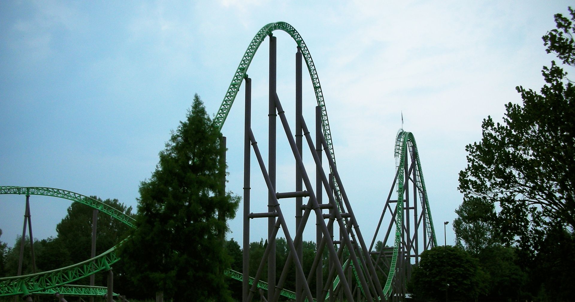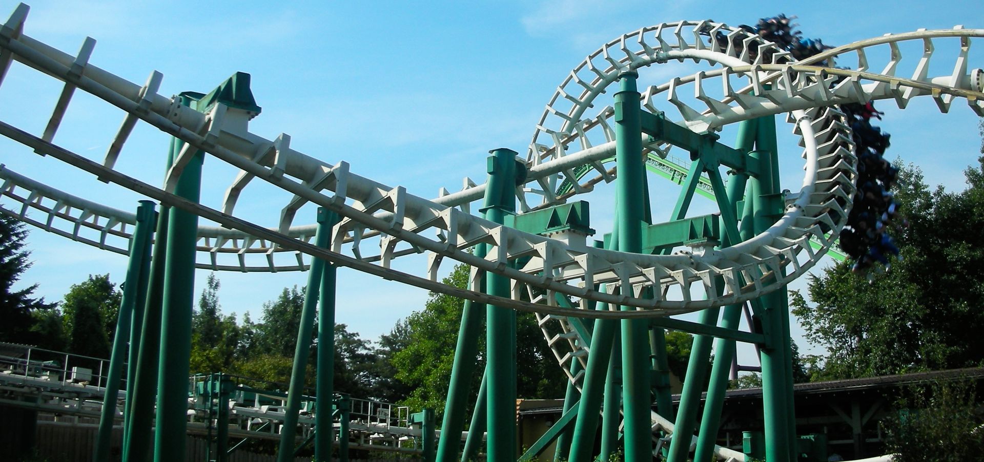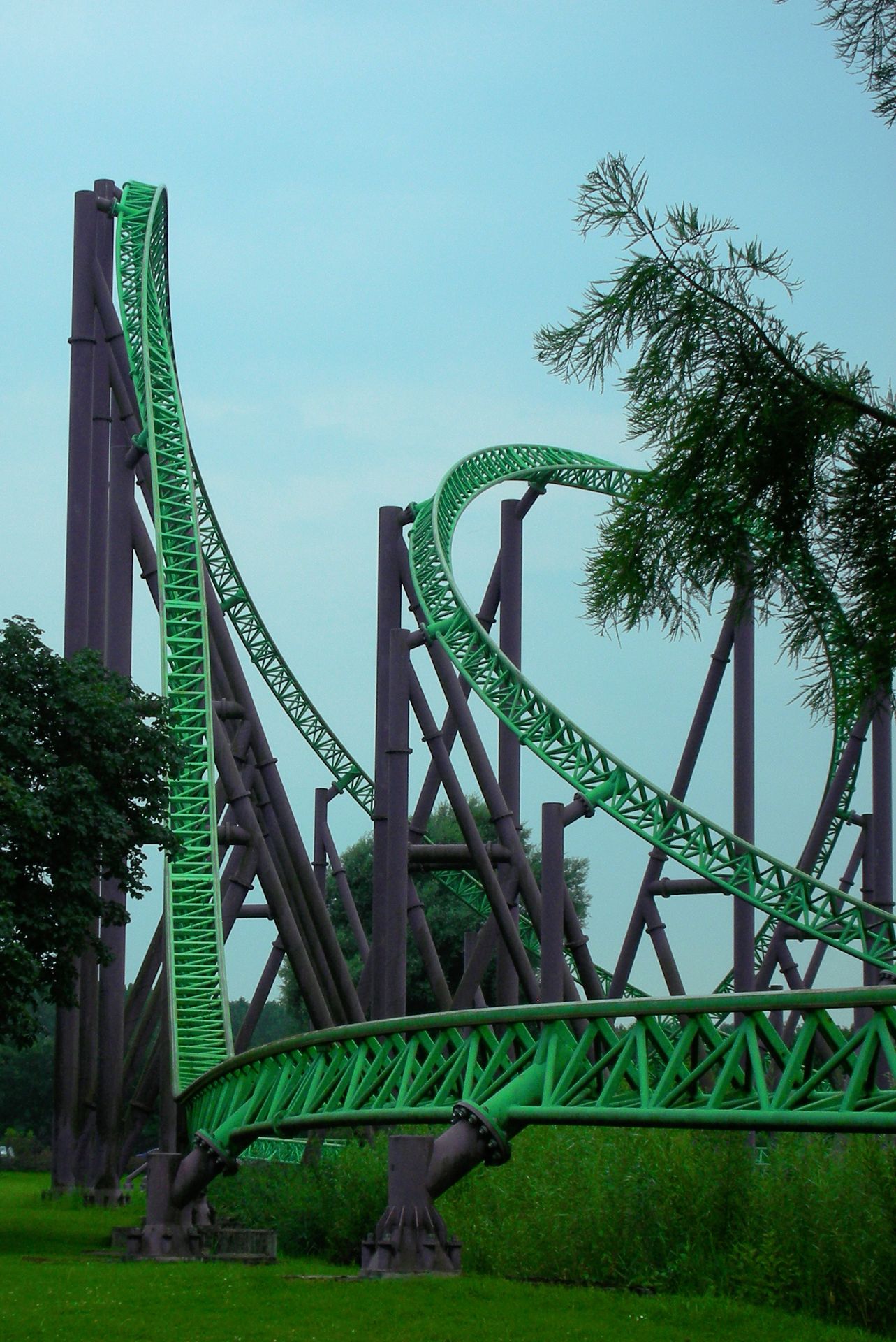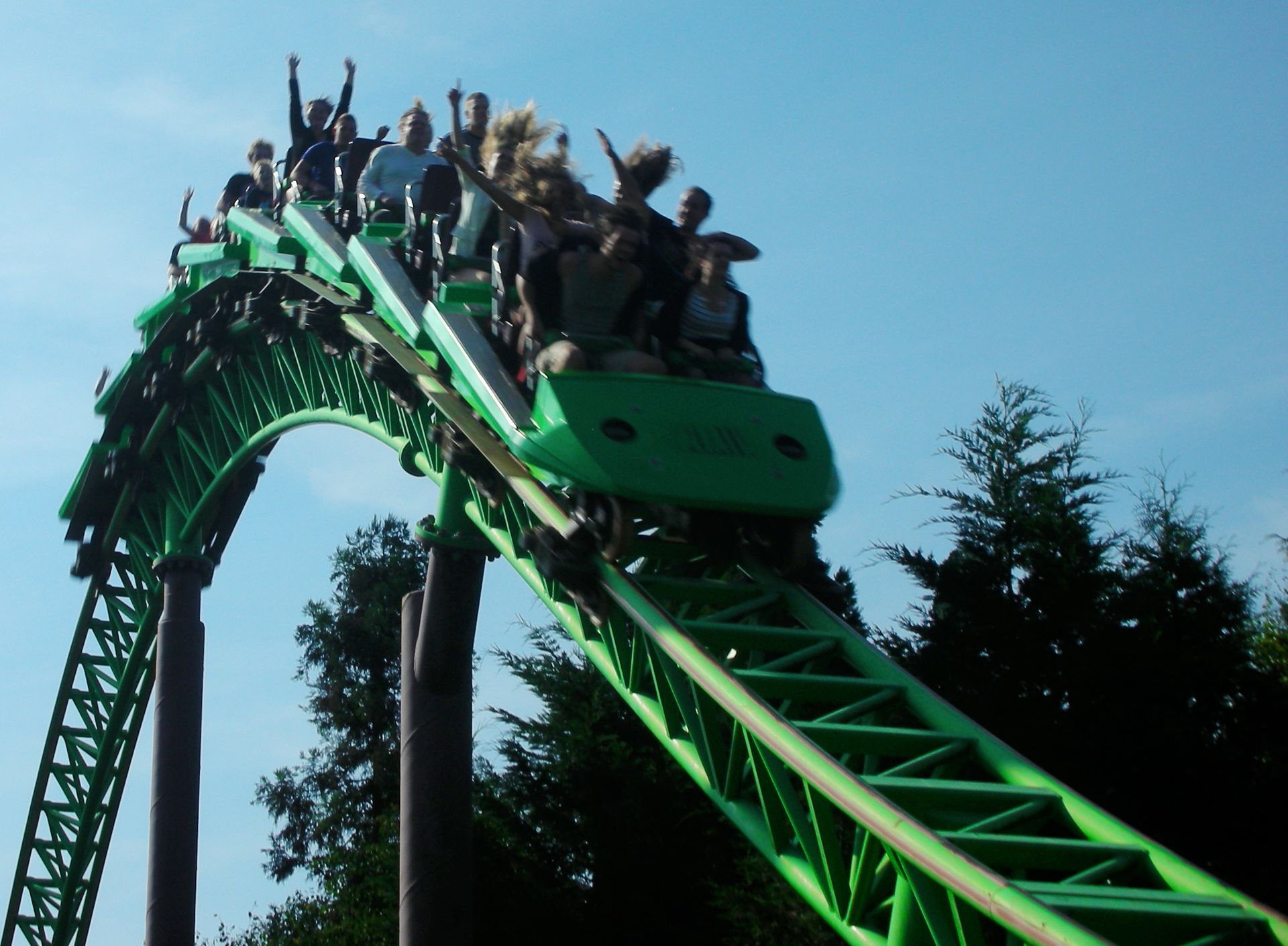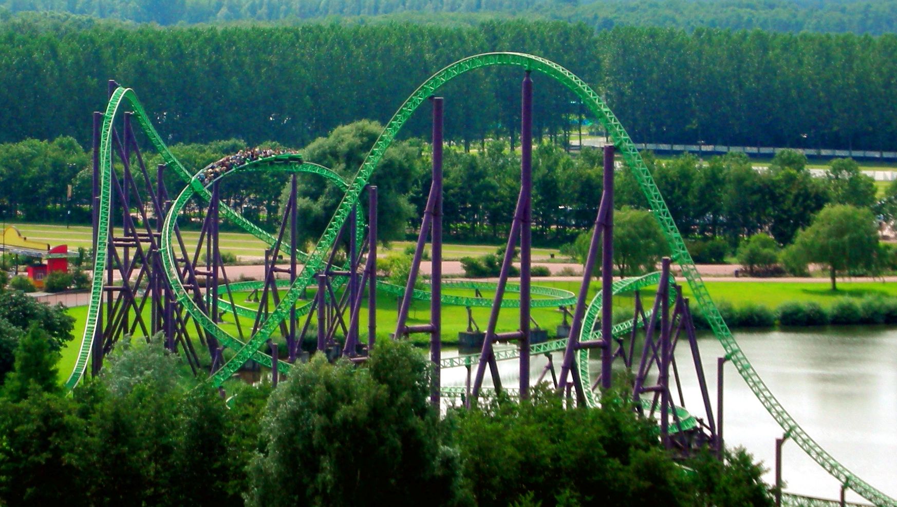 Inversion nach oben und erblickt das Schienenknäuel über dem See aus einer vollkommen neuen Perspektive. In luftiger Höhe schraubt man sich über den Rest des Streckenverlaufs hinweg, ehe man wieder einen waghalsigen Sturz gen Wasser unternimmt. Es folgt die erste Steilkurve, in der zu leichtem Rappeln viel Spaß aufkommt, ehe eine