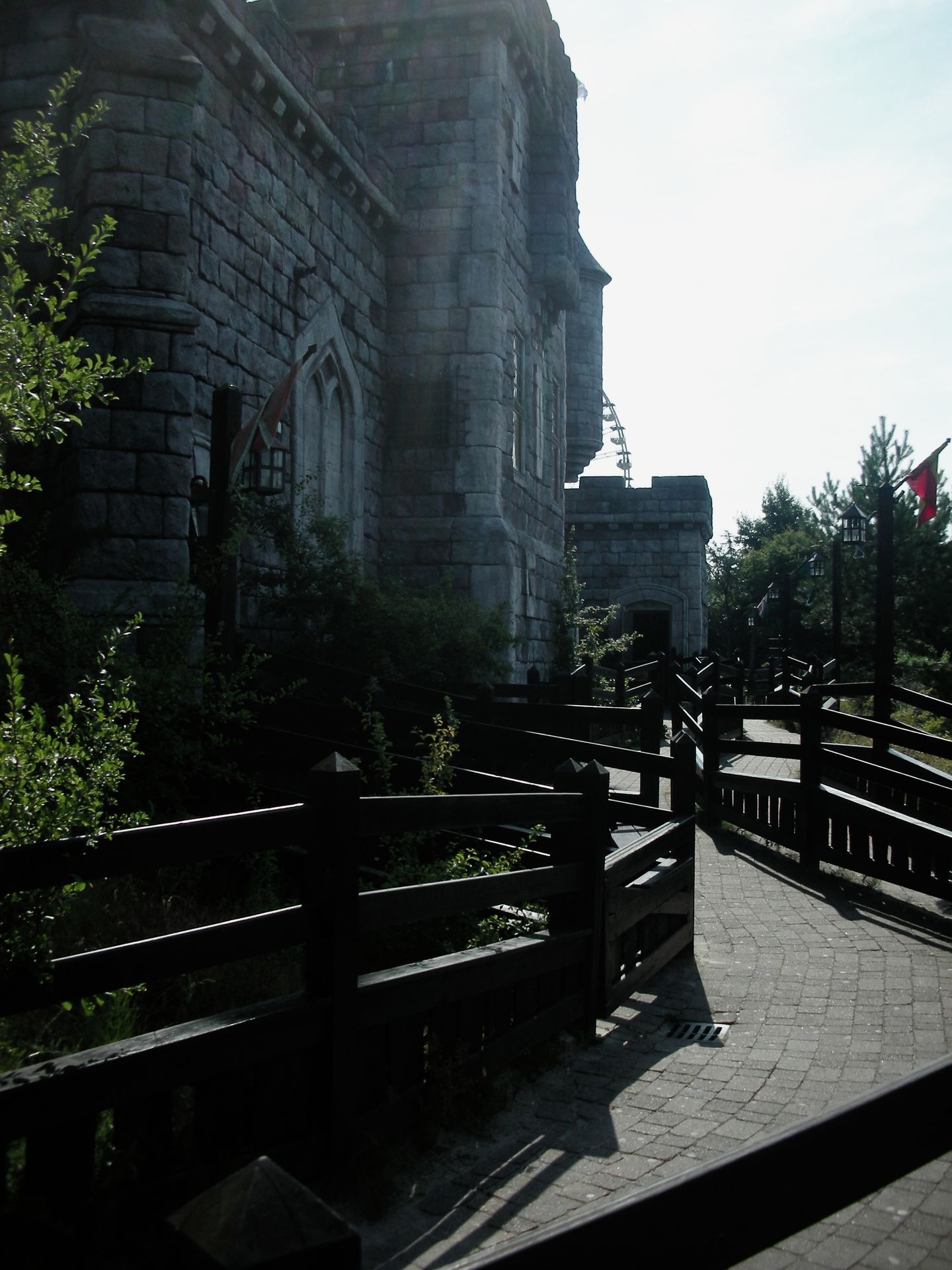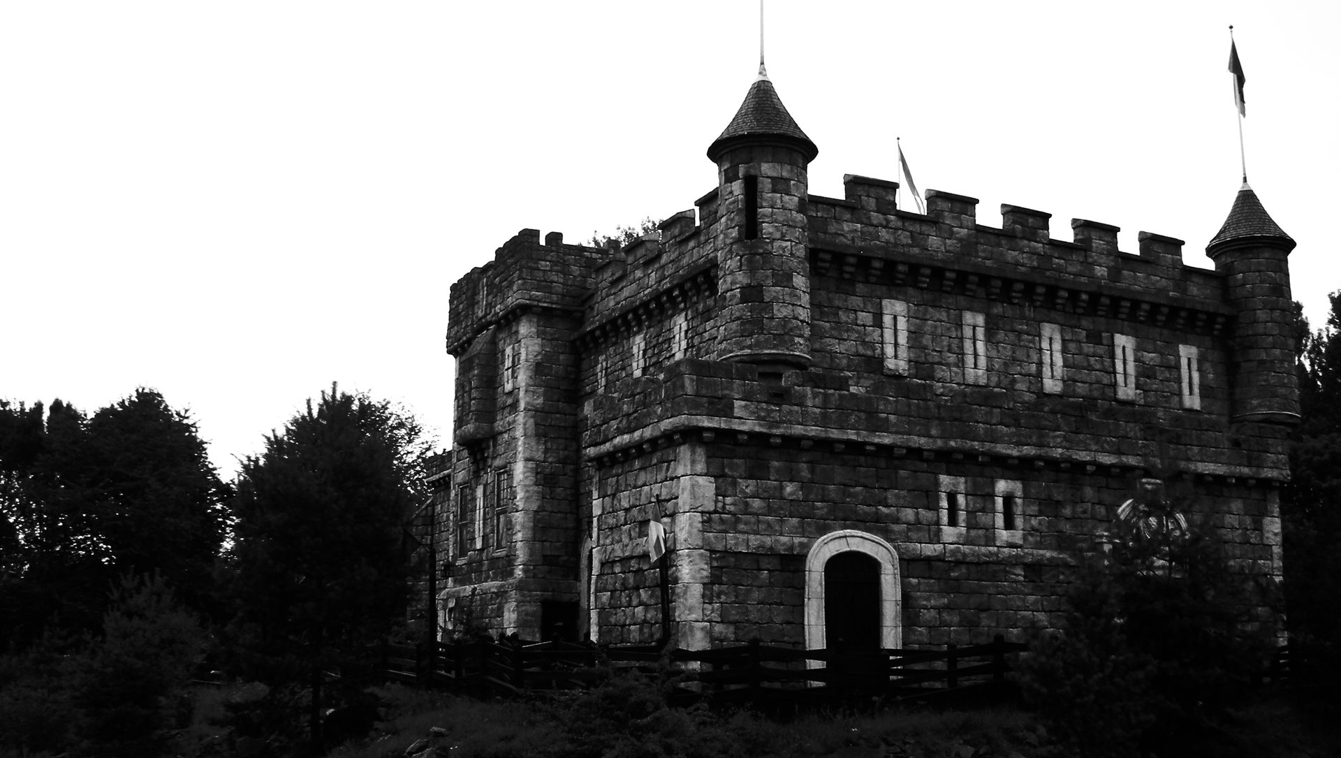 Auf dem Weg zu Goliath haben wir auf dem See bereits eine kleine Burg gesichtet, die uns eines Besuches würdig schien, obwohl wir keine Ahnung hatten, was uns darin erwarten könnte. In RCT2 war an dieser Stelle ein Spukschloss platziert, also rechneten wir mit einem Maze oder einer sehr kleinen Geisterbahn. Nachdem wir einige Zeit zu zweit vor verschlossener Tür verbracht und bereits mit dem Gedanken gespielt haben, wieder umzukehren, gesellte sich endlich eine Handvoll anderer Besucher zu uns.