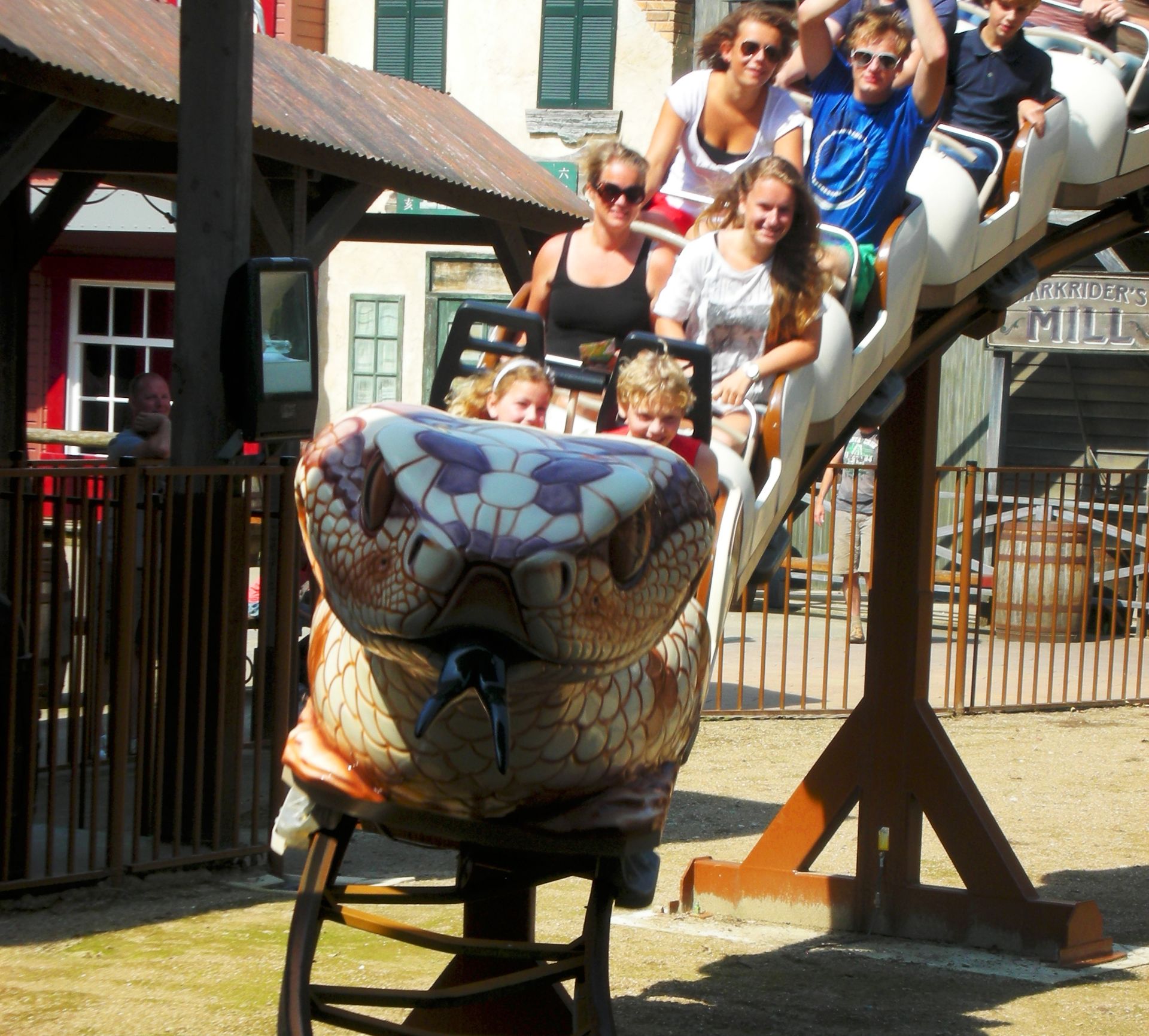Zierer werden. Auf dem Weg dorthin passierten wir das 5D-Kino, welches uns wärmstens ans Herz gelegt wurde. Leider missglückten uns im Laufe des Tages beide Versuche, einen Platz im Club Psyke zu ergattern, sodass wir diese Erfahrung nicht machen konnten. Rattlesnake sollte da keine Entschädigung sein, sondern eher ein Beispiel, wie man es nicht macht. Die Fahrt mag für Kinder durchaus ansprechend sein und mit ein wenig Fantasie hat man als eingefleischter Coasterfan auch den ein oder anderen Moment auf ihr, jedoch fällt die Bahn keineswegs unter die Kategorie Augenschmaus. Brauntöne treffen auf Brauntöne und in der Mitte des ganzen steht eine Lokomotive in ... Braun. Wenn man sich die Zeit nimmt und auf rcdb die drei alten Versionen dieser Anlage unter die Lupe nimmt, bleibt einem nur noch eine Frage: Warum?